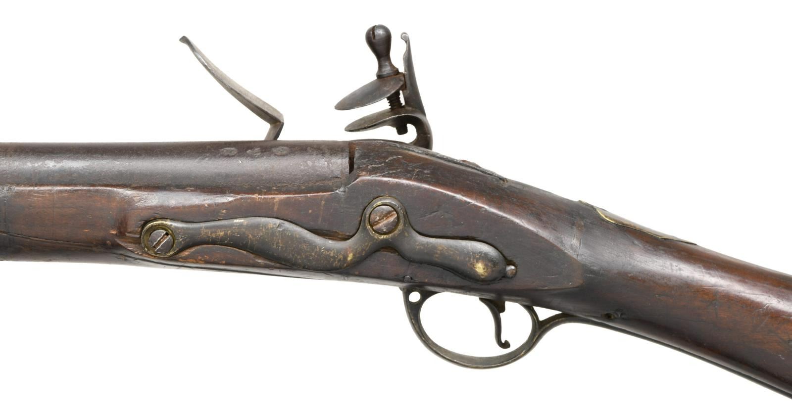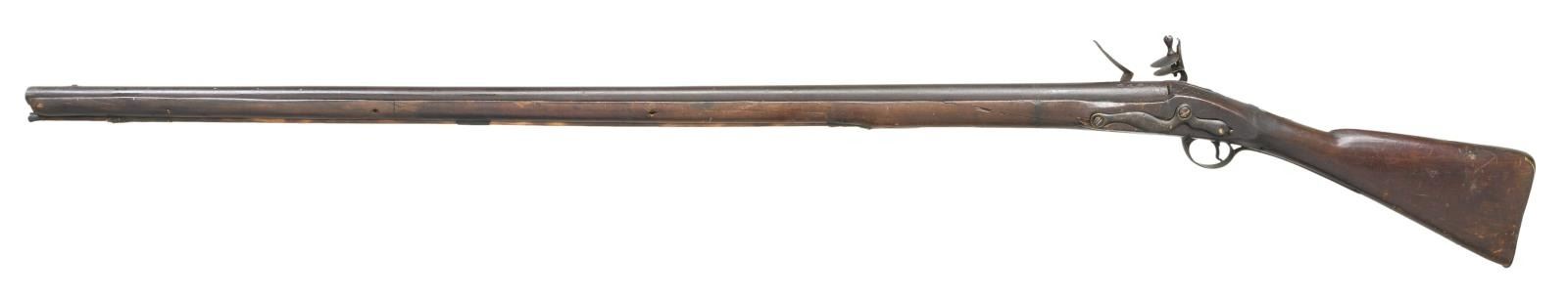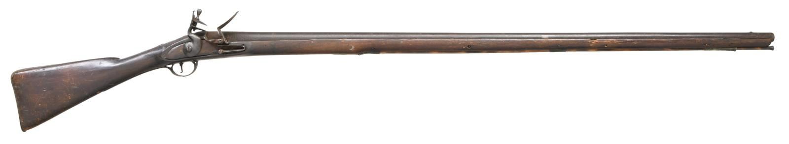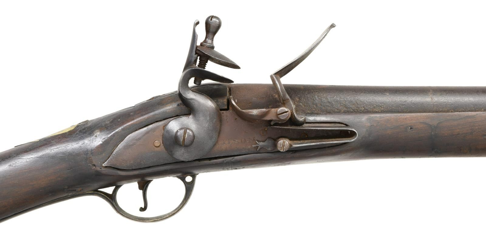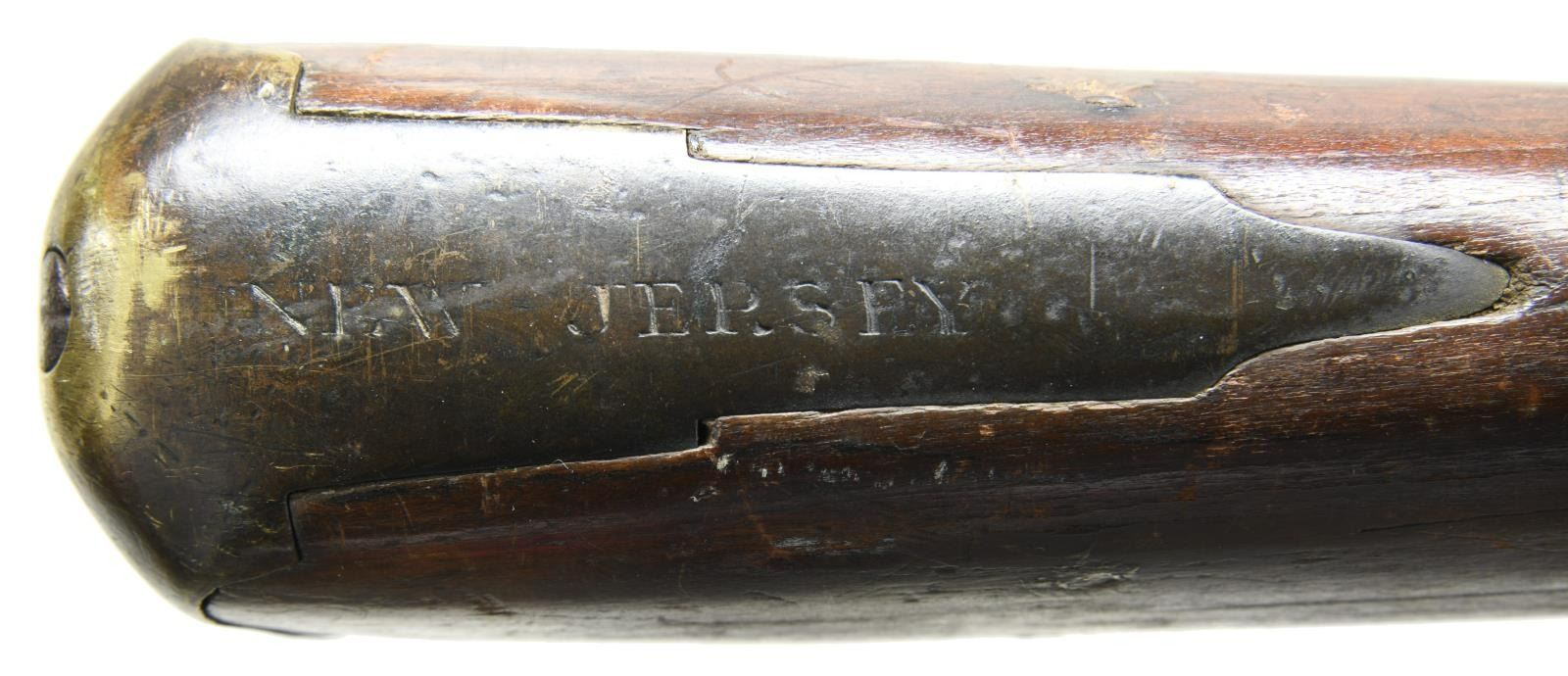 MUSKET MADE BY WILSON. Cal. 72. NSN. Bbl. 45 1/4". We believe this musket is a reconversion; however, it is still primarily a Revolutionary War musket from New Jersey. The barrel has a rectangular sight 2" from the muzzle. There are 3 proofs on the left side of the gun near the bolster. They appear to be oval proofs with a crowned "RW". The top of the barrel is lightly marked "LONDON". The lock is boldly marked "WILSON" under the pan. There is a brass trigger guard with a long tail but no front appendage. The brass butt plate is engraved on the top "NEW JERSEY". There is a brass wrist escutcheon that appears to read "0/8/". Brass, rounded side plate with brass ramrod thimbles & entry thimble. The brass-tipped ramrod appears to be a replacement. The full-length stock is an American period replacement and runs to within 1/4" of the muzzle. CONDITION: barrel has a dark overall patina, as does the lock. The lock does hold one cocking position but needs adjustment. The "New Jersey" marks on the butt plate are quite clear, and the rack numbers on the escutcheon are easily read. The stock has 2 tight cracks running from the trigger guard toward the barrel channel. There are minor losses around the barrel channel and there is a repair near the muzzle. There also appear to be repairs & fill near and around the lock mortis. Fair to poor bore. (01-24040/BF). ANTIQUE. $4,000-6,000.