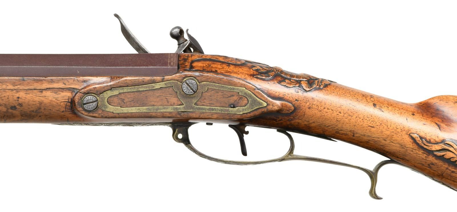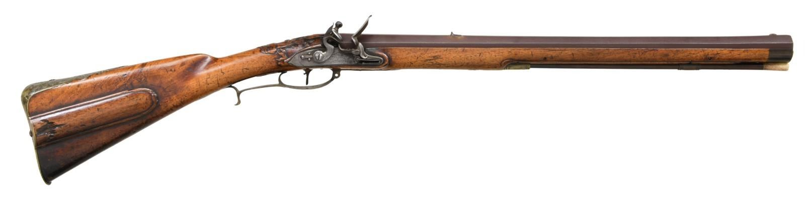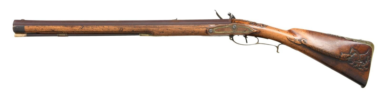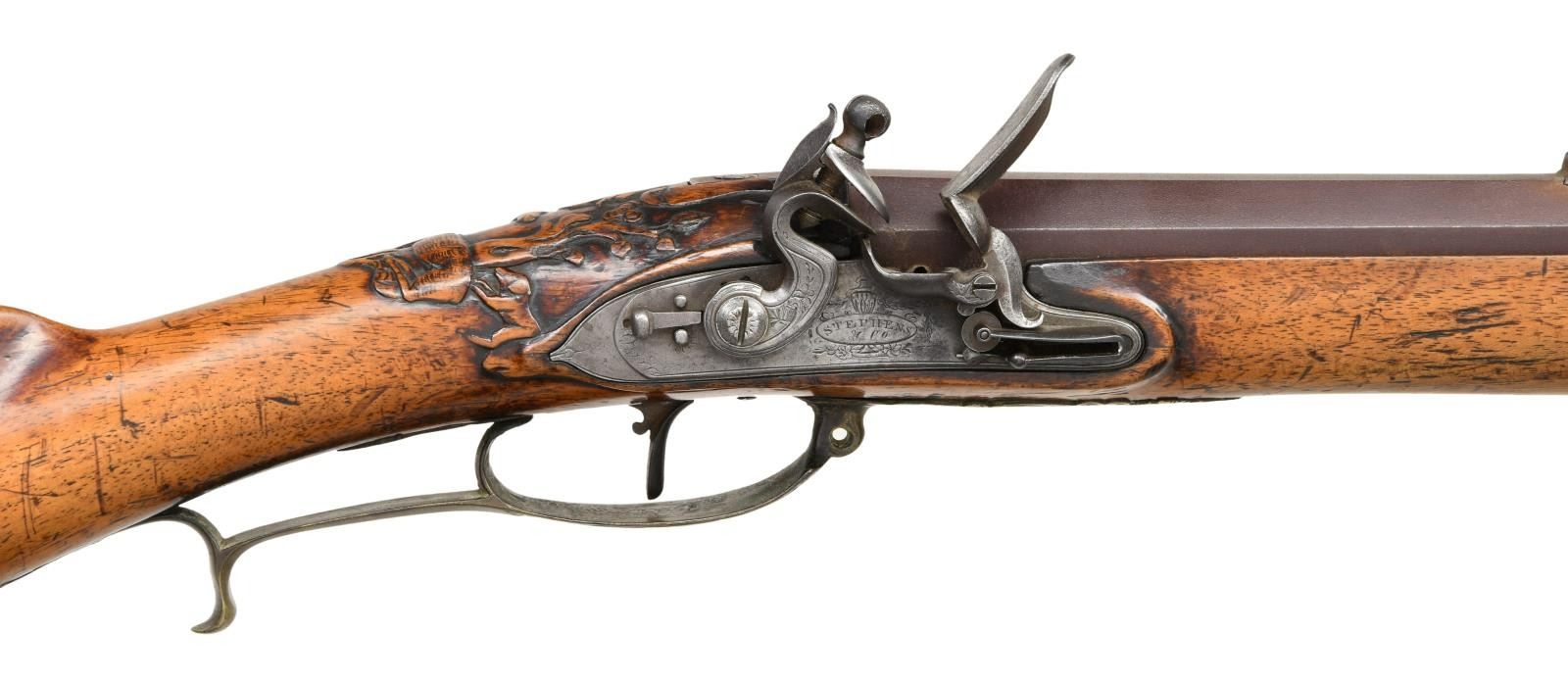 Cal. 52. NSN. Bbl. 23" oct. Brass blade front sight. Fixed rear sight. Lock is marked "STEPHENS & CO". Jaeger carbine made in Hanover & assembled in England w/ British lock. These style Jaeger rifles were used in the Seven Years War & by Hessian troops in the American Revolution. Hardwood stock w/ brass fittings & patchbox w/ relief carved sliding cover. Top of wrist has carved deer scene. Cheekpiece & left rear of butt have serpent attacking game scene. Brass buttplate, pipe & trigger guard assembly have floral engraving. Bottom of trigger guard also has deer scene engraving. Horn tipped hardwood ramrod that is likely a replacement, CONDITION: stock has added finish w/ a large gouge on rear of patchbox & some chipping. Stock otherwise has a long 8 1/2" repaired crack ahead of sideplate, some dings, chips & handling wear. Brass parts are a dull yellow patina w/ scattered oxidation. Lock remains partially bright as cleaned w/ some pitting, oxidation & areas turning gray. Bbl. is a gray patina w/ scattered oxidation. Bore shows oxidation but evident rifling. PROVENANCE: From the Collection of James B. Taylor. (01-23867/MJC). ANTIQUE. $2000-3000.