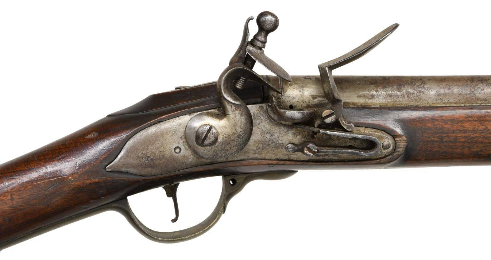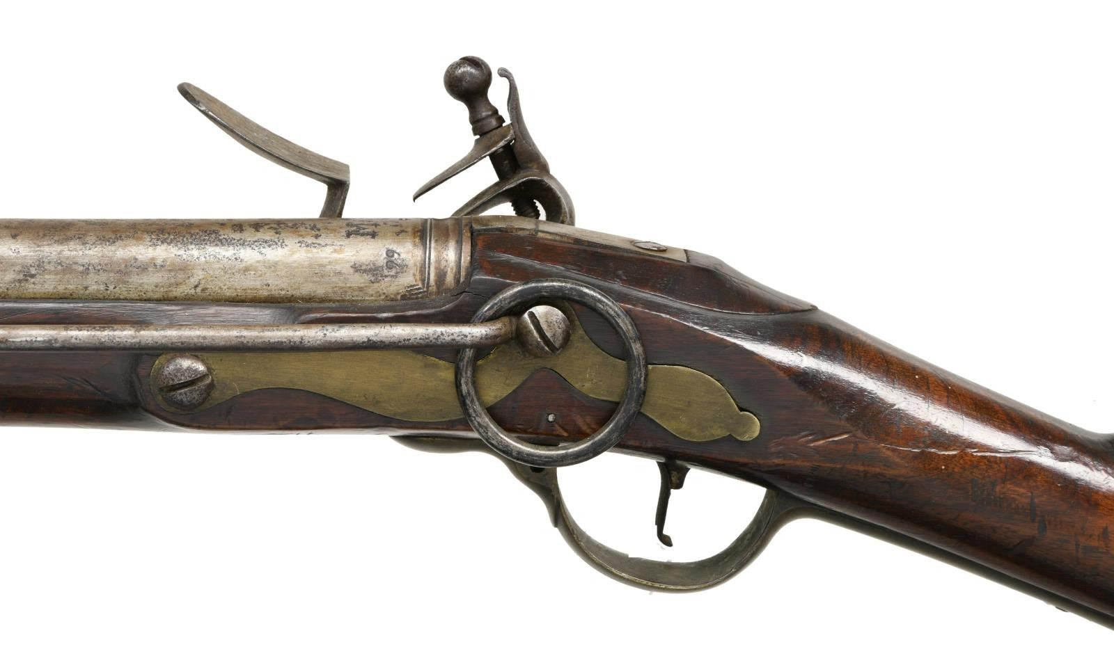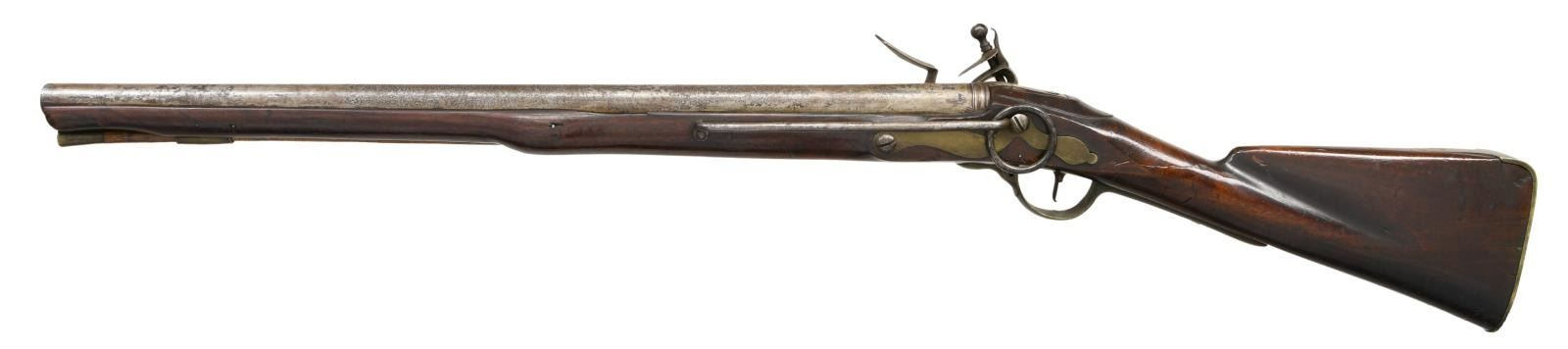 Cal. 76. NSN. Bbl. 26 1/2". Round barrel with a large "M G" stamped at the ringed breech, along with worn proof marks and the number "99" stamped on the left side of the breech. Plain unmarked lock. Brass trigger guard with rounded finial. Brass butt plate of the Naval style. Brass side plate with attached 9" saddle ring bar. Brass tipped wooden ramrod with a single brass ramrod thimble. Full-length stock has a deeply stamped crowned "GR" on the right face. CONDITION: barrel has a medium gray, lightly pitted patina. The lock & other iron parts have a medium gray patina. The brass has a deep, dark mustard patina. The wood shows superficial dents & dings with no major damage. Good bore. (01-24103/BF). ANTIQUE. $2,500-3,500.