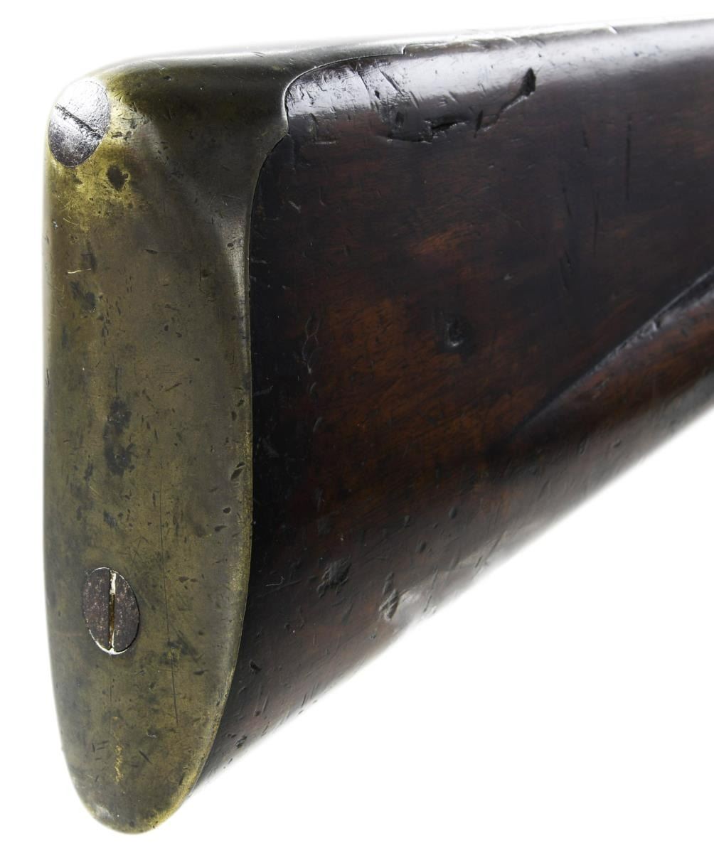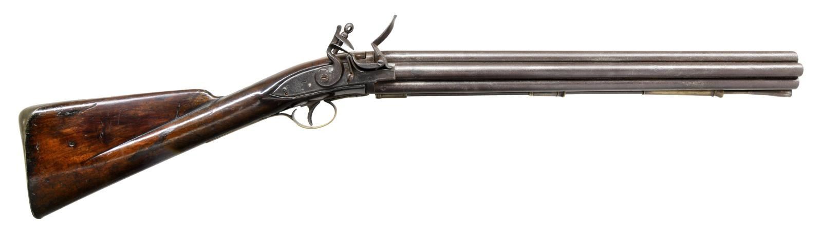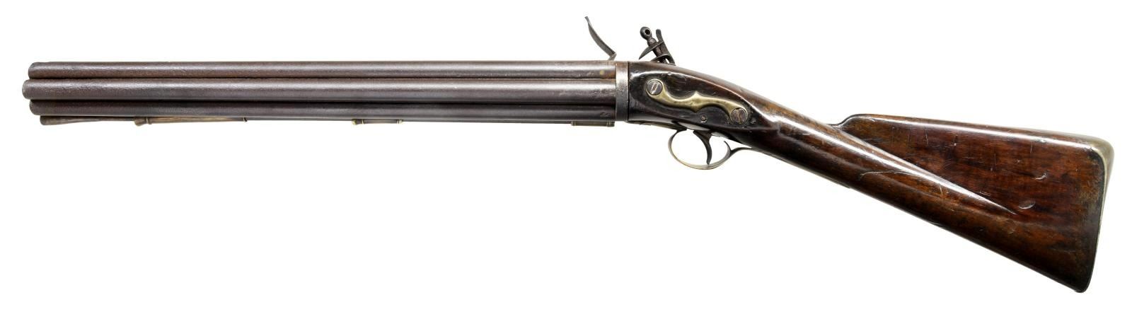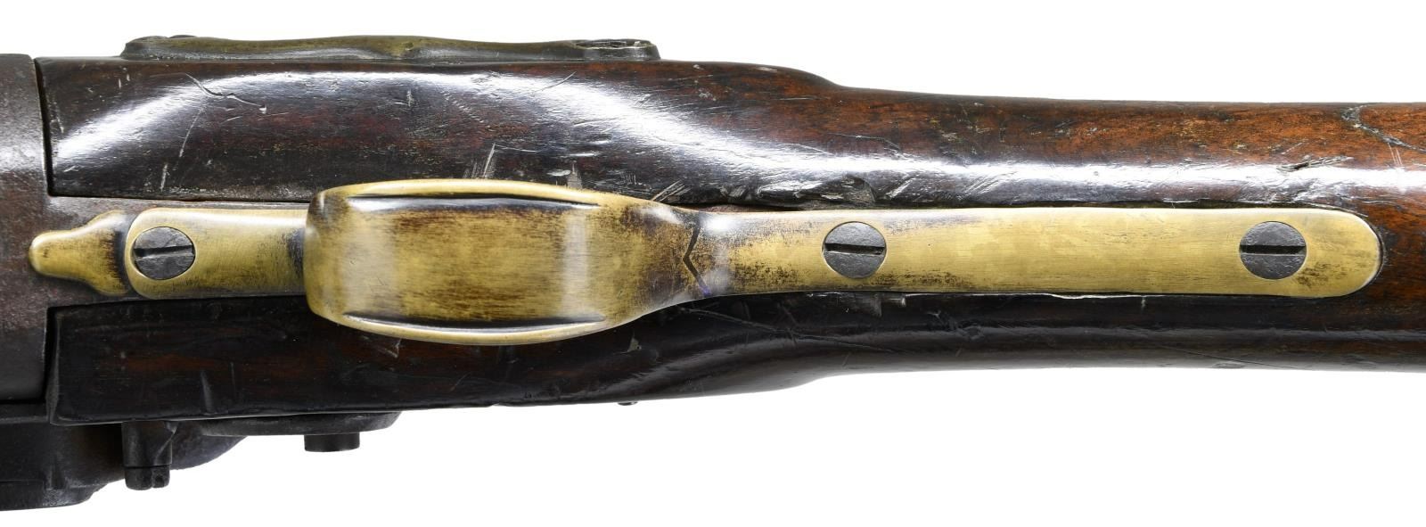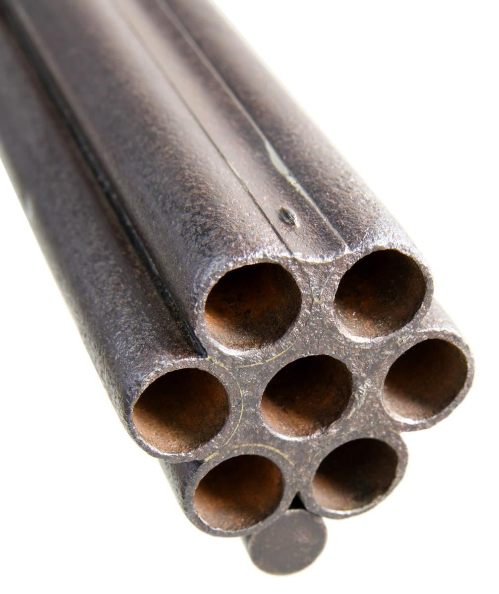 BARREL FLINTLOCK VOLLEY GUN. Cal. 52. NSN. The highly regarded Henry Nock had a government contract for 500 of these unusual guns which were originally designed by British engineer James Wilson. The guns were mostly used by the Navy, intended to be fired down into groups of enemy seamen from high in the ships rigging. Those tasked with firing these weapons were not happy with the extreme recoil produced by the simultaneous discharge of seven barrels. A lighter version was produced and given the designation of pattern 1788. A little over 100 of these were produced. Both patterns were removed from service in 1804, but some remained in ship stores with continued use through the war of 1812. A few others were produced for commercial sales. The estimated total production of all types is 650 guns. This gun of standard 1780 form has 20" smooth bore barrel cluster. Each barrel has Tower military proof at breech end. A trumpet head steel ramrod is held by three heavy beaded pipes on bottom of cluster. Back spring lock with beveled plate is fitted with serpentine cock, bridled friction frizzen and "L" shaped feather spring which fits along bottom of pan. Rear of lockplate is stamped with British crown over the initials "GR". "TOWER" is engraved at top edge behind cock and British broad arrow acceptance mark is at bottom front of lockplate. Interior of lock is stamped "HN" (Henry Nock) and with the numeral "9" or "6". Robust handrail buttstock of plain European walnut is brass mounted. Furniture is unique to this model with scrolled raised sideplate, trigger guard with small finial, and heavy buttplate. CONDITION: good. Metal parts showing cleaned brown patina with heavy pitting on barrels and some light pitting on lock as would be expected from use in marine environments. Brass is nicely toned and shows considerable wear. Stock with old oil refinish has some repairs noted with replaced wood around top tang and a stress crack at left rear of grip. Bores are pitted. Lock is good. Cock and screw most likely replacements as cock has line border engraving and is too short. (01-23331/MGM). ANTIQUE. $30,000-40,000.