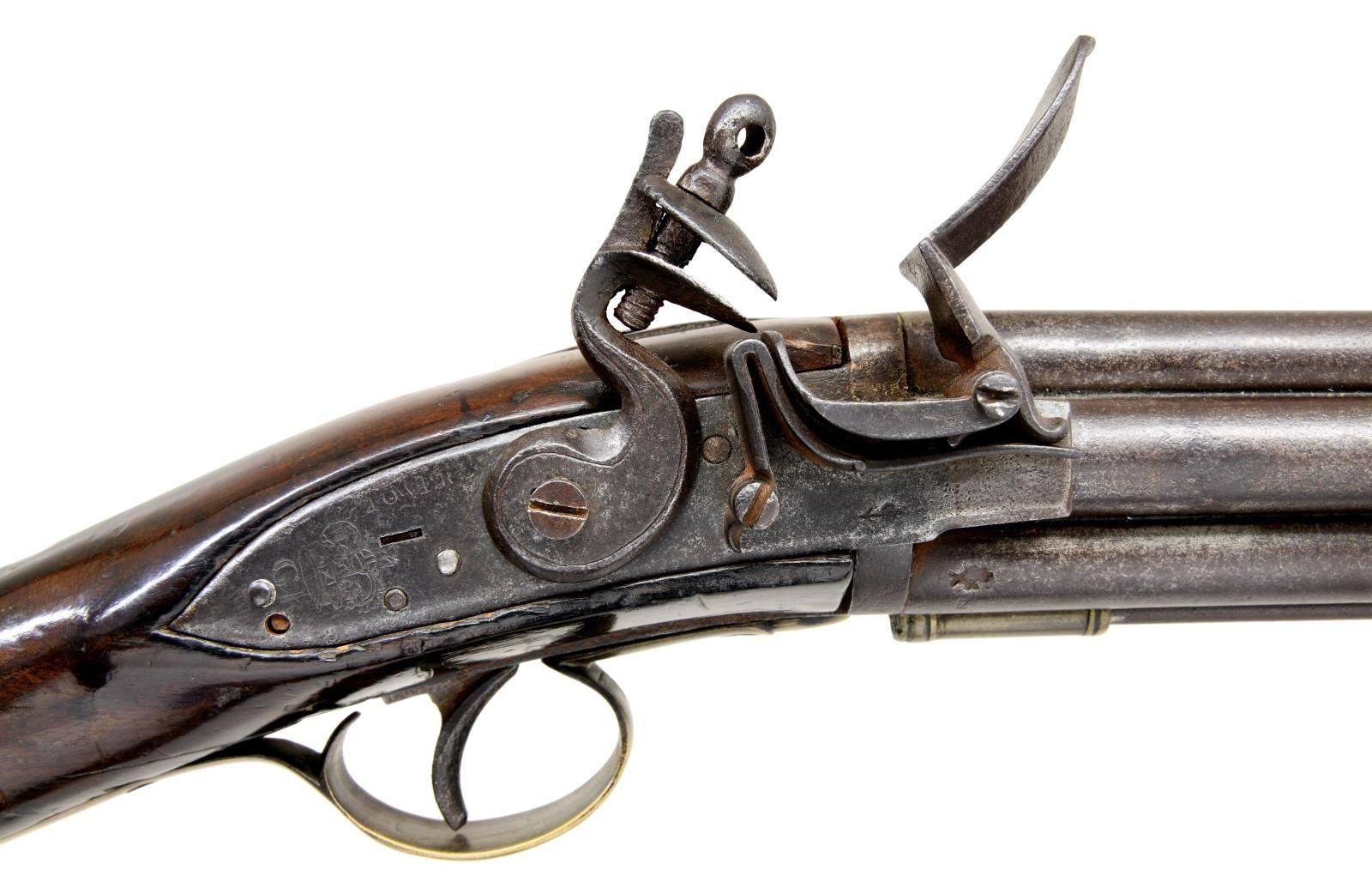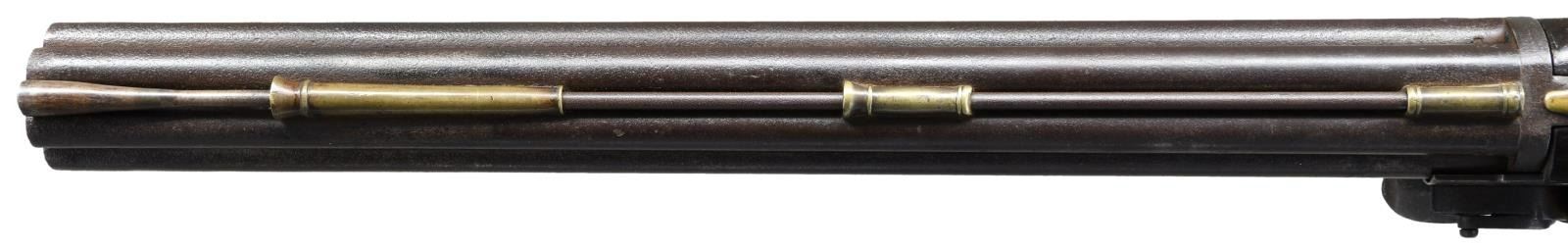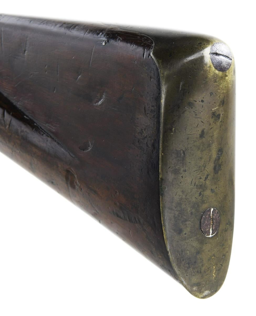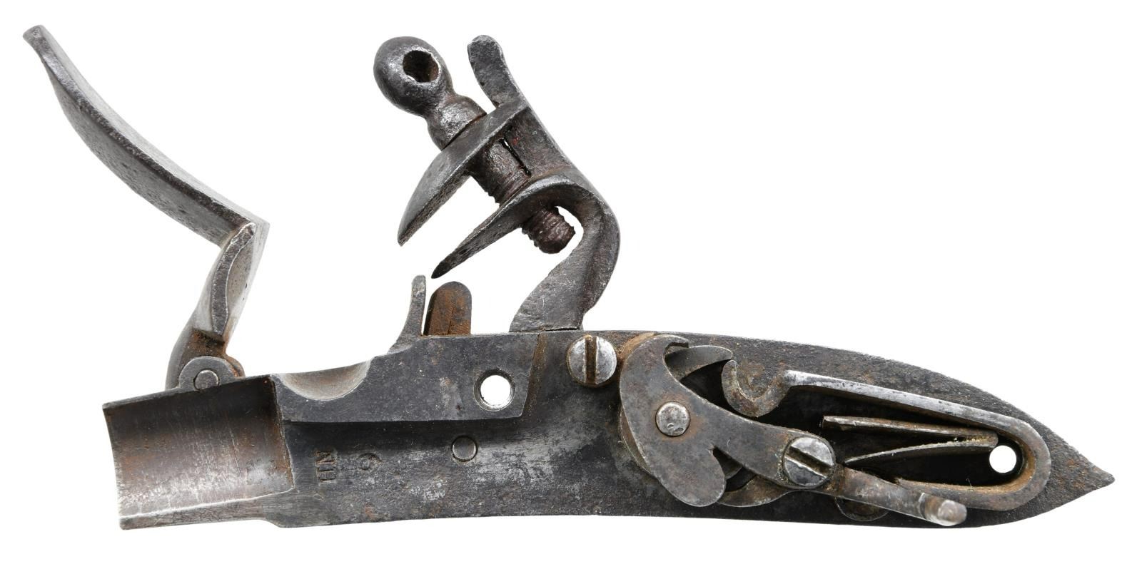BARREL FLINTLOCK VOLLEY GUN. Cal. 52. NSN. The highly regarded Henry Nock had a government contract for 500 of these unusual guns which were originally designed by British engineer James Wilson. The guns were mostly used by the Navy, intended to be fired down into groups of enemy seamen from high in the ships rigging. Those tasked with firing these weapons were not happy with the extreme recoil produced by the simultaneous discharge of seven barrels. A lighter version was produced and given the designation of pattern 1788. A little over 100 of these were produced. Both patterns were removed from service in 1804, but some remained in ship stores with continued use through the war of 1812. A few others were produced for commercial sales. The estimated total production of all types is 650 guns. This gun of standard 1780 form has 20" smooth bore barrel cluster. Each barrel has Tower military proof at breech end. A trumpet head steel ramrod is held by three heavy beaded pipes on bottom of cluster. Back spring lock with beveled plate is fitted with serpentine cock, bridled friction frizzen and "L" shaped feather spring which fits along bottom of pan. Rear of lockplate is stamped with British crown over the initials "GR". "TOWER" is engraved at top edge behind cock and British broad arrow acceptance mark is at bottom front of lockplate. Interior of lock is stamped "HN" (Henry Nock) and with the numeral "9" or "6". Robust handrail buttstock of plain European walnut is brass mounted. Furniture is unique to this model with scrolled raised sideplate, trigger guard with small finial, and heavy buttplate. CONDITION: good. Metal parts showing cleaned brown patina with heavy pitting on barrels and some light pitting on lock as would be expected from use in marine environments. Brass is nicely toned and shows considerable wear. Stock with old oil refinish has some repairs noted with replaced wood around top tang and a stress crack at left rear of grip. Bores are pitted. Lock is good. Cock and screw most likely replacements as cock has line border engraving and is too short. (01-23331/MGM). ANTIQUE. $30,000-40,000.