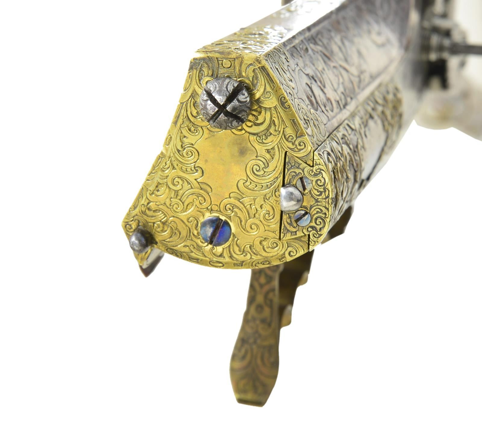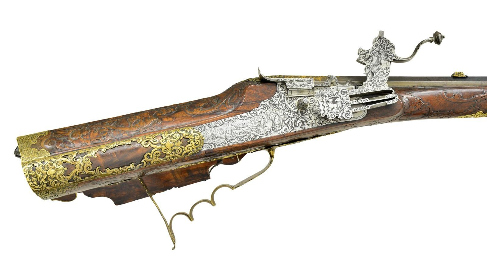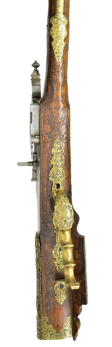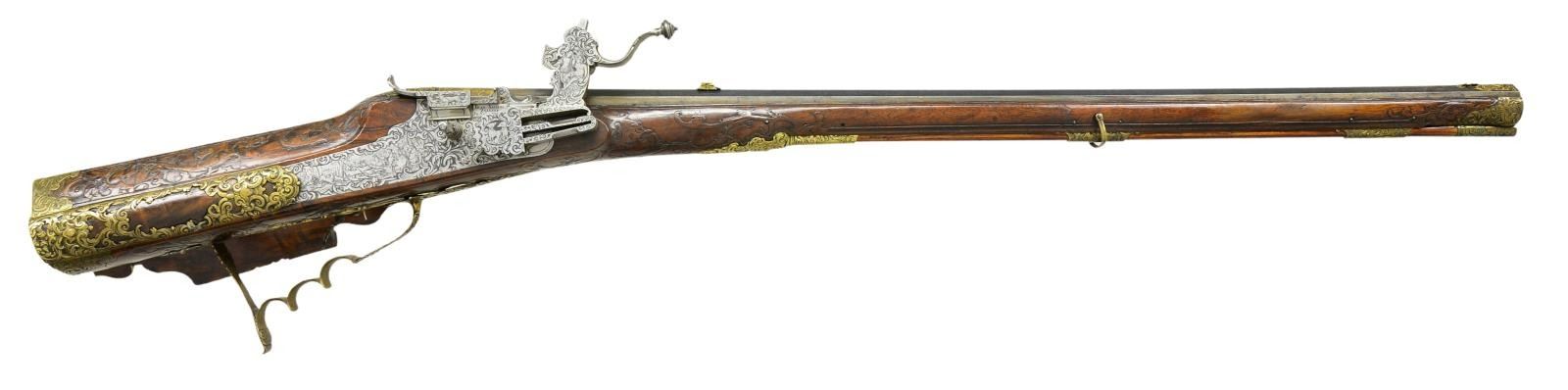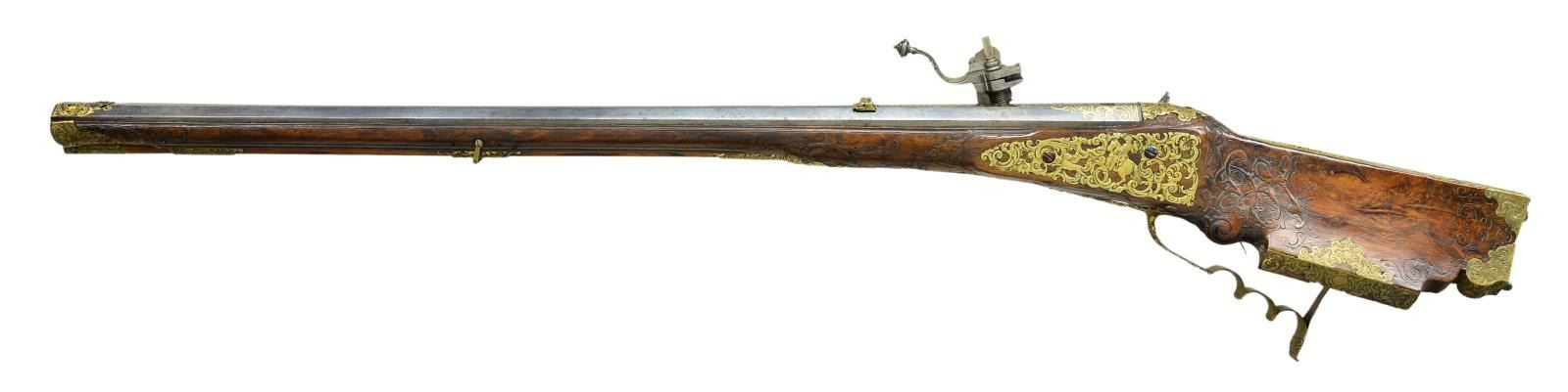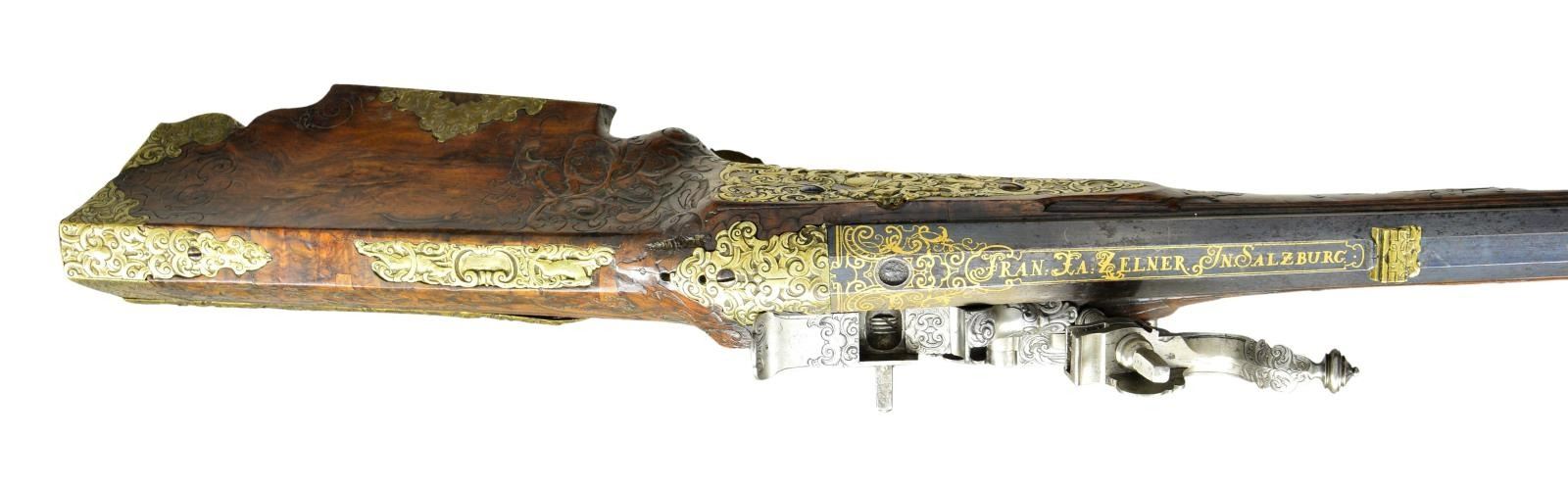 FRANZ XAVER (XAVIER) ZELNER (ZELLNER) IN SALZBURG CIRCA 1725. Cal. 28 bore. NSN. The 28 bore blued swamped octagonal barrel deeply rifled with seven grooves signed in gold at the breech along the top flat and inlaid with gold strap work framing a deeply struck maker's mark (New Stockel 8592). Gilt brass fore-sight and folding leaf back-sight chased with foliage, gilt brass tang plate chased with foliage. The flat lock signed "Franz Xaver Zelner in Salzburg" with internal wheel finely engraved with strap work both internally and externally framing a stag hunting scene, well rendered fox on the pan shield and hounds on the bridle. The cock is exquisitely engraved with the figures of Diana, goddess of the hunt, at her ease with Acteon, her lover. Well figured and moulded walnut full-stock (fore-end with old repair) carved and incised throughout. Full gilt brass mounts cast, chased, and engraved en suite. The pierced side-plate with a falconer on horseback, thumb plate with hound pursuing a hare, butt mounts, and chiseled set trigger. Original ramrod with brass tip decorated en suite with the mounts. CONDITION: This lovely wheellock rifle by one of Austria's distinguished makers is in overall fine condition with the repair to fore-end as noted, the barrel with considerable original bluing and the mounts with generous amounts of bright gilding. One sling mount is absent. (01-21895/MZ). ANTIQUE. $9,000-12,000.