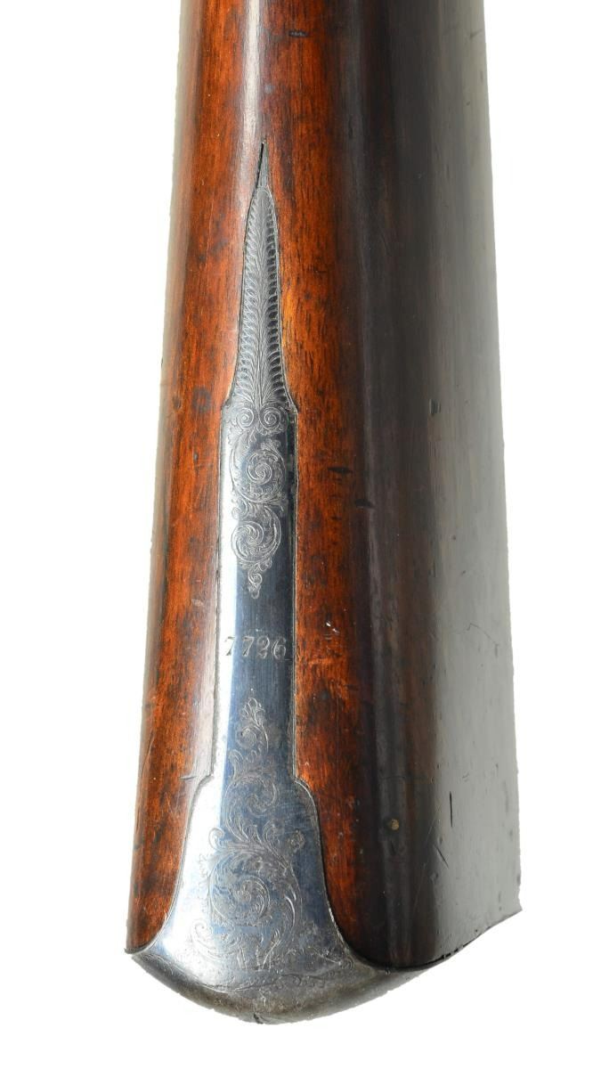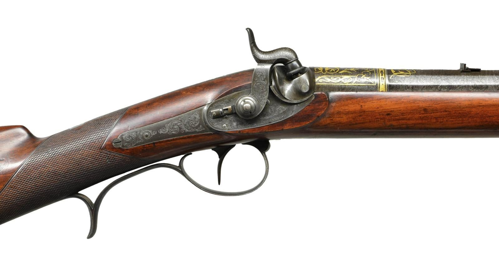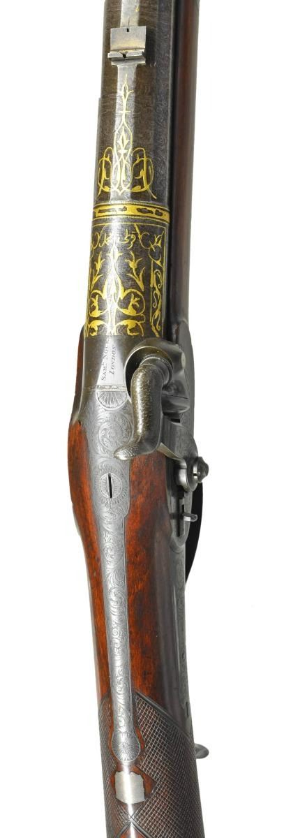 GOLD INLAID MOORISH BARREL EX. W. KEITH NEAL COLLECTON. Cal. 60. 7 groove rifling. S# 7726. Through the 18th and early 19th centuries in England there was a quest for fine barrel making materials; ultimately ending with true Damascus barrels as first made by John Rigby around 1818. Until that time "Best" barrels were often sourced from Spain and the Middle East, where true "Damascus" originated. These barrels were often taken as found and adapted to rifles and shotguns by many of the best makers including Manton, Egg, Henry Nock and Twigg. The barrel on this rifle measures 34" and has gold inlaid scrolls on round breech section which transitions to 12 sided and then through a gold inlaid wedding band to ovate with top line remaining as a ridge. Barrel is fitted with one standing one folding leaf rear and bead front sights. Case hardened percussion patent breech has vented platinum blow out and is engraved "Saml.Nock" "London" on top. Breech iron is engraved with well cut shaded scroll. Back spring lock with rebated tail is fitted with flat faced percussion hammer with stylized dolphin head which has large removable nose cap. Lock is fitted with back sliding safety that engages at half cock and is engraved with 60% coverage open scroll. Bottom of lock is engraved "Samuel Nock, Invenit". Trigger plate has shell engraved pineapple type finial and trigger guard with scroll on bow has spur at rear forming pistol grip. Steel buttplate has scroll engraving on long top tang along with S#. Stock of somewhat marbled and figured European walnut has closely spaced square checkering at grip. There is a fancy shaped vacant silver crest plate at top of grip. Stock has horn forend tip and attaches to barrel with two captive sidebolts through oval silver escutcheons. Ebony ramrod with brass tail mounts through single beaded pipe and matching thimble. A W. Keith Neal Collection medal number "G640" is attached to trigger guard bow. CONDITION: very fine original "as found". Barrel retaining most of its original brown under its etched Damascus pattern. It was not refinished at the time this gun was made. Patent breech, breech iron and lock retain about 80% original dark case hardening color. Trigger guard and buttplate retain over 60% original blue. Stock retains nearly all its original oil finish with a good number of marks both light and fairly heavy. Bore, most likely re-rifled at time of remaking is sharp and shiny throughout. Lock is crisp. (01-21901/MGM). ANTIQUE. $3,500-5,500.
