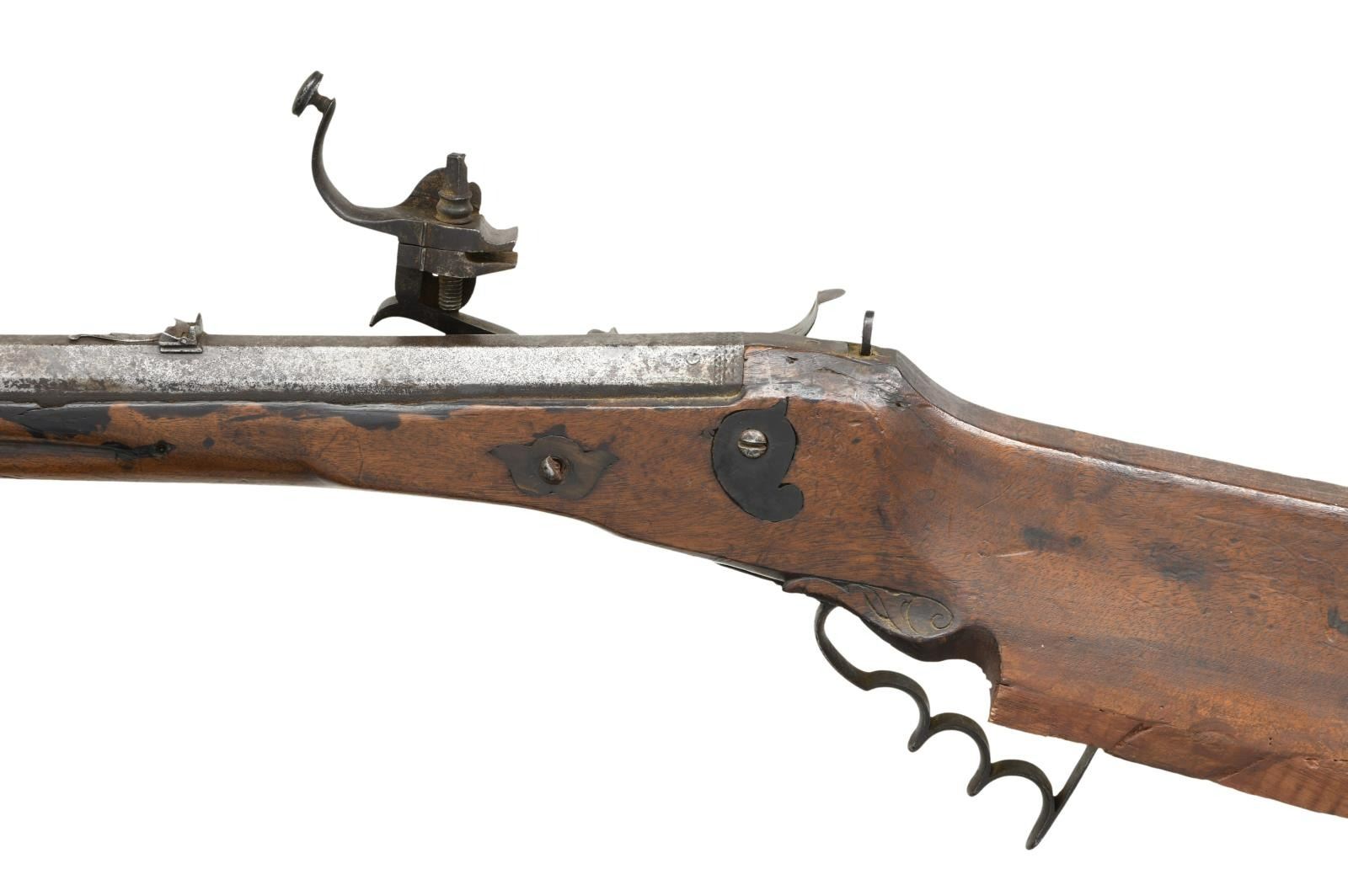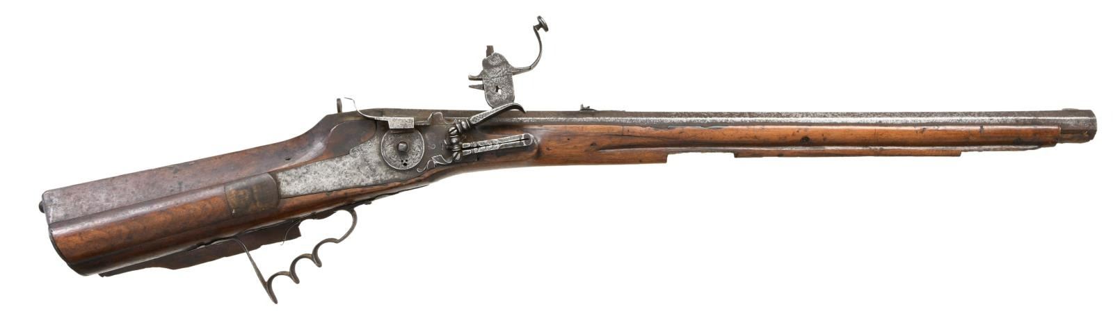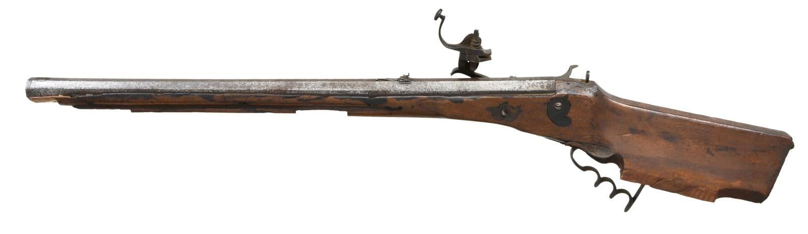Cal. 58. S# NSN. The 25" swamped octagon barrel is unmarked except for "G" on left rear flat. Two folding leaf rear sight has finely filed foliate finial. Unmarked wheel type lock has sliding pan cover. Dog and central boss are nicely engraved with scrolls and some sea monster accents. Feather spring finial matches finial on barrel sight. Trigger guard has three finger grooves. European walnut stock has sliding patchbox cover on right side. CONDITION: fair to good. Barrel shows considerable cleaning to pitted gray/brown patina. Lock has lighter cleaning to smooth gray/brown with silver accents. Stock retains a considerable amount of what appears to be original finish with many minor marks and some repairs evident with new wood added to edge of cheekrest. Repair to barrel channel on right side in front of lock with staining and chips on left side. Forend cap, ramrod pipes and ramrod are missing. Bore is dark and pitted, rifling evident. Lock appears to be good. An honest Wheelock rifle. (01-23160/MGM). ANTIQUE. $3,000-4,000.