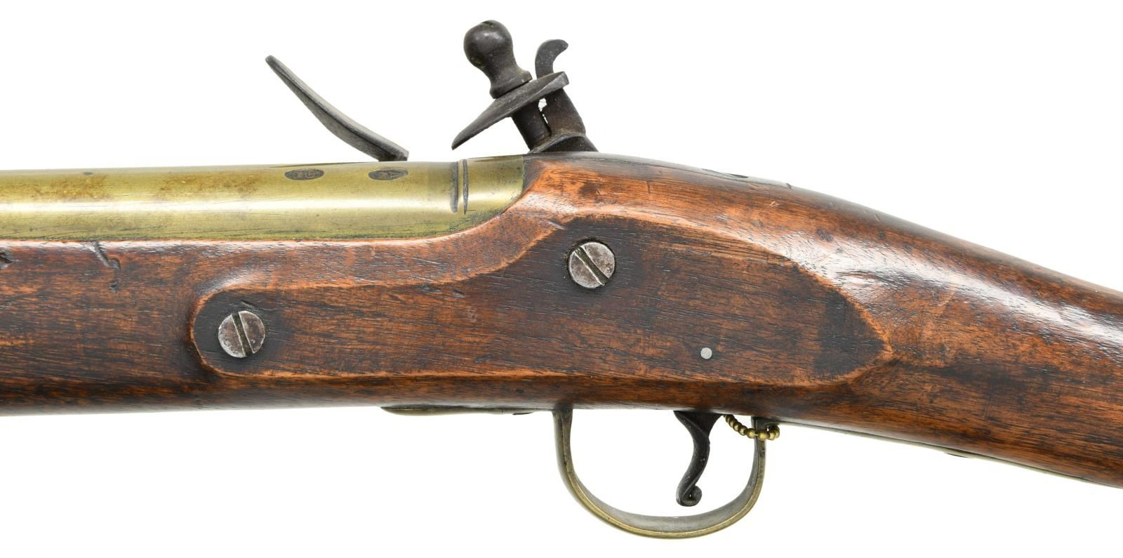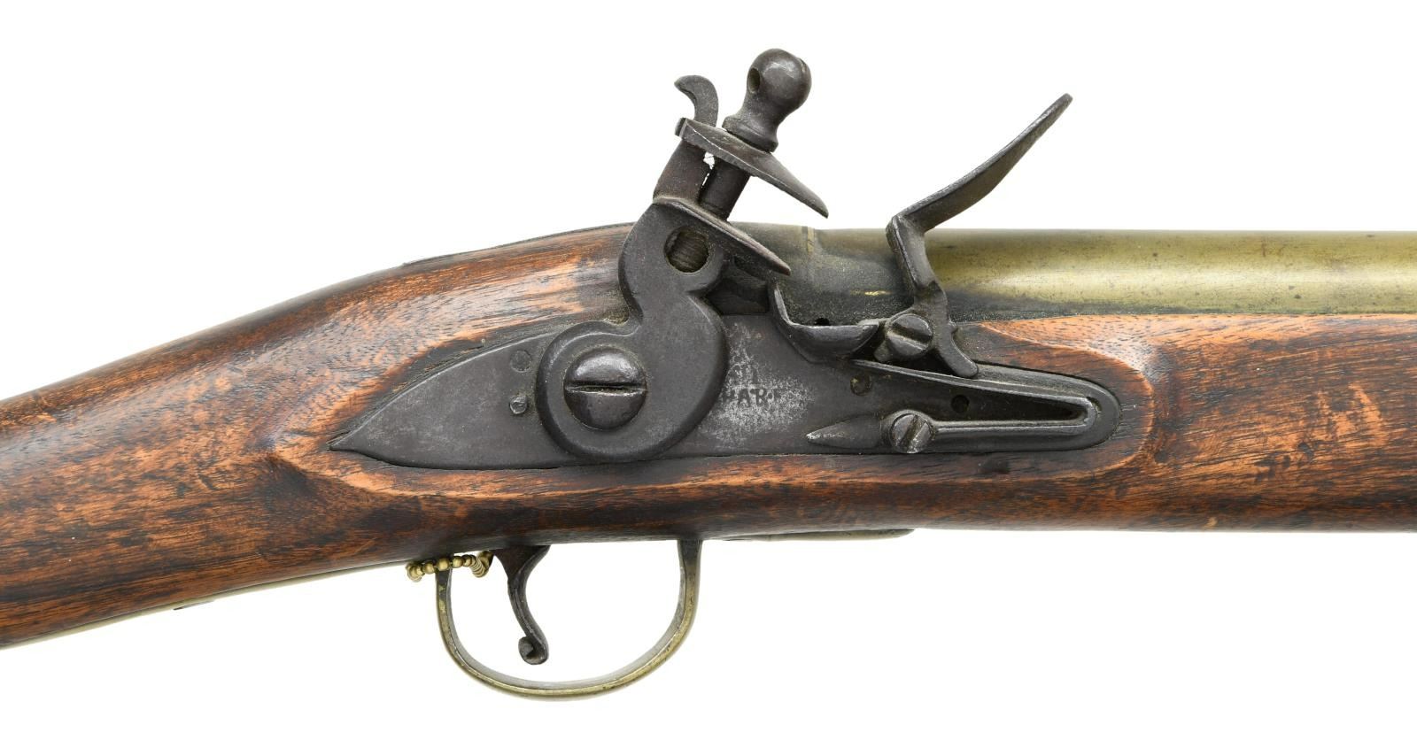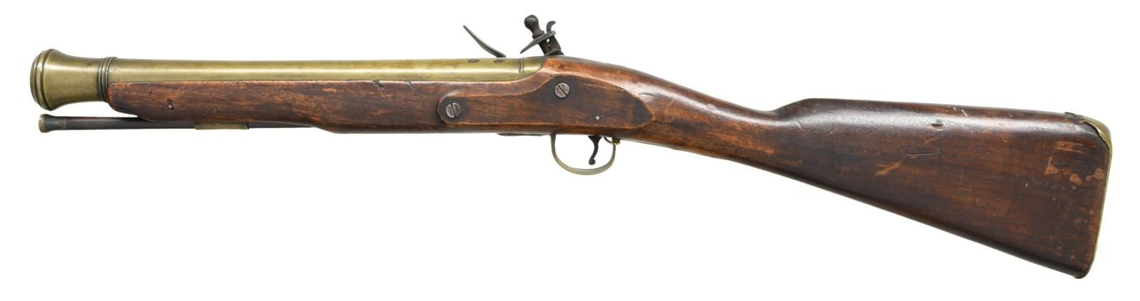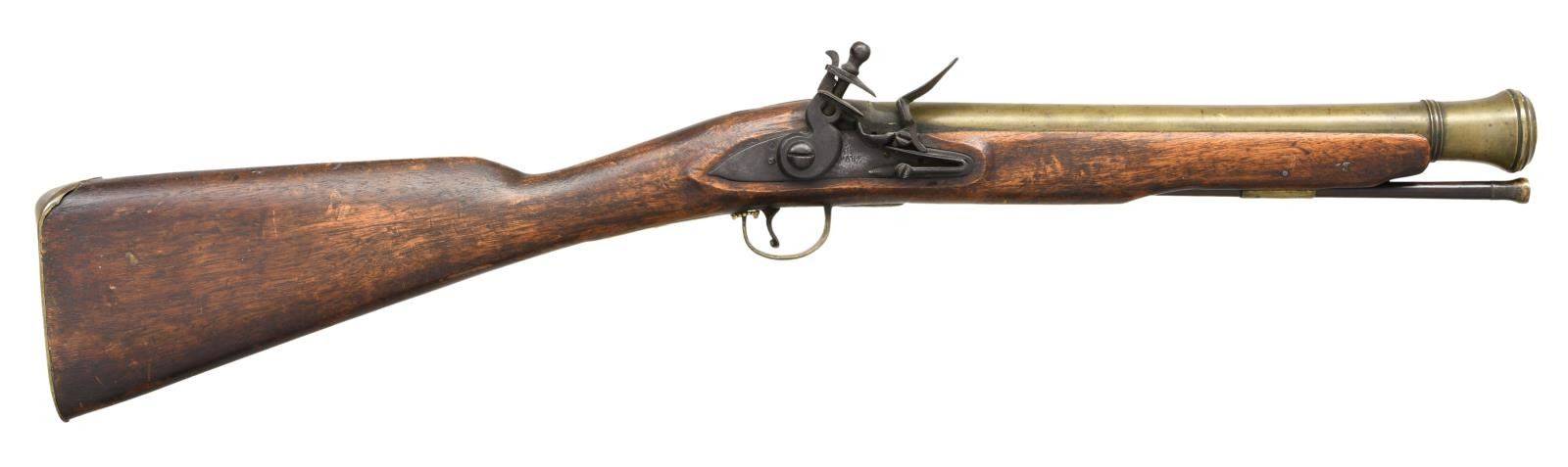 BLUNDERBUSS. Cal. about 1" S# NSN. The 14" brass barrel with cannon turned muzzle has London gunmakers proofs at rear. Trade quality flintlock with flat plate, reinforced broad cock, integral faceted pan, unbridled friction frizzen and feather spring with spear finial is marked with unreadable name at center which appears to be "I" "HAR" (? possibly Sharp). Quickly made American walnut replacement stock uses original brass furniture, including trigger guard with bulbous finial and early type buttplate with multi peaked finial. Later rosewood ramrod with brass tip mounts through single plain pipe. CONDITION: good to fine as rebuilt. Appears to have been in this configuration for a very long time with some hand wear on stock. Lock is good. PROVENANCE: From the Collection of James B. Taylor. (01-23878/MGM). ANTIQUE. $2,000-3,000.