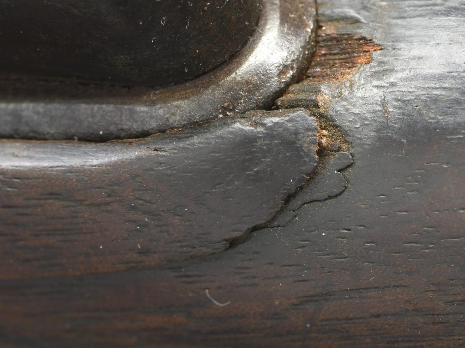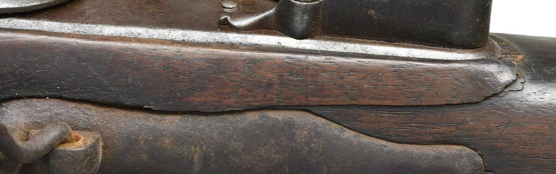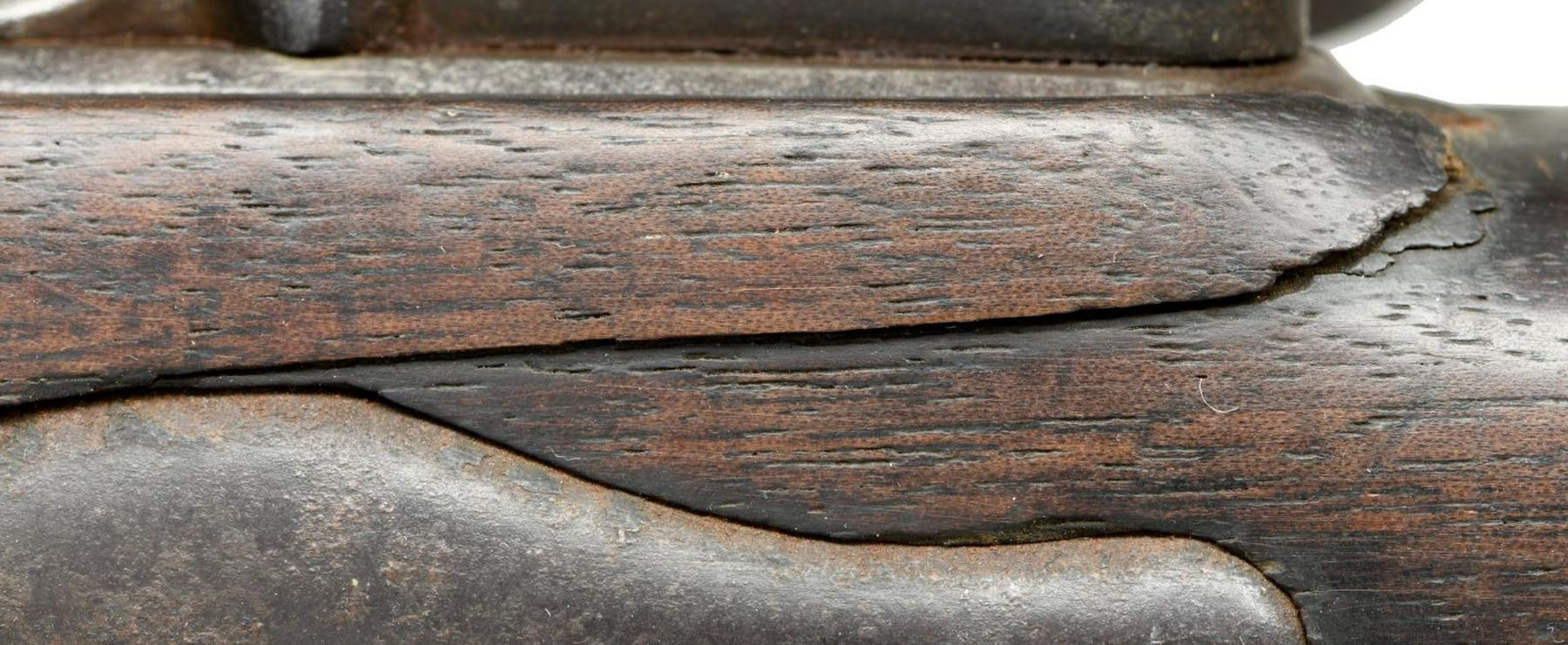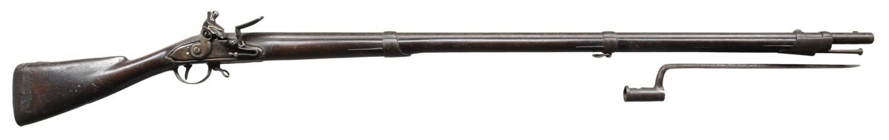 Cal. 69. NSN. Bbl. 45". Center of lock marked "Charleville". Upper tang & bbl. markings are obscured by pitting. Sideplate marked w/ a sideways "L". Lock appears functional but is sluggish. Walnut stock w/ three bands & bottom mounted sling swivels. Button tipped ramrod. UNATTACHED ACCESSORIES: replacement socket bayonet that has what appears to be a broad arrow marking on face. Bayonet measures 17" overall w/ 15" blade. Bayonet is a dull brown patina w/ oxidation, dings & scattered pitting. CONDITION: stock has prominent crack below lock, stock otherwise shows a few other cracks, scattered chips, dings & handling wear. Metal is a gray patina w/ scattered pitting & oxidation. Oxidized bore. (01-23675/MJC). ANTIQUE. $1500-2250.