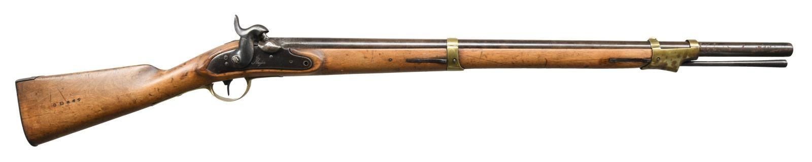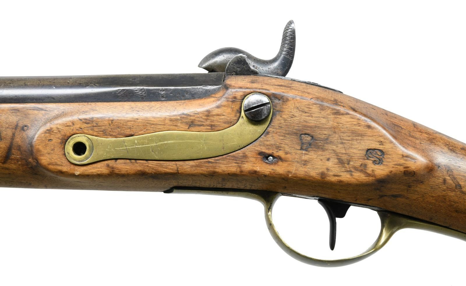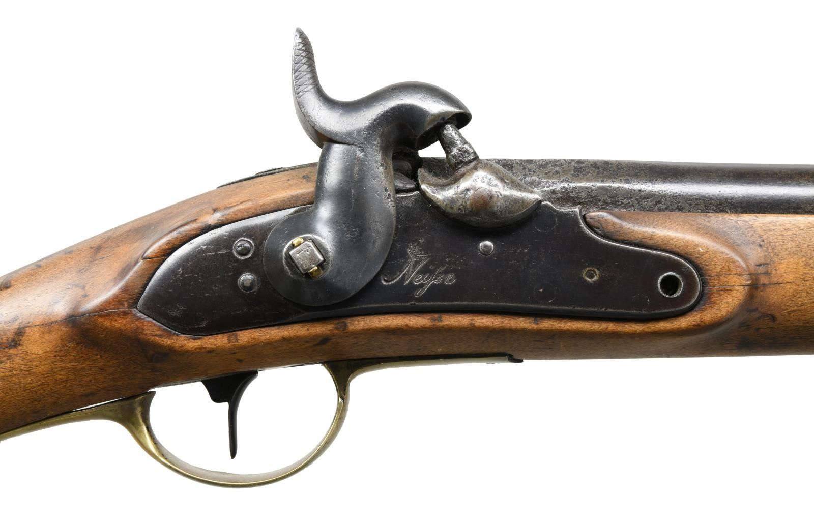 Cal. 72. NSN. Bbl. 31". Brass blade front sight. Fixed rear sight. Cutdown "Potsdam" percussion musket. Lock has Neisle marking. Front stock bolt is missing. Hammer is not functioning properly & may require attention. Brass bands, trigger guard & sideplate. Beech stock w/ two bands. Right side of stock marked "D849". Iron ramrod present. CONDITION: sanded stock has a few cracks, scattered dings & handling wear. Brass parts remain partially bright w/ areas turning to a yellow patina, scattered dings & oxidation. Balance of metal is a dull gray patina w/ a large area of pitting at rear of bbl., some tool marks at rear of bbl. & scattered oxidation. Oxidized bore. PROVENANCE: From the Lifelong Collection of Glen E. Mattox. (01-22538/MJC). ANTIQUE. $600-800.