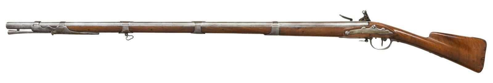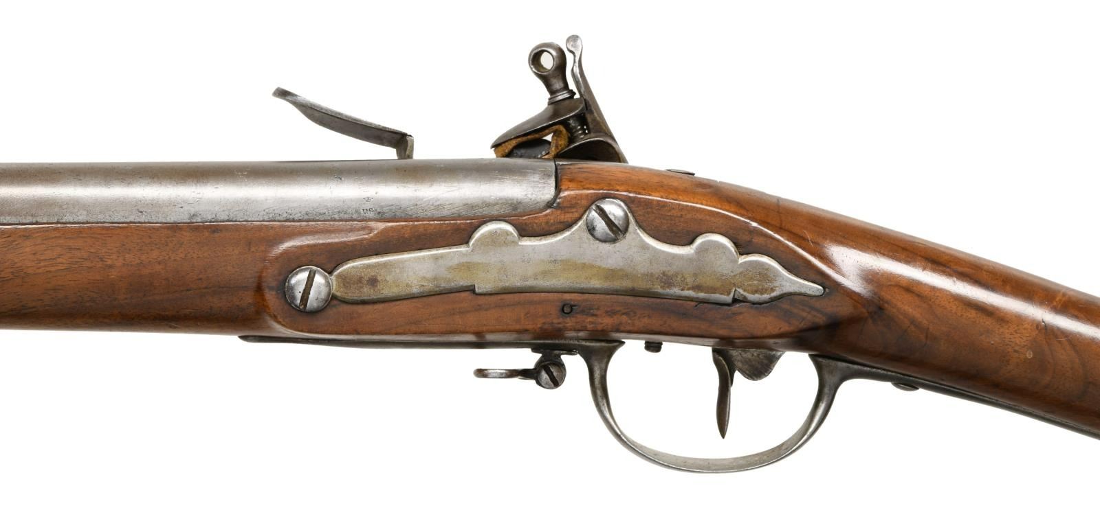 Cal. 70. NSN. Bbl. 40 1/2". This finely made musket was likely produced in the late 18th century or very early 19th century, and shows French manufacturing influence. It has a round, sightless barrel with a bayonet lug on the underside. The breech is stamped with a 3-petal flower and a "G". The lock is unmarked with an iron pan and reinforced cock. Iron trigger guard, buttplate, side plate, barrel bands, sling swivels, and ramrod. The stock appears to be fruit wood, possibly apple. The butt is branded with 4 "G" marks and 3 tri-petal flowers, similar to the marks at the breech. There are 3 single barrel bands and a large double barrel band near the muzzle, also serving as a nosecap. CONDITION: barrel has a medium gray patina, as do the other iron parts. Stock is generally solid but has a crack from the barrel channel through the second barrel band. Lock holds both full & half cock, but fires from either position. Good bore. (01-23170/BF). ANTIQUE. $2,000-3,000.