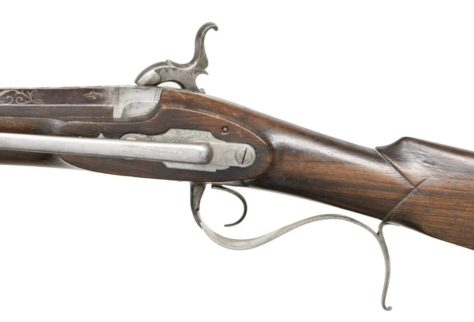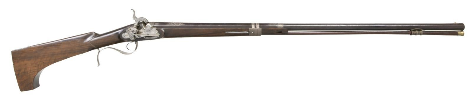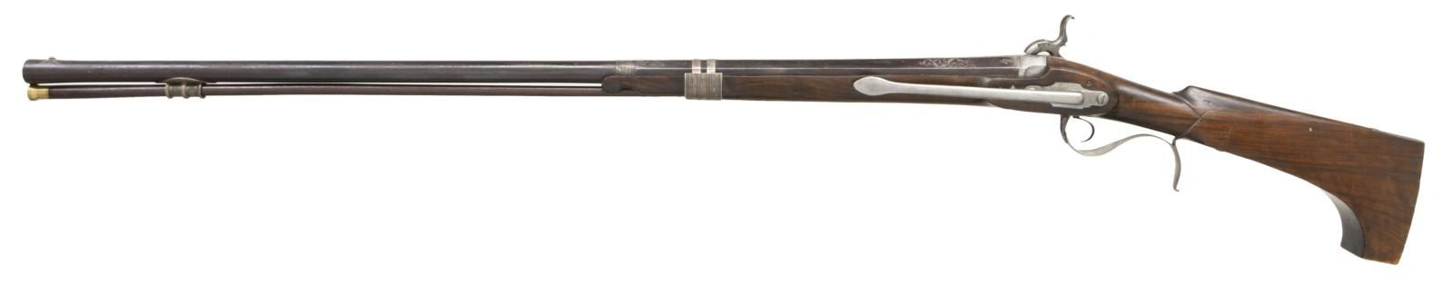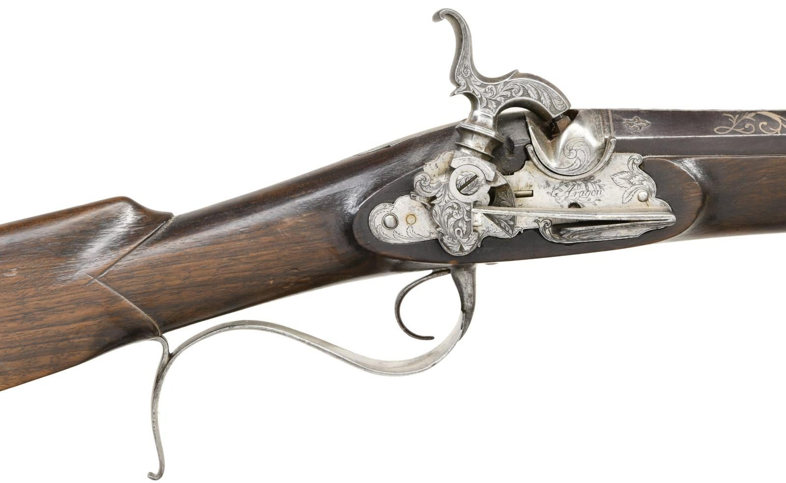 Cal. 75. NSN. Bbl. 36" part-oct part-rnd. Silver blade front sight. Rear of bbl. has three Fleur De Lis markings, a cross marking, a lion shield & a faint crown marking. Bbl. also marked "EIBAR 1818" & has floral decorations. Lock marked "ARAGON" for the Spanish gunmaker. Hammer & lock have floral engraving. Hammer appears functional. Hardwood half-length stock w/ 8" side clip. Brass tipped ramrod secured by one band & a silver pipe. CONDITION: stock shows scattered dings & handling wear from the years. Bbl. is a dull gray patina w/ scattered oxidation & some light pitting. Balance of metal appears cleaned long ago w/ some scattered oxidation & pitting. Smoothbore shows some scattered oxidation but is generally good. PROVENANCE: From the Collection of James B. Taylor. (01-23881/MJC). ANTIQUE. $2000-3000.