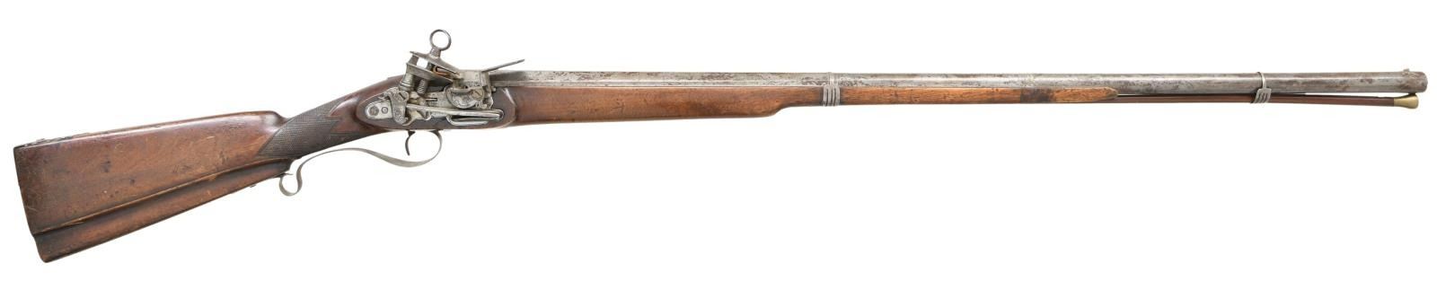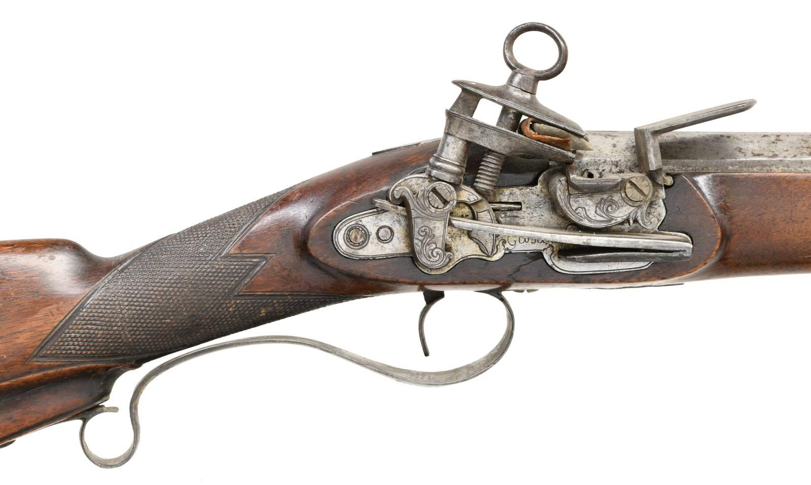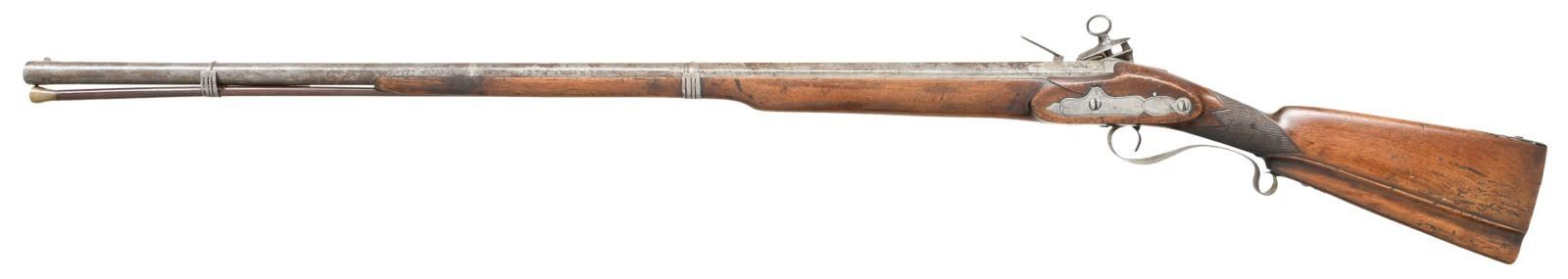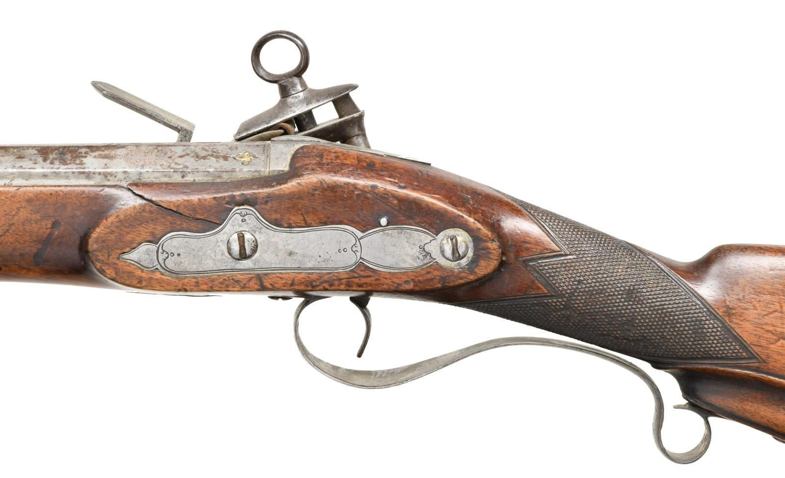 Cal. 72. NSN. Bbl. 35 1/2" half-oct half-rnd. Blade front sight. Rear of bbl. marked "EN EIBAR 1813". Rear of bbl. has two Fleur De Lis markings, a lion shield & a crown over "ANT GUI SAS OLA". Bbl. also has a few floral engraved decorations. Lock has floral engraving & a marking that reads in apart "GWSAS". Finger curl trigger guard. 2/3 length hardwood stock w/ checkering at wrist & brass tipped ramrod secured by two grooved bands. CONDITION: stock has older finish w/ zig-zag crack below lock, a 1 1/4" crack ahead of sideplate, scattered flaking, dings & handling wear. Metal is a gray patina w/ scattered oxidation & some light pitting. Good smoothbore w/ some light oxidation. PROVENANCE: From the Collection of James B. Taylor. (01-23880/MJC). ANTIQUE. $1000-1500.