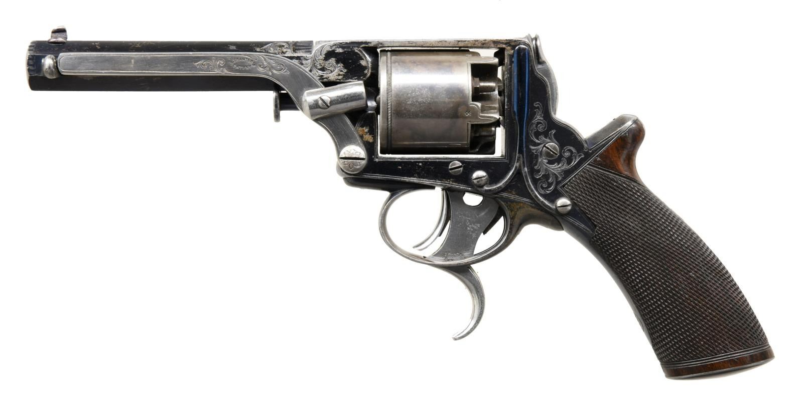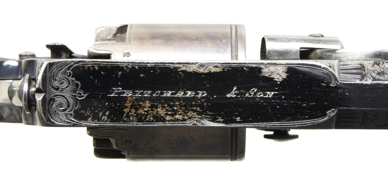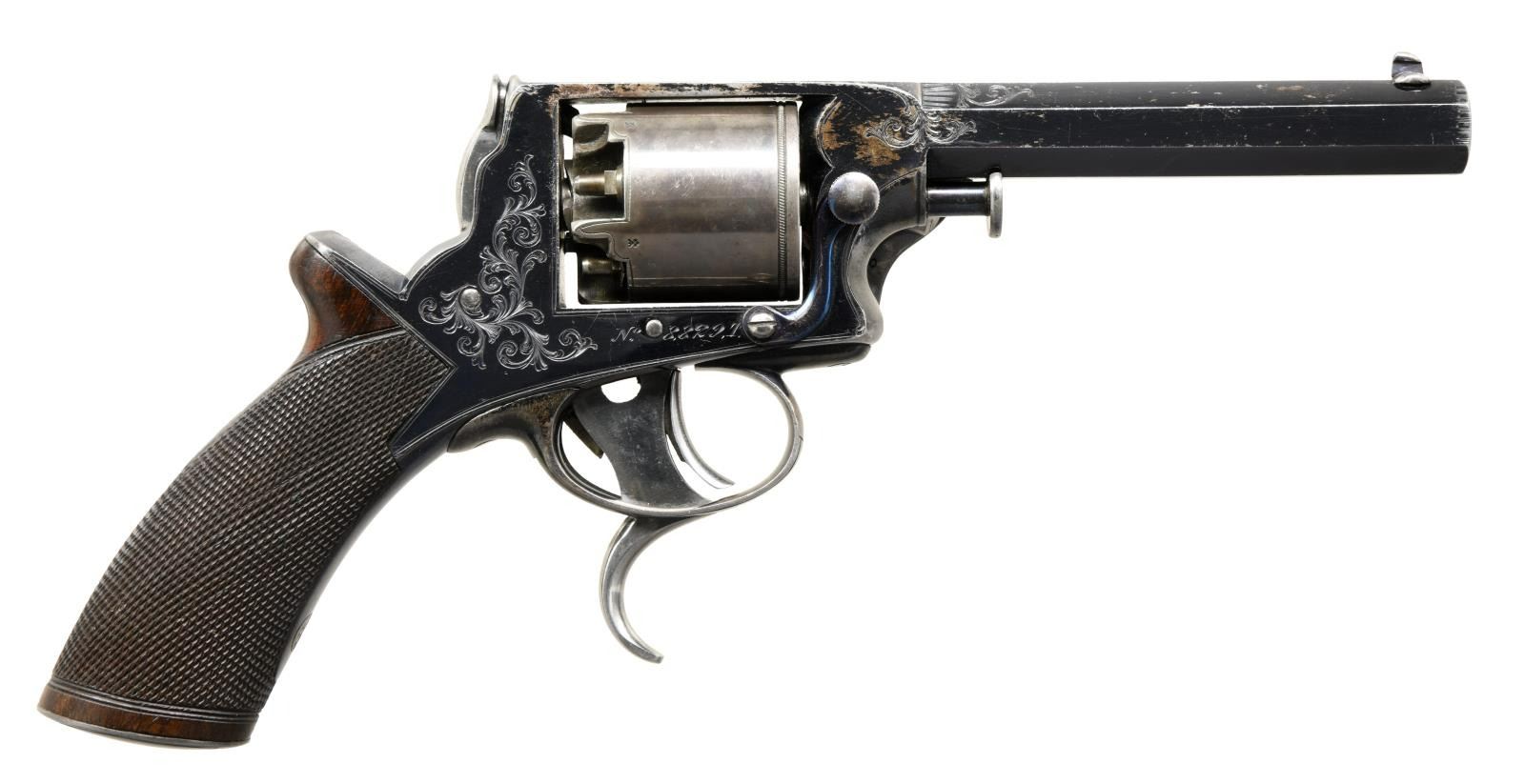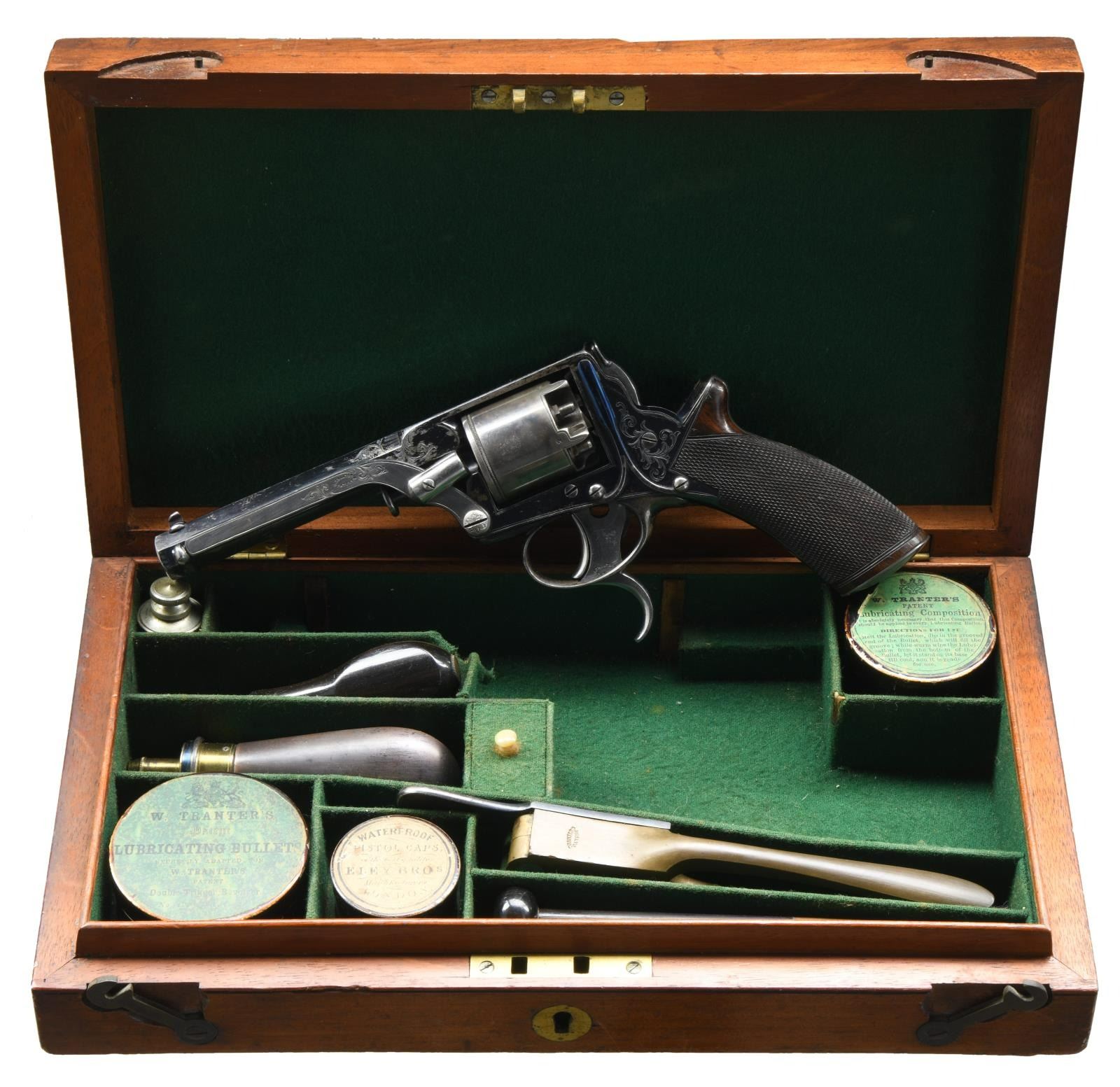 REVOLVER RETAILED BY PRITCHARD & SON. Cal. 36. S# 8829T. The 4-1/4" octagon barrel is made integral with blued solid frame. Top flat is engraved "Pritchard & Son". Hammer does not have thumb spur. 5 shot revolver is double action with large bottom trigger which cocks action and rotates cylinder. Revolver is fired by small trigger within trigger guard. Birmingham proofs are present on barrel and case hardened cylinder. "W. TRANTER" "PATENT" marks are on left side of trigger and loading rod. Action is engraved with sprays of well cut scroll. S# is on right side bottom of frame. Checkered walnut grips have case hardened and engraved butt cap. UNATTACHED ACCESSORIES: revolver is housed in what appears to be its original mahogany case with duel hook and key closure. Interior is lined with green cloth and bottom compartment contains revolver and a complete array of original accessories including Tranter marked bronze two cavity bullet mold numbered "80" on sprue plate, small copper bag shaped powder flask by Dixon, small pewter oil bottle, rosewood handled nipple wrench, rosewood and ebony loading rod, tin of Tranter's lubricating composition, larger tin of Tranter's lubricating bullets, percussion cap tin by Eley Bros. and five spare nipples in central covered compartment. CONDITION: very fine. Revolver retaining 80-90% original blue with most loss due to flaking. Most original color remains on cylinder and grip cap; other small parts retain most of their original bright polish. Bore is bright with some minor flakes of rust. Mechanically fine. Case is also very fine with fair number of scratches in original exterior varnish. Interior cloth is very fine. Accessories are generally fine with some loss to labels on tins. (01-21910/MGM). ANTIQUE. $5,500-7,500.