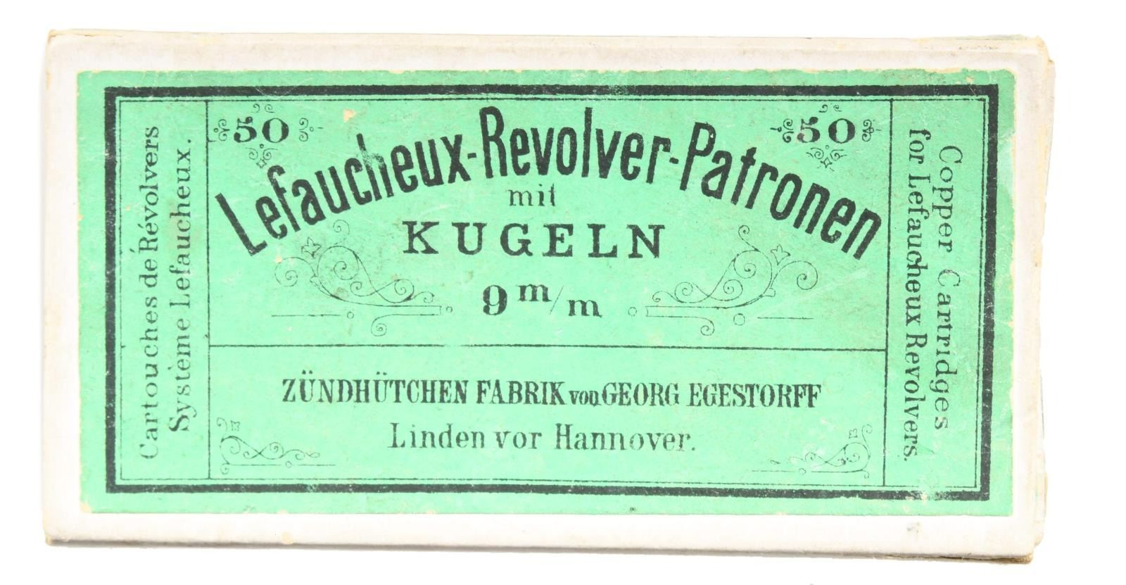 WITH BOX OF AMMUNITION. Cal. 9mm Pinfire. S# 96008. Model 1854 single action pinfire revolver manufactured in Belgium. Left side of barrel is stamped "E. LEFAUCHEUX/ INVR BREVETE". Cylinder bears Belgian proofs. Blued finish, with 2 piece smooth wood grips. UNATTACHED ACCESSORIES: 1 50 rnd box of Georg Egestorff 9mm pinfire ammunition containing 49 rnds. CONDITION: metal components retain large amounts of their period blue finish, exhibiting wear and thinning that show through to brown and gray patina, with mild surface oxidation overall. Very bore, exhibiting old grease and strong rifling throughout. Grips show scattered marks and minor impressions from storage and handling, but otherwise remain sturdy and serviceable. Box shows some minor tearing and age related wear, but is otherwise sturdy and serviceable. PROVENANCE: From the Collection of James B. Taylor. (01-23853/MLW). ANTIQUE. $800-1,200.