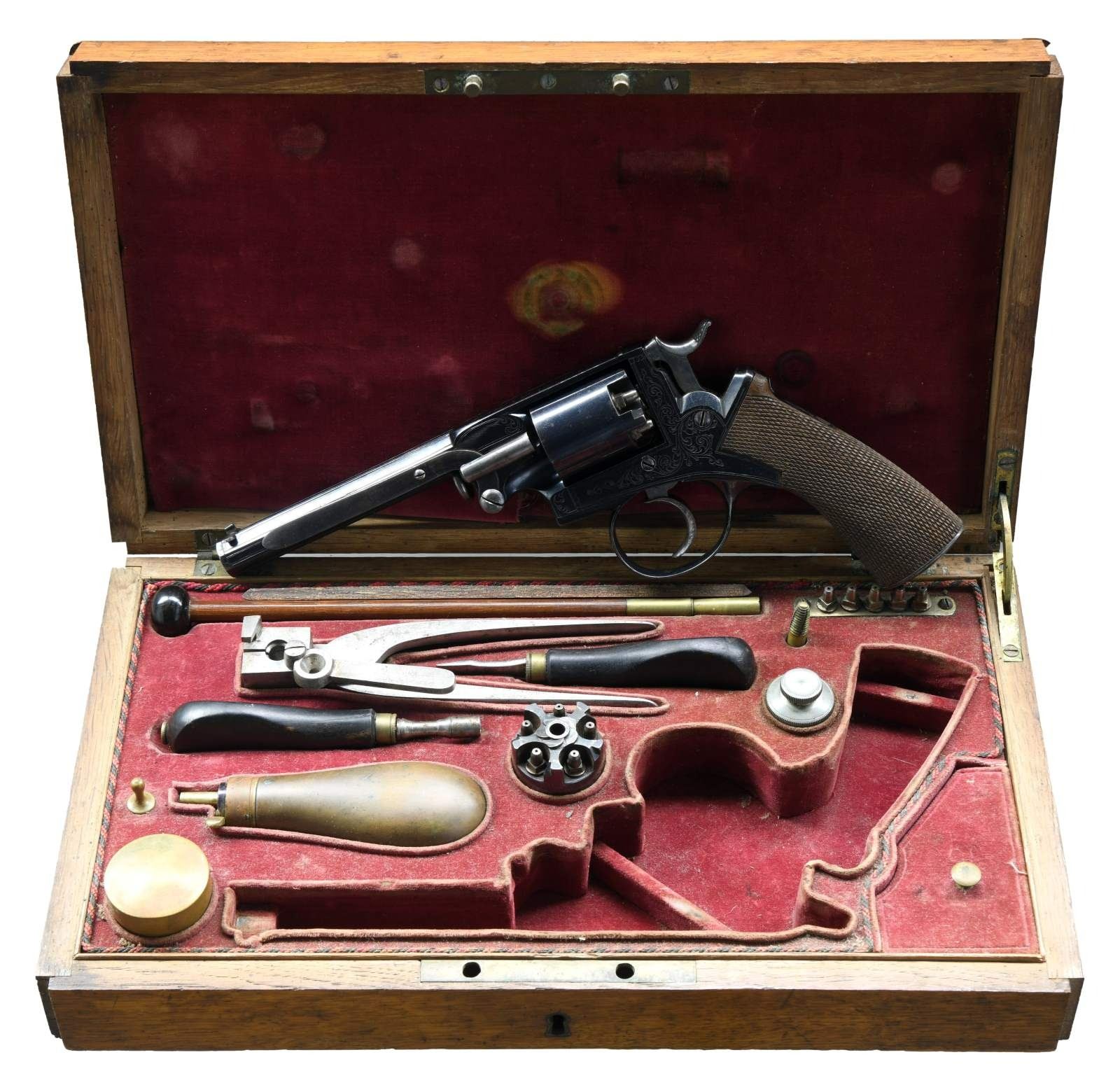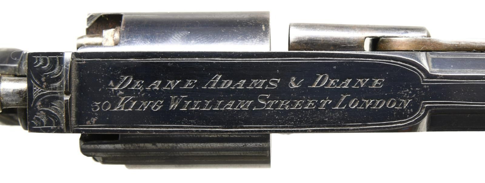 DOUBLE ACTION REVOLVER WITH CASE & ACCESSORIES. Cal. 34. NSN. Bbl 5". Adams patent revolver manufactured by Deane Adams & Deane. The top of the barrel is stamped " DEANE ADAMS & DEANE/ 30 KING WILLIAM STREET LONDON", with the revolver otherwise being devoid of any other identifying markings. Left and right sides of frame and barrel exhibit scroll engraving (at breech), which is also present on the underside of the trigger guard, as well as on the butt cap. The octagonal barrel features line border engraving on each of the flats, terminating in a band of circles engraved at the muzzle. Metal components exhibit a lustrous blue finish, with the Kerr type loading lever exhibiting a nitre blued finish, and with the hammer and trigger being in-the-white. UNATTACHED ACCESSORIES: period wood case featuring a red felt lining, French fitted for a cleaning rod, bullet mold, screwdriver, nipple wrench, brass powder flask, spare cylinder, brass cap tin, James Dixson & Son oiler, and 5 replacement nipples. Right corner panel of lid is also present in the case. CONDITION: metal components retain the majority of their original blue finish, exhibiting some mild wear, with scattered areas of freckling and light surface oxidation overall. Nitre blued loading lever exhibits wear overall, with some light surface oxidation. Hammer & trigger show areas of darker discoloration, with some light surface oxidation. Very bright bore, exhibiting well defined rifling throughout, with pitting present around the breech area. Cylinder pin retention spring is broken. Upper rear grip tang screw head is warped on one side. Grip is very good overall. Case exhibits scattered marks from handling and storage, with the lid exhibiting a crack that runs across the length of the lid. Aforementioned top right corner panel of lid is not attached, with corners of lid and base not being present. Felt interior show appropriate wear and spots of fading consistent with use, with the lid lining exhibiting a small tear at the bottom of the panel. (01-23769/MLW). ANTIQUE. $2,000-3,000.