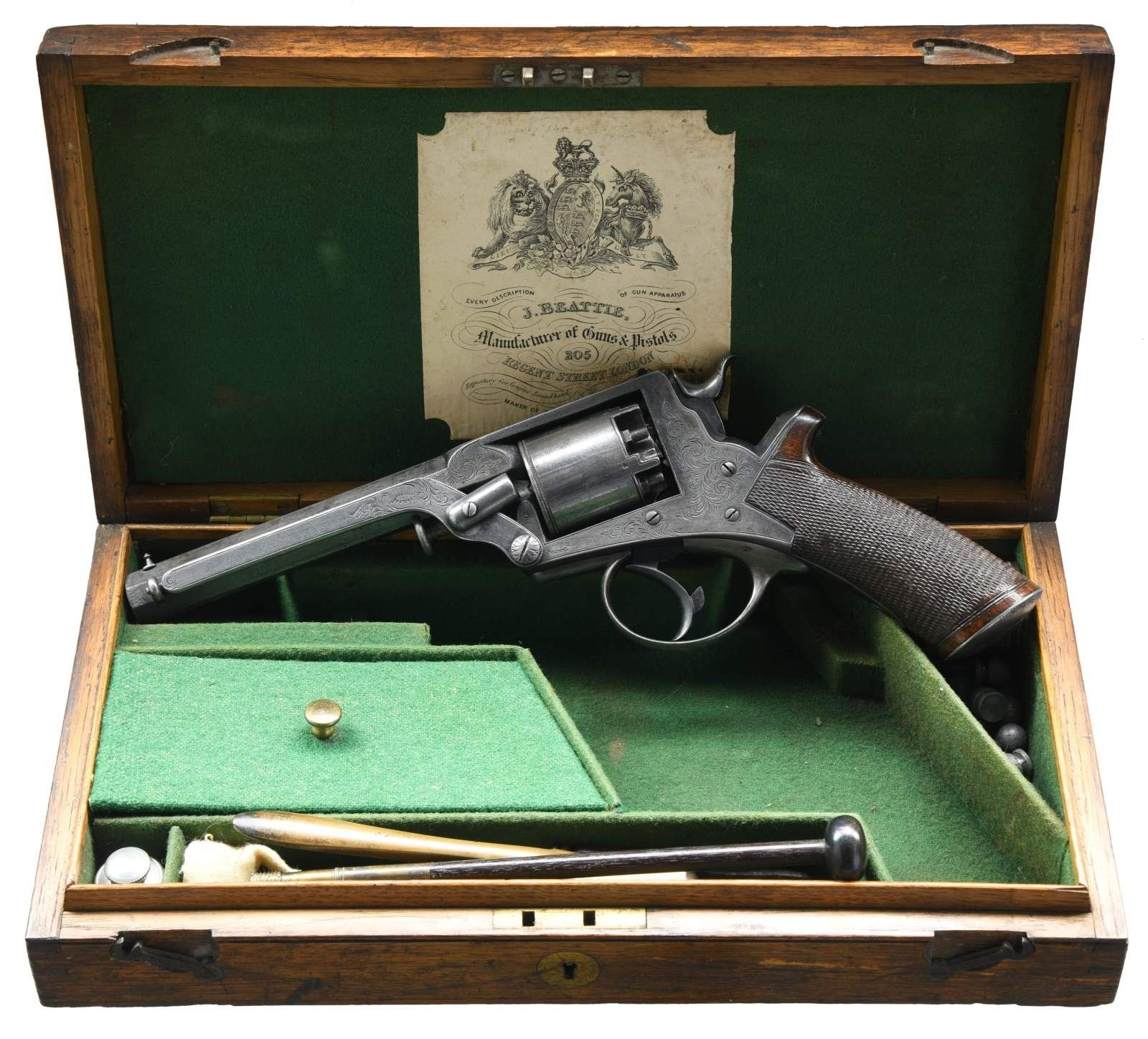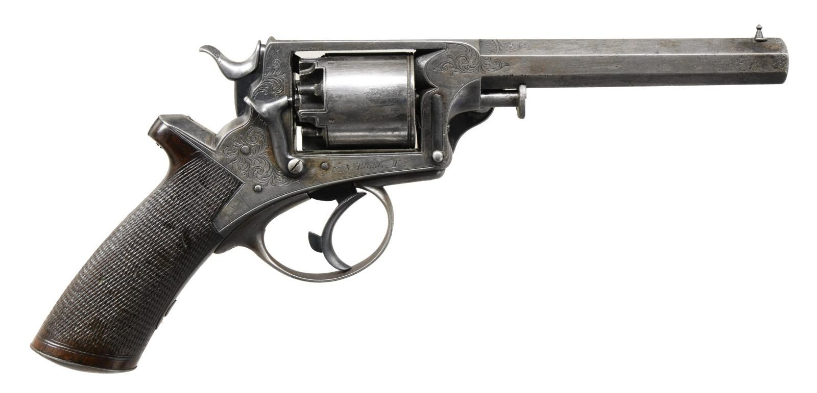 Cal. 54 Bore (.442). S# 19656T. Standard configuration of early 4th model manufactured about 1864, 6" octagonal unmarked barrel, integral notched rear sight, inset pointed pin front side, loading assembly marked "TRANTERS PATENT" attached to left side of frame which has scroll engraving en suite unloading arm, trigger bow, and butt cap. Double action, single trigger with no spur. Serial number engraved on left side of frame "No. 19656 T", mounted with one piece checkered walnut grips. Revolver is housed in original green baize lined oak casing compartmented for revolver, Dixon bag flask, pewter oiler, wood handled nipple wrench/vent pick, wood handled screwdriver, brass "TRANTER PATENT" 2 cavity 54 bore bullet mode, loose bullets, five extra nipples, extra cylinder (#ed 79 on back), wood brass and steel combination rammer and worm, and functional case key. "J. BEATTIE" agents paper label inside lid. This was a popular big bore army revolver worldwide, several revolvers are identified as Confederate used from 8000-18,000 serial range. CONDITION: : revolver is overall very good with traces of original blue finish, balance gray patina. Accessories all very good. Casing externally soiled and scuffed, lining soiled and scuffed. Agent's label torn & stained at bottom right quadrant. Revolver is mechanically fine with bright rifled bore. (01-24097/JS). ANTIQUE. $3,000-4,000.