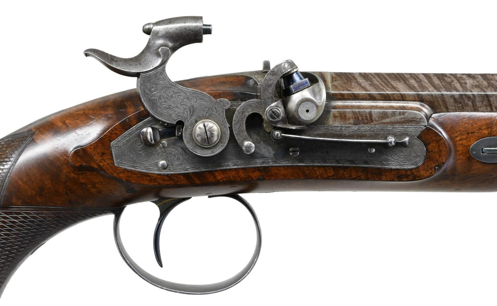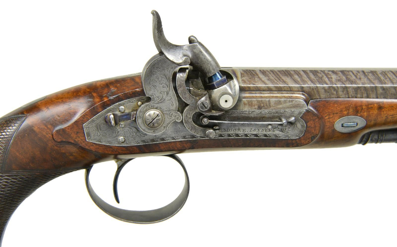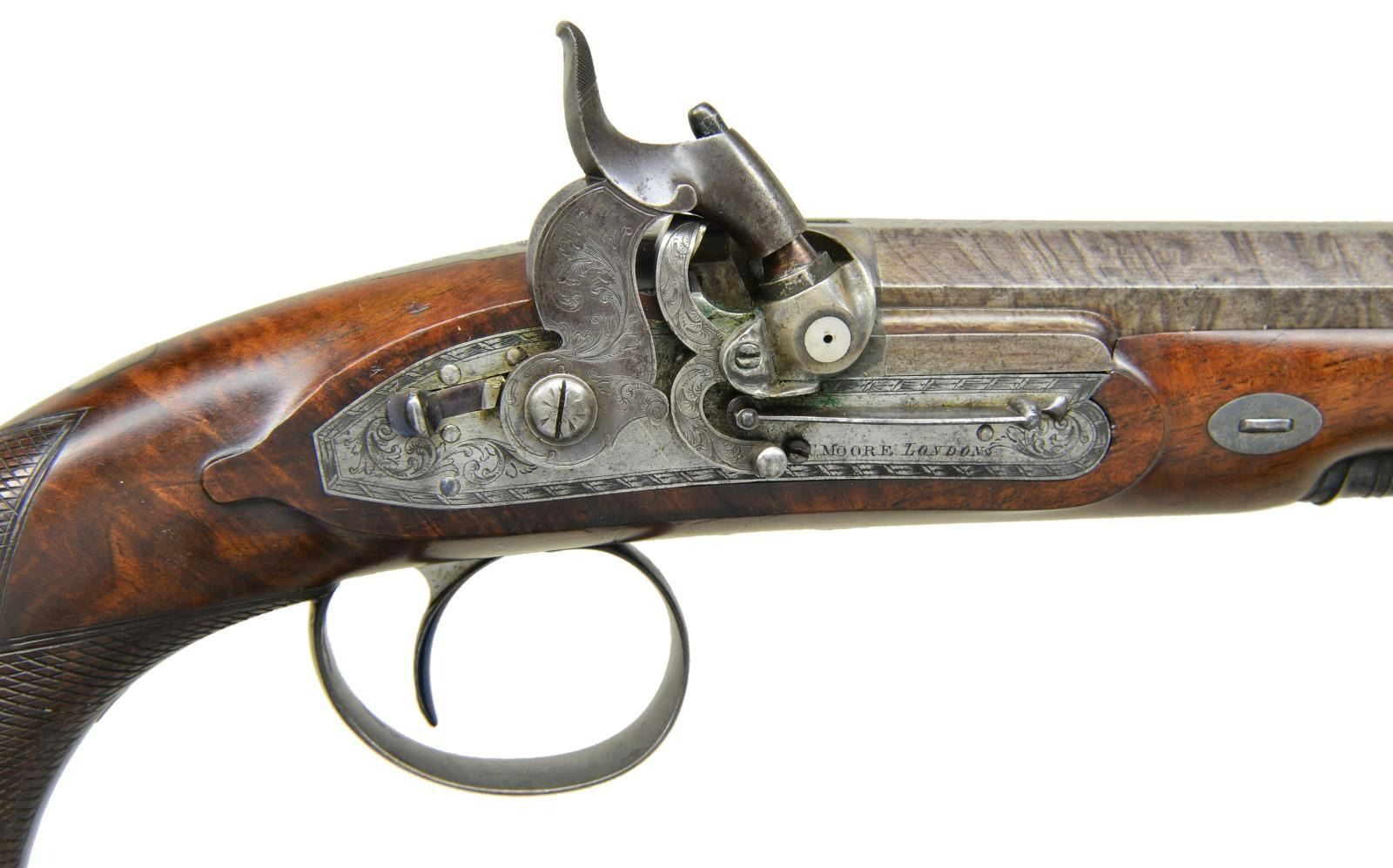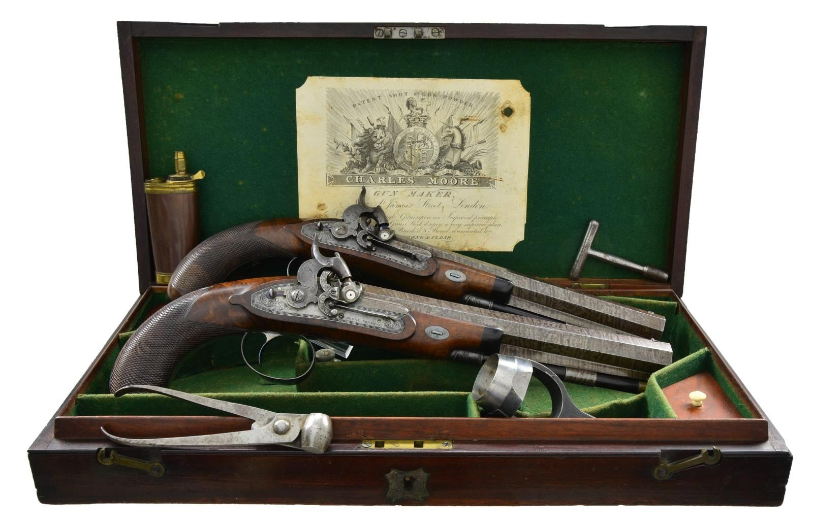 PISTOLS BY CHARLES MOORE. Cal. 50 both. S# 1141 both. The 9" swamped octagon barrels with under ribs, made of nicely patterned stub Damascus are engraved with Maker's "77 St. James's Street" address (CA 1825-42) on top flats. Case hardened patent breeches have inset platinum poincon marked "C. MOORE" "LONDON" "PATENT" all under a crown. Breeches have vented platinum blowouts and are fitted with bases having cups to receive pills or pellets of priming compound. Locks having flat plates are fitted with pivoting levers; one end of each lever has platinum seal that covers pill recess, base portion is shaped so that the fall of the hammer cams cover out of the way allowing firing pin to strike pellet. Flat faced hammer is filed with protrusion to move lever system, head has interchangeable firing pins, retaining spring is on inner side of nose. Locks are also fitted with back sliding safetys that engage at half cock. Locks, hammers etc., are nicely engraved with open scroll within feather borders on plates. Plates are also engraved "C. Moore. LONDON" under feather springs. Root walnut stocks have flat checkered bag grips and horn tips. Trigger plates have pineapple finials, trigger guards have scroll engraving on bows and S#'s on tangs. Stocks attach to barrels with captive side bolts through oval silver escutcheons. Rosewood ramrods with brass tips and tails mount through single plain pipes and well filed steel thimbles. UNATTACHED ACCESSORIES: pistols are housed in their original mahogany case with duel pivoting hook closure and flush mounted circular "D" ring handle. Interior is lined in green cloth and has large paper Charles Moore St. James St. label in lid over another label. Bottom compartments are arranged for pistols and some accessories including copper bodied 3 cavity powder, ball and patch flask by Hawksley marked "FIREPROOF"; steel nutcracker "WD" marked bullet mold for # 38 ball (.490); correct wrench for pill bases (missing handle); case hardened main spring vice; steel nipple wrench (which doesn't fit anything) brass loading rod and unmarked wad punch, for 1 1/4" patches. A covered compartment holds boxwood container inscribed with these pistols S# which contains spare pill bases and firing pins. Another covered compartment contains a pair of percussion hammers. CONDITION: very fine, barrels retaining nearly all of their brown finish with excellent definition to pattern. There is a light scattering of freckling evident. Locks retain most of their case hardening color, fading to gray. Breech irons and patent breeches retain most of case color (possibly redone) engraving somewhat soft. Steel parts retain over 80% charcoal blue. Stocks retain what appears to be most of their original finish. Multi-groove rifled bores show light pitting throughout, locks are fine. The platinum of one poincon is missing, stamping legible. Case retains most of its varnish finish on exterior with many scratches and some splitting on top front. Interior cloth is good with areas of fading and spotting. Label has some rubs through and is lightly foxed. Accessories are generally good. Lid of case has a small chip at left near corner, chip is present and repairable. (01-21882/MGM). ANTIQUE. $15,000-25,000.