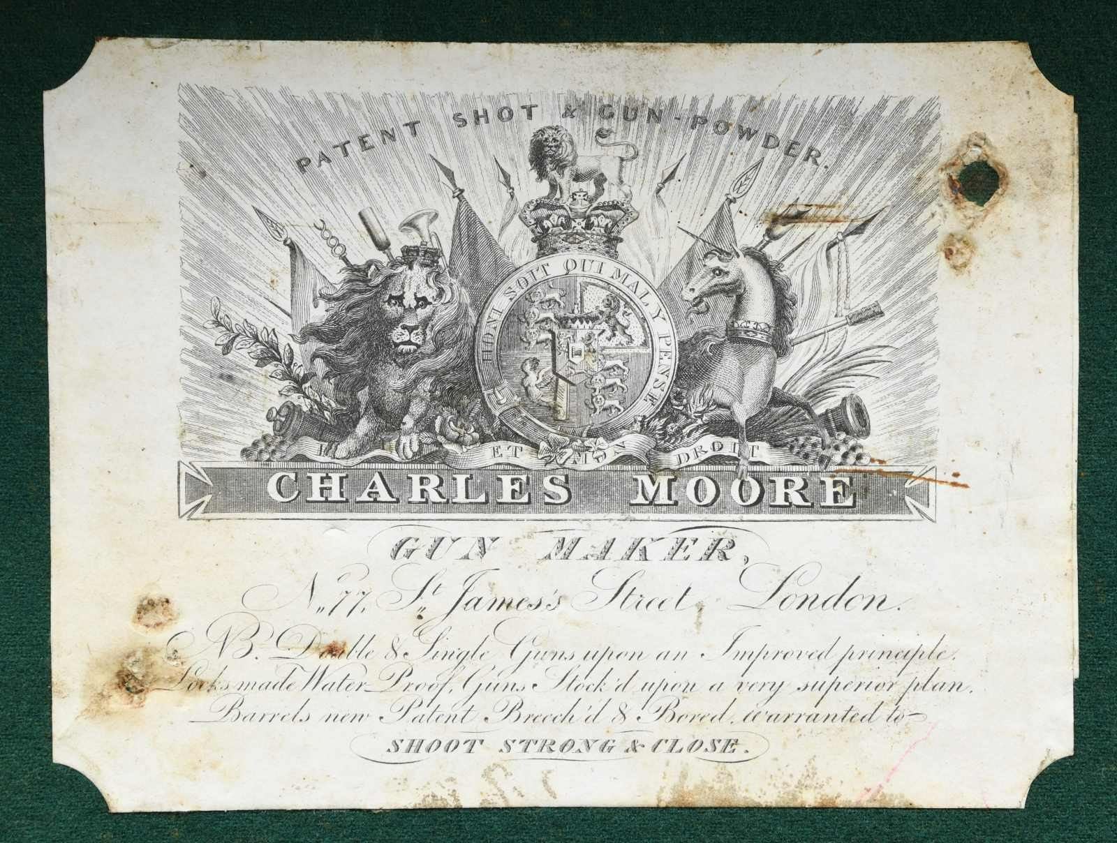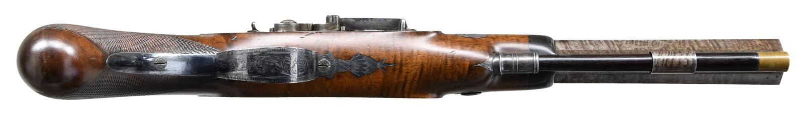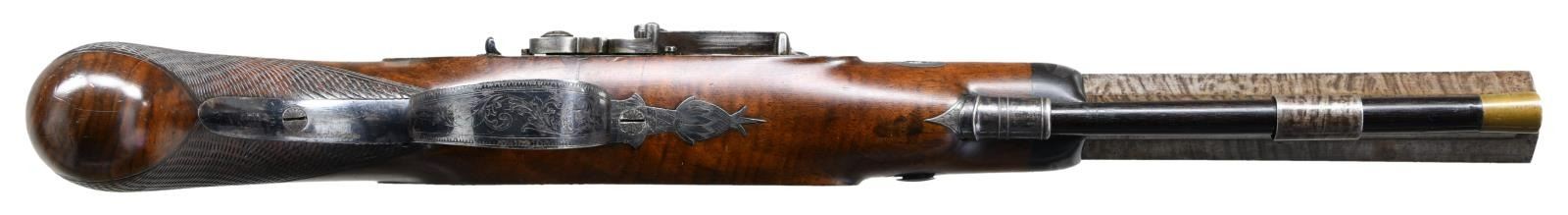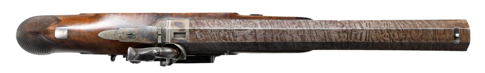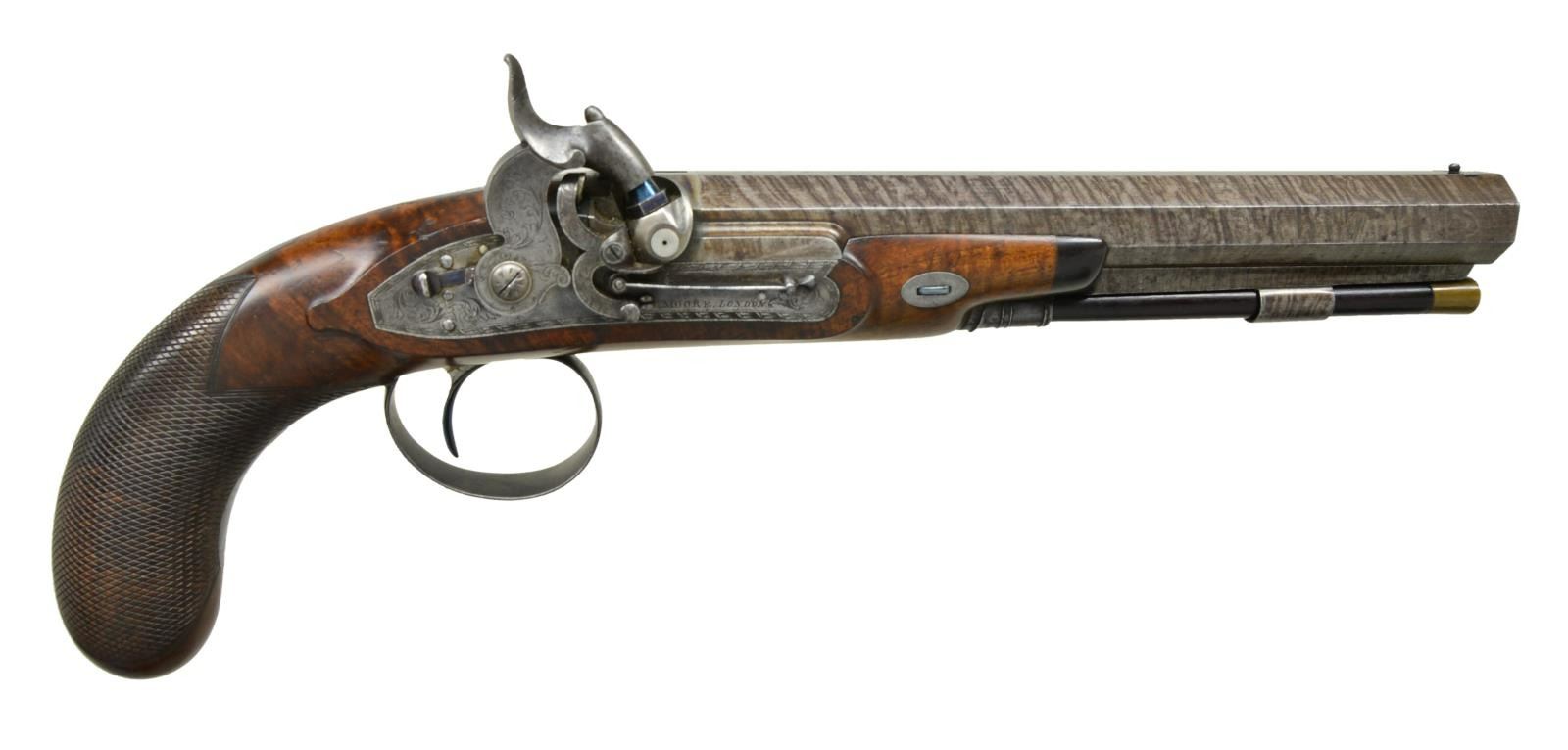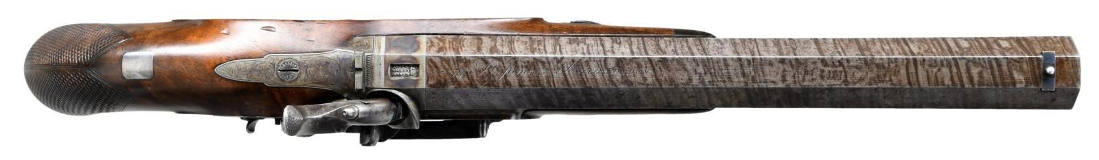 PISTOLS BY CHARLES MOORE. Cal. 50 both. S# 1141 both. The 9" swamped octagon barrels with under ribs, made of nicely patterned stub Damascus are engraved with Maker's "77 St. James's Street" address (CA 1825-42) on top flats. Case hardened patent breeches have inset platinum poincon marked "C. MOORE" "LONDON" "PATENT" all under a crown. Breeches have vented platinum blowouts and are fitted with bases having cups to receive pills or pellets of priming compound. Locks having flat plates are fitted with pivoting levers; one end of each lever has platinum seal that covers pill recess, base portion is shaped so that the fall of the hammer cams cover out of the way allowing firing pin to strike pellet. Flat faced hammer is filed with protrusion to move lever system, head has interchangeable firing pins, retaining spring is on inner side of nose. Locks are also fitted with back sliding safetys that engage at half cock. Locks, hammers etc., are nicely engraved with open scroll within feather borders on plates. Plates are also engraved "C. Moore. LONDON" under feather springs. Root walnut stocks have flat checkered bag grips and horn tips. Trigger plates have pineapple finials, trigger guards have scroll engraving on bows and S#'s on tangs. Stocks attach to barrels with captive side bolts through oval silver escutcheons. Rosewood ramrods with brass tips and tails mount through single plain pipes and well filed steel thimbles. UNATTACHED ACCESSORIES: pistols are housed in their original mahogany case with duel pivoting hook closure and flush mounted circular "D" ring handle. Interior is lined in green cloth and has large paper Charles Moore St. James St. label in lid over another label. Bottom compartments are arranged for pistols and some accessories including copper bodied 3 cavity powder, ball and patch flask by Hawksley marked "FIREPROOF"; steel nutcracker "WD" marked bullet mold for # 38 ball (.490); correct wrench for pill bases (missing handle); case hardened main spring vice; steel nipple wrench (which doesn't fit anything) brass loading rod and unmarked wad punch, for 1 1/4" patches. A covered compartment holds boxwood container inscribed with these pistols S# which contains spare pill bases and firing pins. Another covered compartment contains a pair of percussion hammers. CONDITION: very fine, barrels retaining nearly all of their brown finish with excellent definition to pattern. There is a light scattering of freckling evident. Locks retain most of their case hardening color, fading to gray. Breech irons and patent breeches retain most of case color (possibly redone) engraving somewhat soft. Steel parts retain over 80% charcoal blue. Stocks retain what appears to be most of their original finish. Multi-groove rifled bores show light pitting throughout, locks are fine. The platinum of one poincon is missing, stamping legible. Case retains most of its varnish finish on exterior with many scratches and some splitting on top front. Interior cloth is good with areas of fading and spotting. Label has some rubs through and is lightly foxed. Accessories are generally good. Lid of case has a small chip at left near corner, chip is present and repairable. (01-21882/MGM). ANTIQUE. $15,000-25,000.