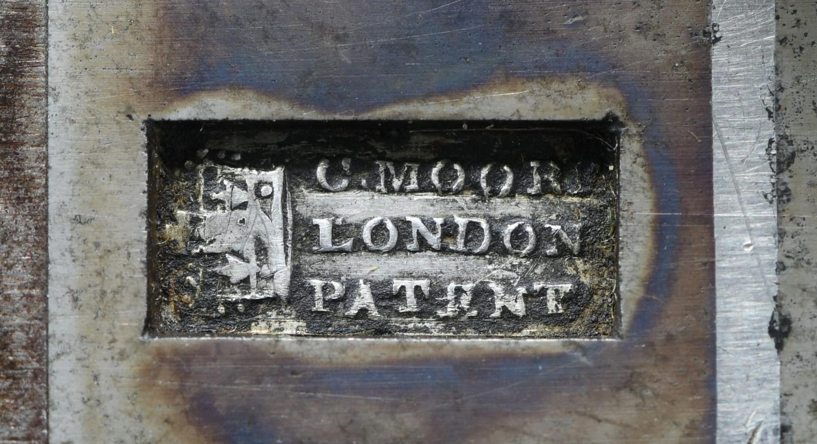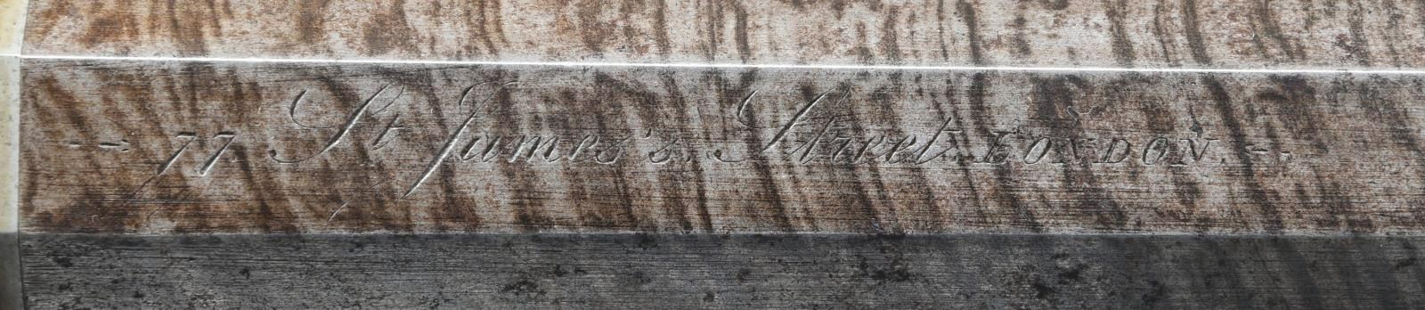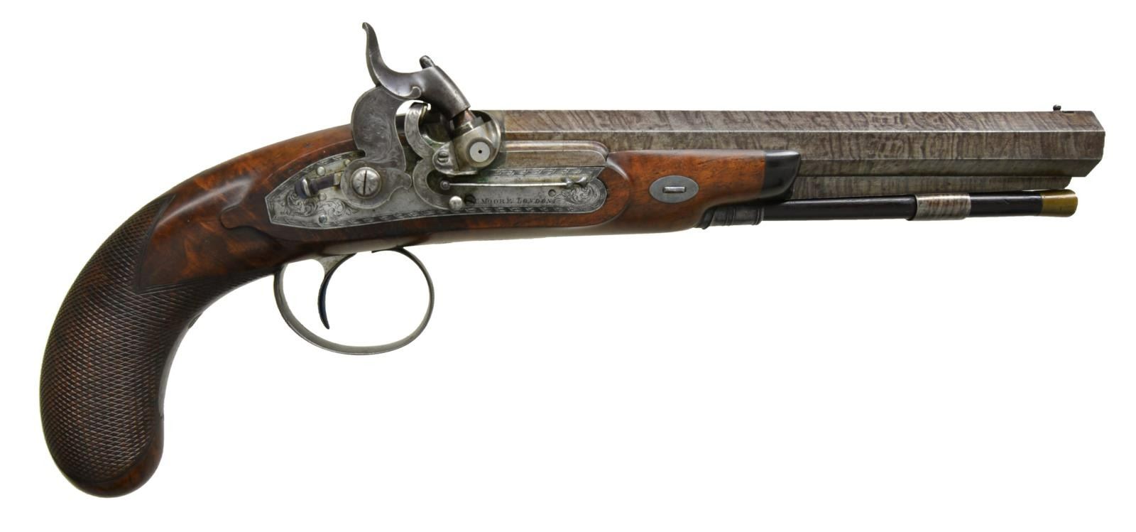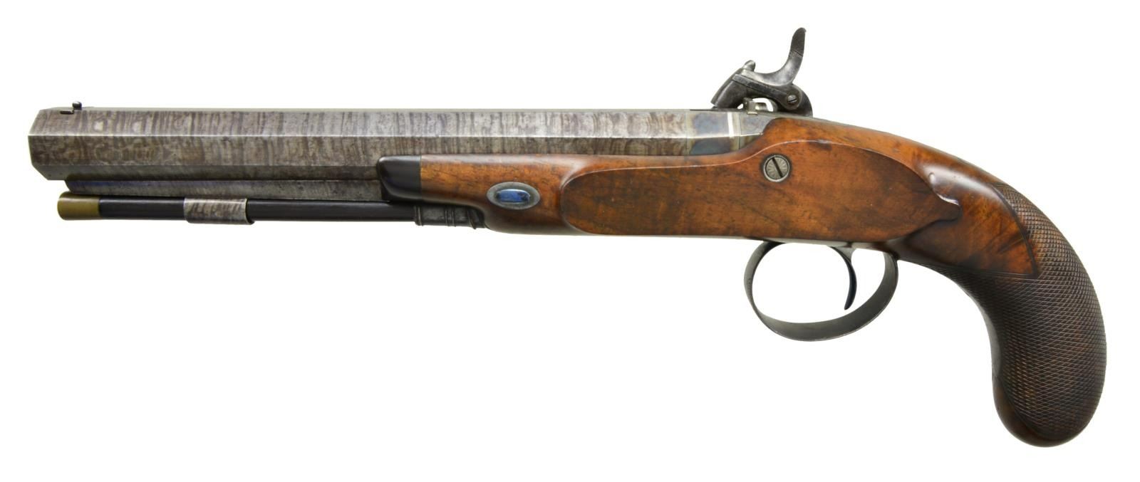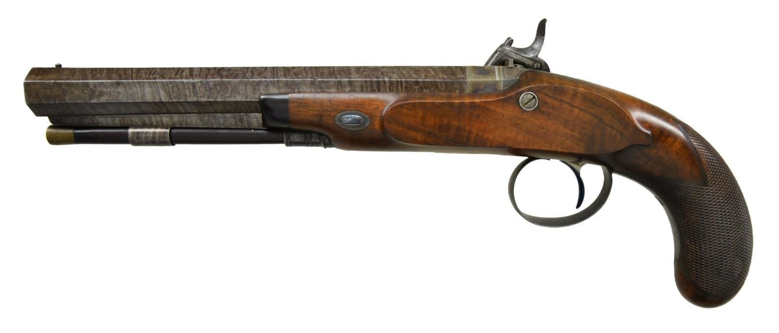 PISTOLS BY CHARLES MOORE. Cal. 50 both. S# 1141 both. The 9" swamped octagon barrels with under ribs, made of nicely patterned stub Damascus are engraved with Maker's "77 St. James's Street" address (CA 1825-42) on top flats. Case hardened patent breeches have inset platinum poincon marked "C. MOORE" "LONDON" "PATENT" all under a crown. Breeches have vented platinum blowouts and are fitted with bases having cups to receive pills or pellets of priming compound. Locks having flat plates are fitted with pivoting levers; one end of each lever has platinum seal that covers pill recess, base portion is shaped so that the fall of the hammer cams cover out of the way allowing firing pin to strike pellet. Flat faced hammer is filed with protrusion to move lever system, head has interchangeable firing pins, retaining spring is on inner side of nose. Locks are also fitted with back sliding safetys that engage at half cock. Locks, hammers etc., are nicely engraved with open scroll within feather borders on plates. Plates are also engraved "C. Moore. LONDON" under feather springs. Root walnut stocks have flat checkered bag grips and horn tips. Trigger plates have pineapple finials, trigger guards have scroll engraving on bows and S#'s on tangs. Stocks attach to barrels with captive side bolts through oval silver escutcheons. Rosewood ramrods with brass tips and tails mount through single plain pipes and well filed steel thimbles. UNATTACHED ACCESSORIES: pistols are housed in their original mahogany case with duel pivoting hook closure and flush mounted circular "D" ring handle. Interior is lined in green cloth and has large paper Charles Moore St. James St. label in lid over another label. Bottom compartments are arranged for pistols and some accessories including copper bodied 3 cavity powder, ball and patch flask by Hawksley marked "FIREPROOF"; steel nutcracker "WD" marked bullet mold for # 38 ball (.490); correct wrench for pill bases (missing handle); case hardened main spring vice; steel nipple wrench (which doesn't fit anything) brass loading rod and unmarked wad punch, for 1 1/4" patches. A covered compartment holds boxwood container inscribed with these pistols S# which contains spare pill bases and firing pins. Another covered compartment contains a pair of percussion hammers. CONDITION: very fine, barrels retaining nearly all of their brown finish with excellent definition to pattern. There is a light scattering of freckling evident. Locks retain most of their case hardening color, fading to gray. Breech irons and patent breeches retain most of case color (possibly redone) engraving somewhat soft. Steel parts retain over 80% charcoal blue. Stocks retain what appears to be most of their original finish. Multi-groove rifled bores show light pitting throughout, locks are fine. The platinum of one poincon is missing, stamping legible. Case retains most of its varnish finish on exterior with many scratches and some splitting on top front. Interior cloth is good with areas of fading and spotting. Label has some rubs through and is lightly foxed. Accessories are generally good. Lid of case has a small chip at left near corner, chip is present and repairable. (01-21882/MGM). ANTIQUE. $15,000-25,000.