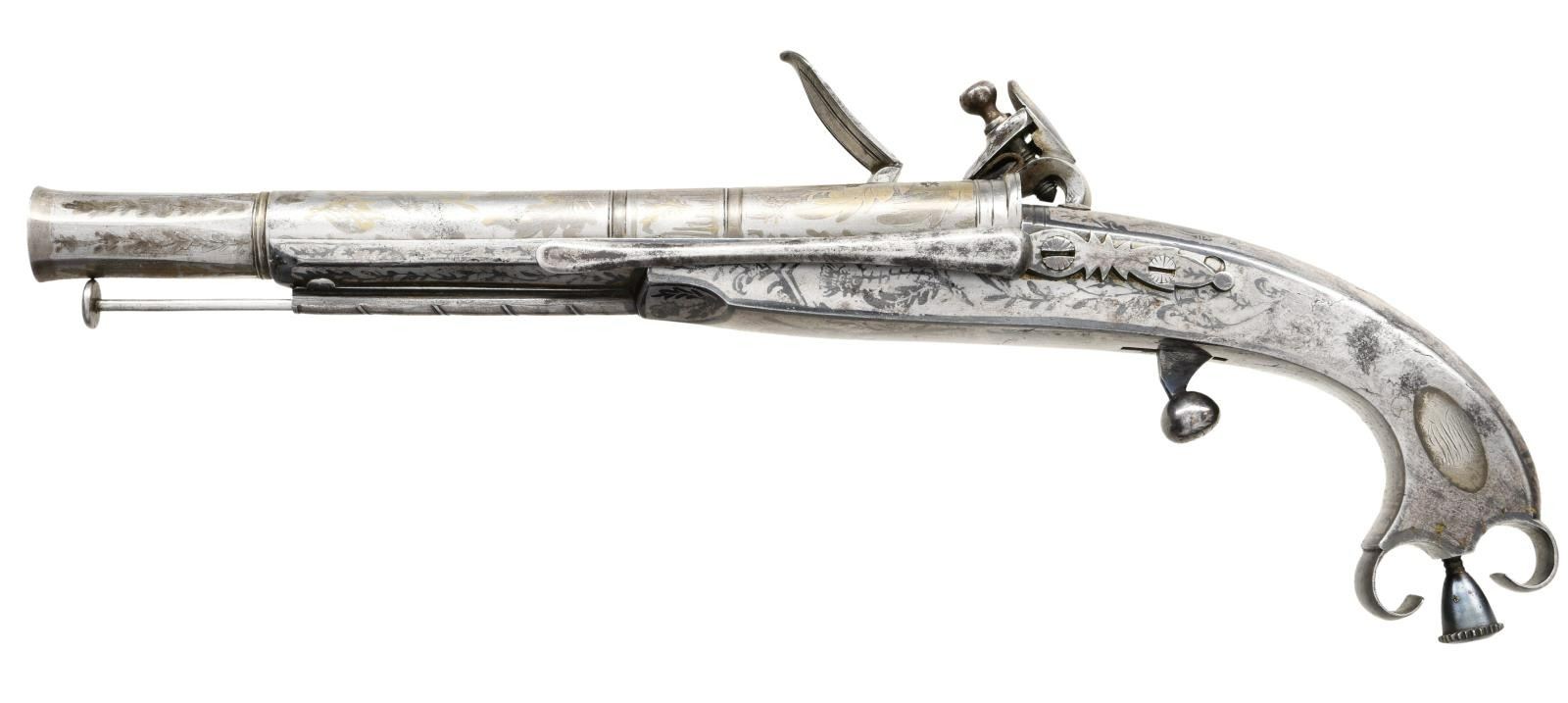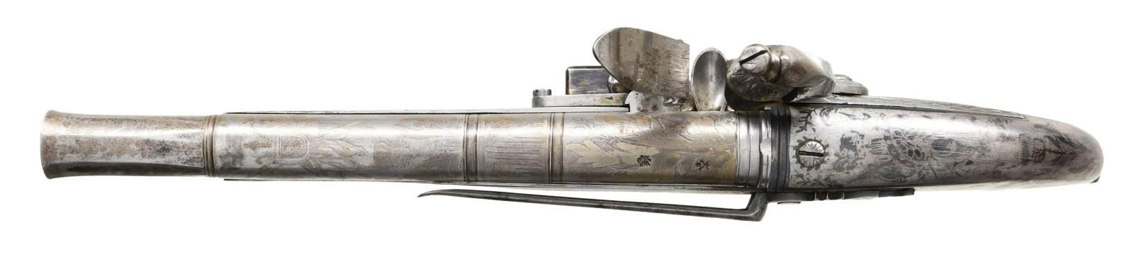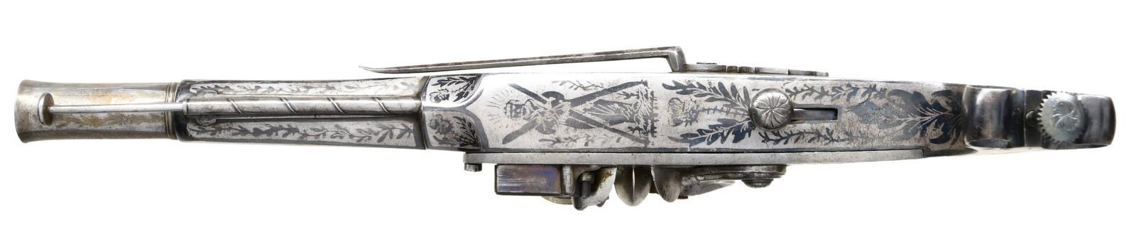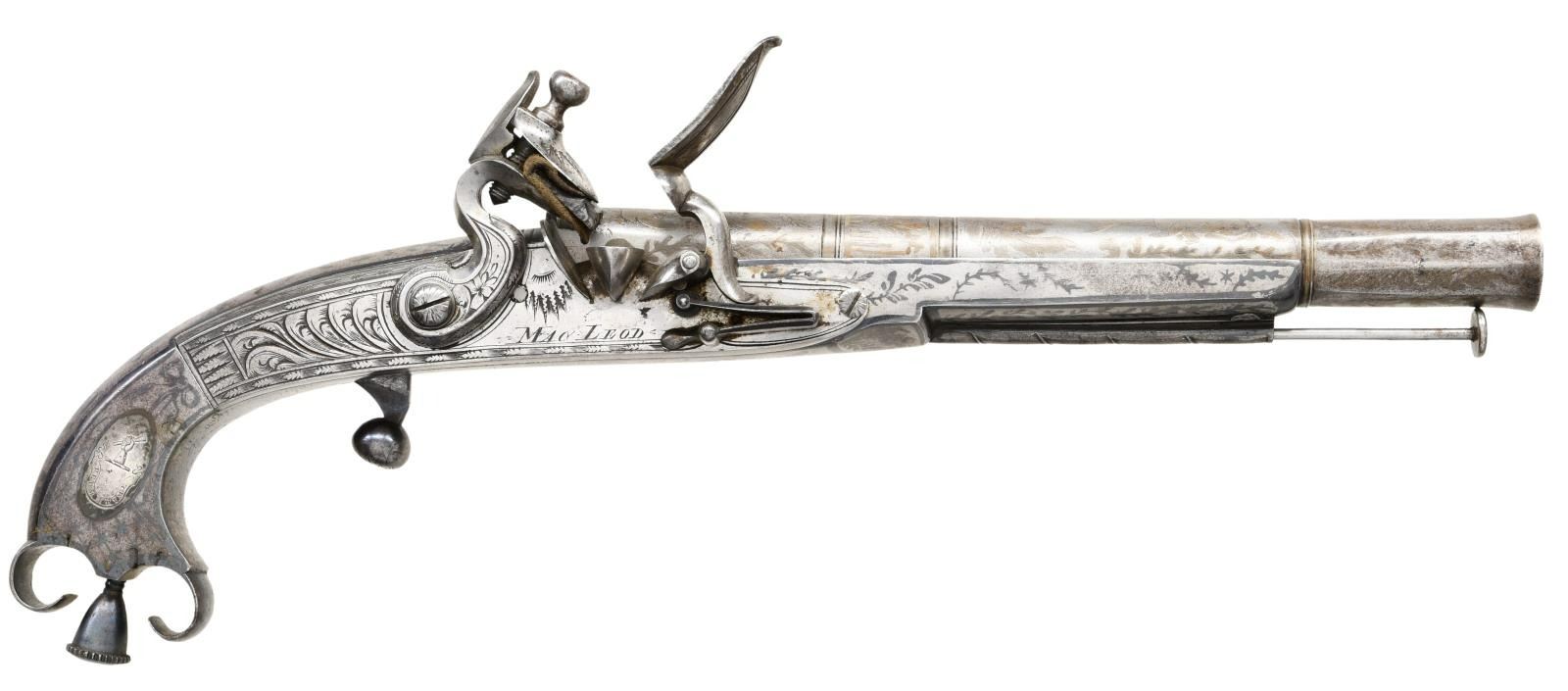 PISTOL BY MACLEOD. Cal. 59. S# NSN. In Britain, the 1830's and 1840's saw a revival of everything "Scottish" and many traditional weapons were reproduced to fit demand. This high quality example with 8-1/8" cast tapered round barrel with high breech section has flared octagonal muzzle. Breech is stamped with Birmingham black powder proofs. Miquelet type lock is fitted with high breasted serpentine cock, waterproof pan and roller frizzen. Feather spring has bulbous finial. "MacLeod" (not listed) is under pan. All metal stock with rams horn butt is fitted with thistle shaped pricker and ball trigger. Inlaid German silver ovals on sides are engraved with family crest of fist holding a club over the motto "DEUM TIME" and with the initials "JWM" (?). A belt hook is attached to left side. Pistol has overall etched decoration on barrel which consists of large acanthus leaves around a central crest. Stock is blued and has had background etched away leaving designs of thistles and other foliage. Bottom portrays a standing man holding two large and long blades or clubs that look like skis. CONDITION: very fine. Appears essentially unfired with only a few flint strikes on frizzen. No rust is evident in pan or bore. Surface presents a pewter gray appearance behind over 70% original blue on stock. Lock retains most of its bright polish and most temper blue remains on feather spring. Mechanically good. (01-21918/MGM). ANTIQUE. $5,000-7,500.