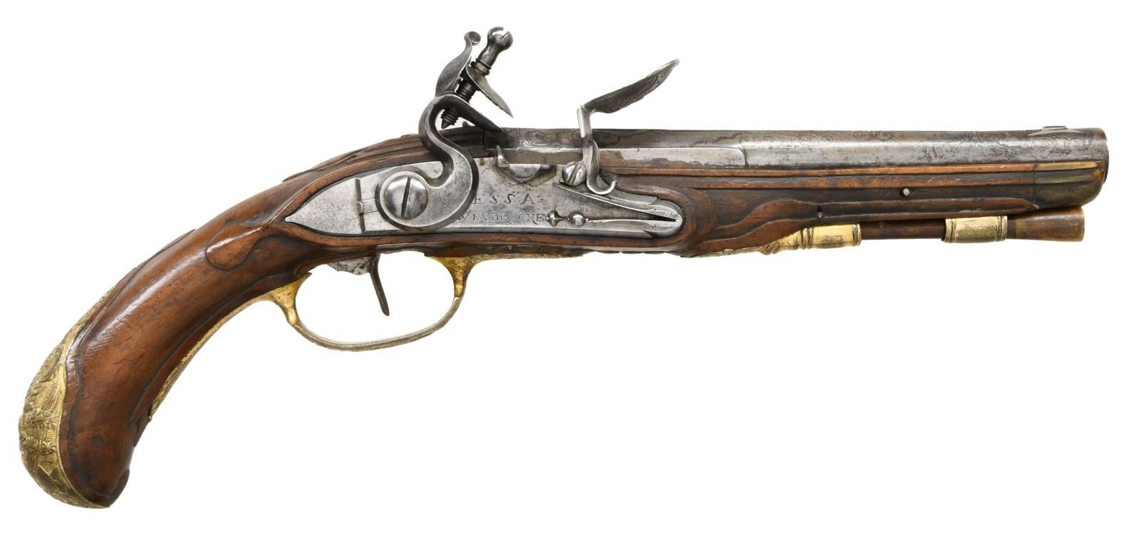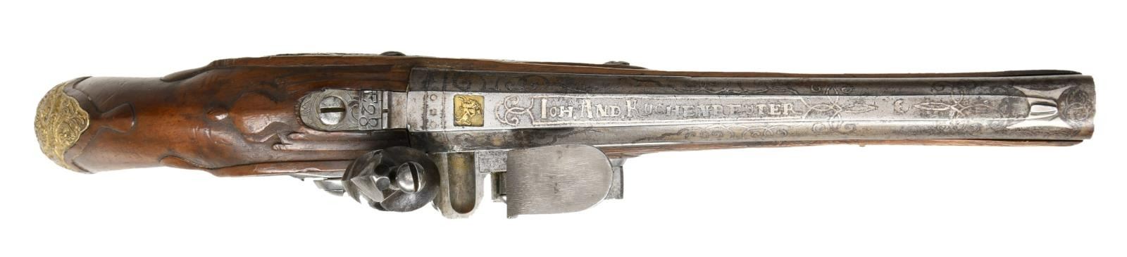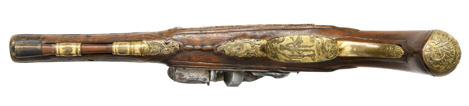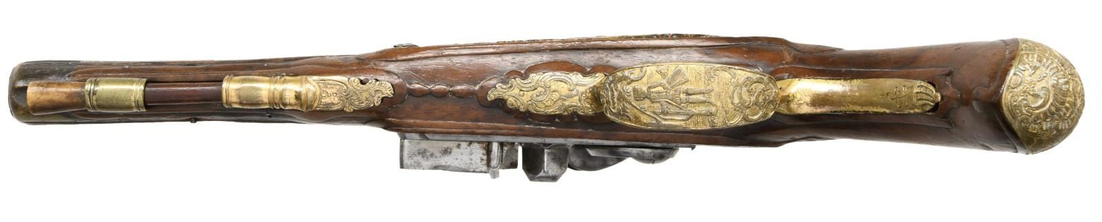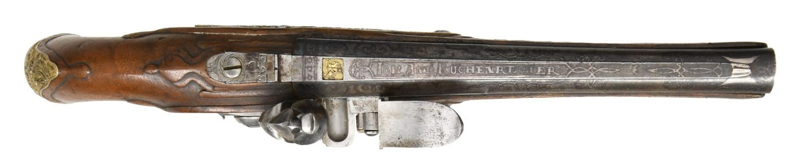 HESS OF SWEIBRUCKEN WITH BARRELS BY JOHANN ANDREAS KUCHENREUTER. Cal. 42. S# NSN. The 6-3/8" ovate scratch rifled barrels with filed in side flats at breech and full tapered top rib are silver inlaid "Ioh. And. Kuchenreuter" on top flat amid some flush scrolled silver inlay. A gold poincon at breech end depict a saber wielding horseman; the early stamp of this noted barrel maker. Silver blade front sight is on flared muzzle. Tang of breech plug is fitted with "V" notch rear sights with flip up long range leaves each engraved "E28". (Johann Andreas Kuchenreuter was working in Bavaria between 1740-1795). Locks with deeply chamfered plates having rebated tails and serpentine cocks are fitted with inset faceted pans, unbridled friction frizzens and feather springs having wide bulbous finials with teats. Sliding safetys are behind cock. Lockplates are engraved "HESS.A." "ZWEYBRUCKEN" (no Hess is listed with first initial A. however, a family of Hess gunsmiths were in Sweibrucken 1720-80). European walnut stocks with birds head grips extend to muzzles with horn tips and are pinned to barrels. Raised carved mouldings are around barrel tangs, lock sideplates, trigger guards, grip caps, ramrods and along barrel channels. Furniture is of relief cast gilded brass and consists of trigger guards with scroll finials, grip caps which cover rears of grips and sideplates with fancy outline. Furniture is decorated with relief cast hunting and animal figures and scrolls. Plain walnut ramrods with horn tips mount through single beaded pipes and matching thimbles. CONDITION: exceptionally fine with a considerable amount of bright polish which remains on iron parts which appears to be original. Stocks retain nearly all of their original oil finish with a good scattering of marks as expected with over 300 years of handling. Furniture retains about half of its original gilt finish. Bores are bright and shiny. Locks are crisp. Pistols appear to have been fired very little if at all. (01-24100/MGM). ANTIQUE. $4,000-6,000.