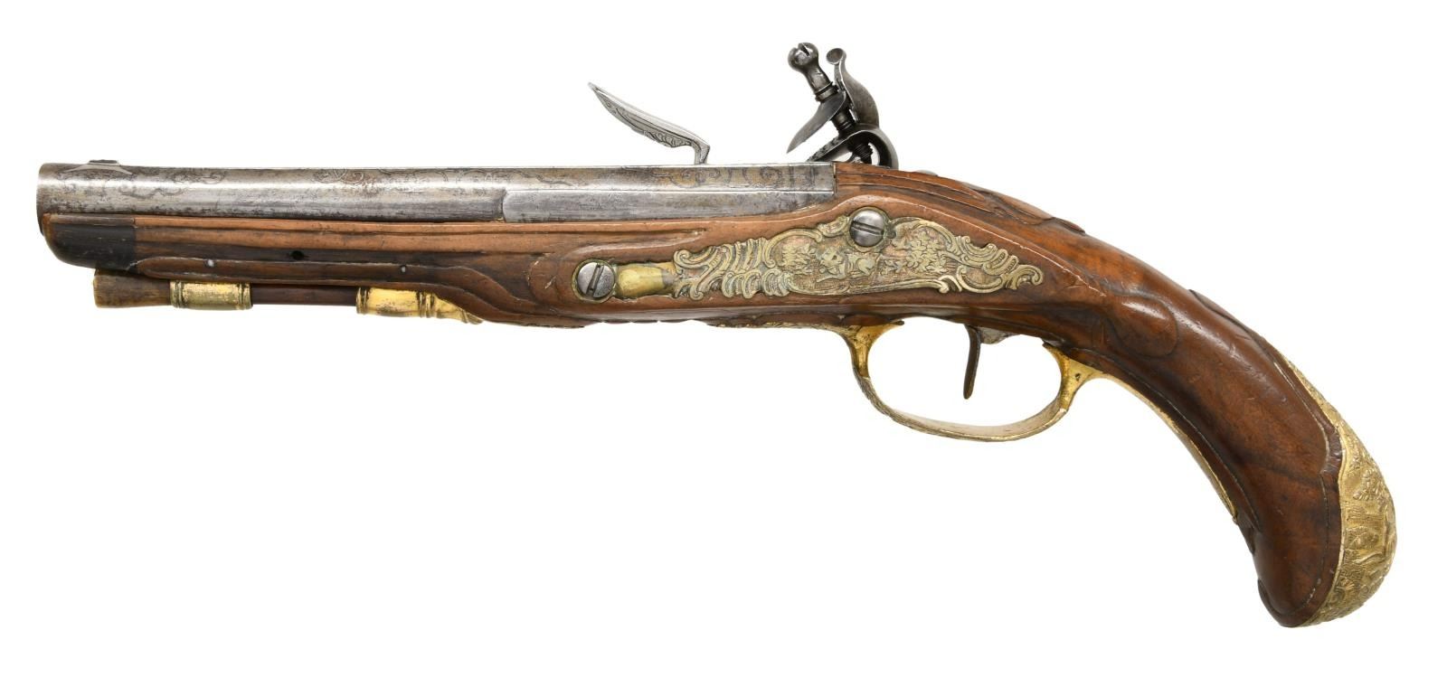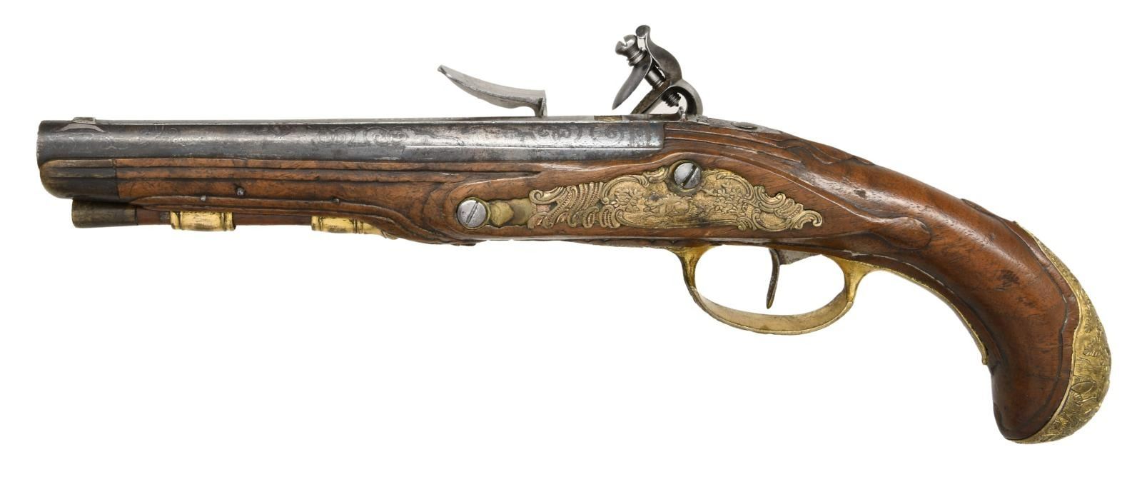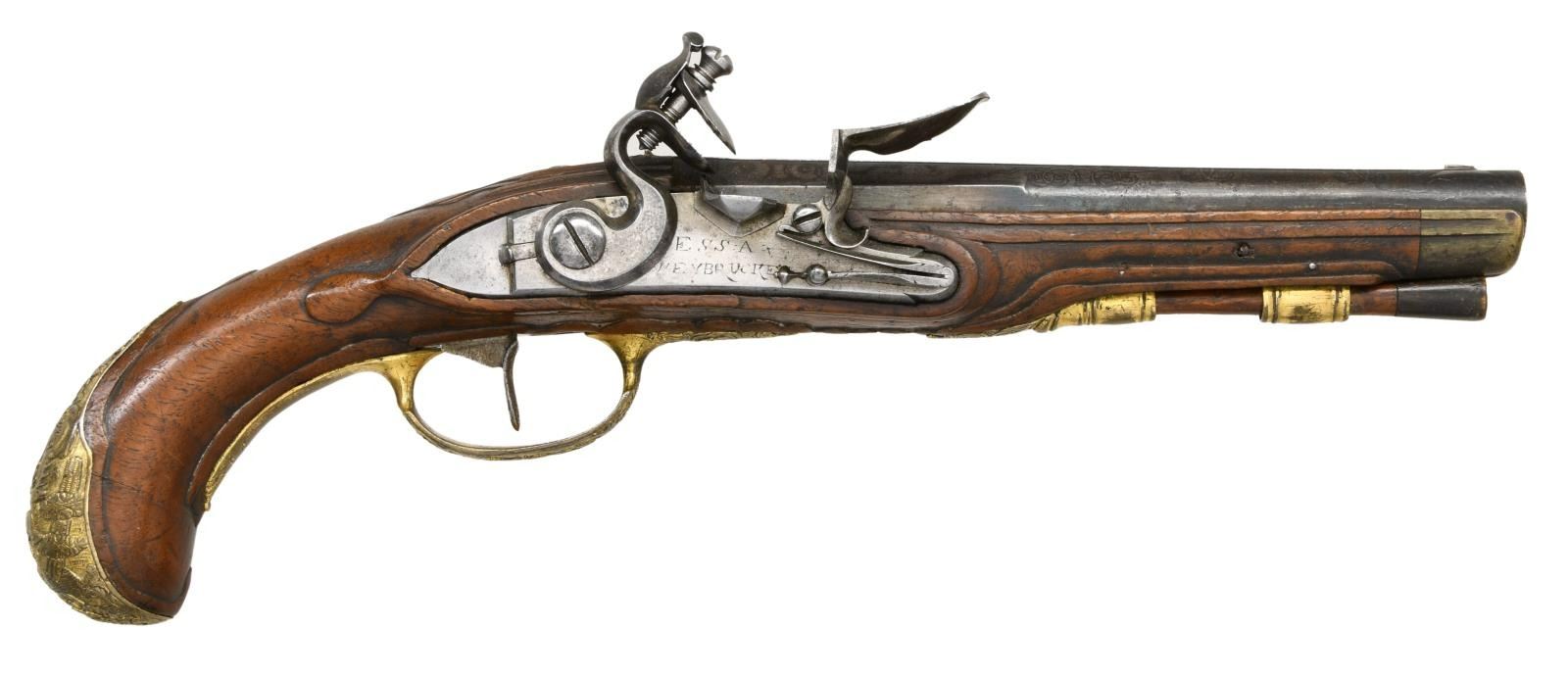 HESS OF SWEIBRUCKEN WITH BARRELS BY JOHANN ANDREAS KUCHENREUTER. Cal. 42. S# NSN. The 6-3/8" ovate scratch rifled barrels with filed in side flats at breech and full tapered top rib are silver inlaid "Ioh. And. Kuchenreuter" on top flat amid some flush scrolled silver inlay. A gold poincon at breech end depict a saber wielding horseman; the early stamp of this noted barrel maker. Silver blade front sight is on flared muzzle. Tang of breech plug is fitted with "V" notch rear sights with flip up long range leaves each engraved "E28". (Johann Andreas Kuchenreuter was working in Bavaria between 1740-1795). Locks with deeply chamfered plates having rebated tails and serpentine cocks are fitted with inset faceted pans, unbridled friction frizzens and feather springs having wide bulbous finials with teats. Sliding safetys are behind cock. Lockplates are engraved "HESS.A." "ZWEYBRUCKEN" (no Hess is listed with first initial A. however, a family of Hess gunsmiths were in Sweibrucken 1720-80). European walnut stocks with birds head grips extend to muzzles with horn tips and are pinned to barrels. Raised carved mouldings are around barrel tangs, lock sideplates, trigger guards, grip caps, ramrods and along barrel channels. Furniture is of relief cast gilded brass and consists of trigger guards with scroll finials, grip caps which cover rears of grips and sideplates with fancy outline. Furniture is decorated with relief cast hunting and animal figures and scrolls. Plain walnut ramrods with horn tips mount through single beaded pipes and matching thimbles. CONDITION: exceptionally fine with a considerable amount of bright polish which remains on iron parts which appears to be original. Stocks retain nearly all of their original oil finish with a good scattering of marks as expected with over 300 years of handling. Furniture retains about half of its original gilt finish. Bores are bright and shiny. Locks are crisp. Pistols appear to have been fired very little if at all. (01-24100/MGM). ANTIQUE. $4,000-6,000.
