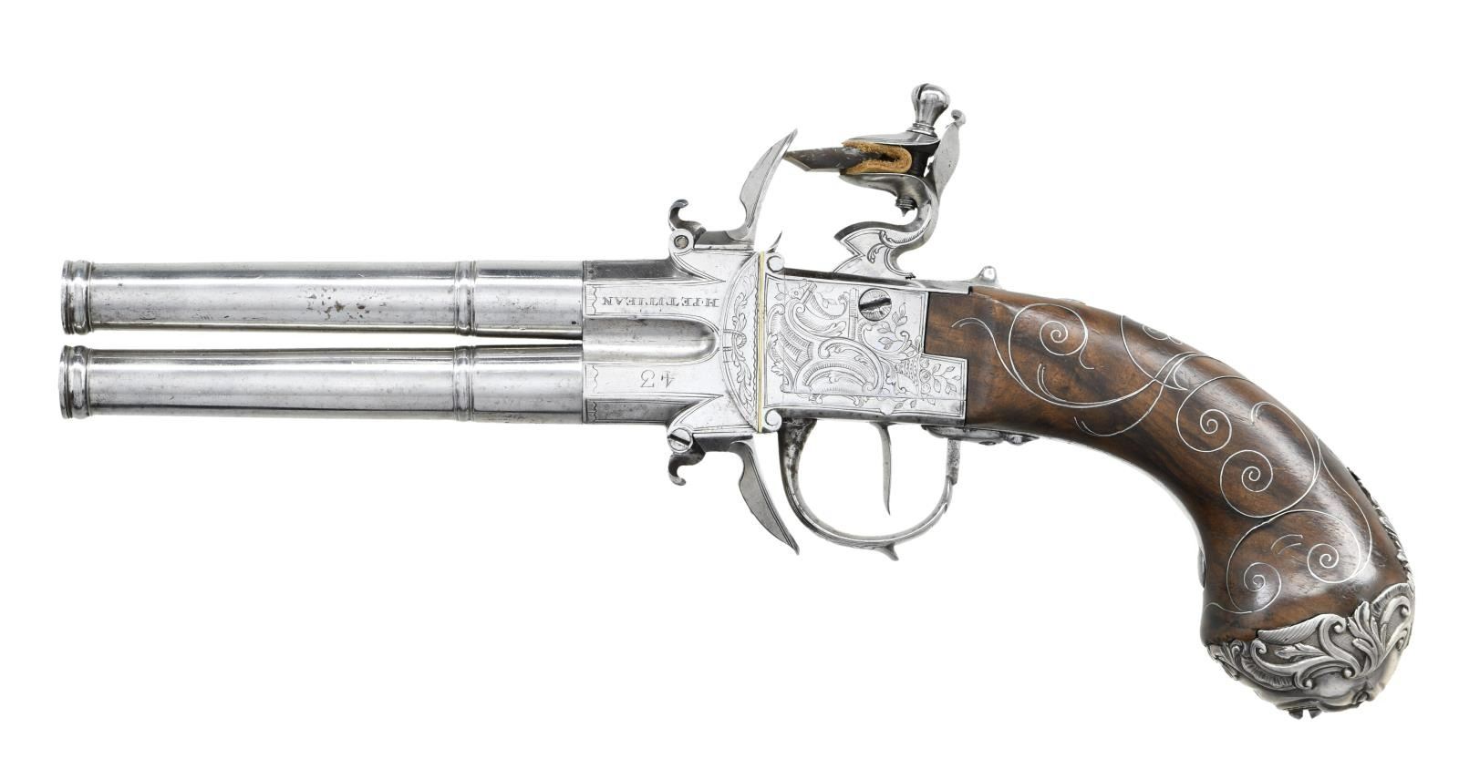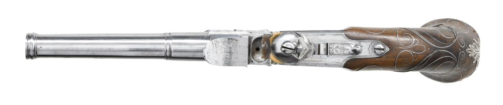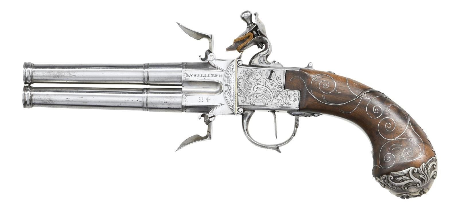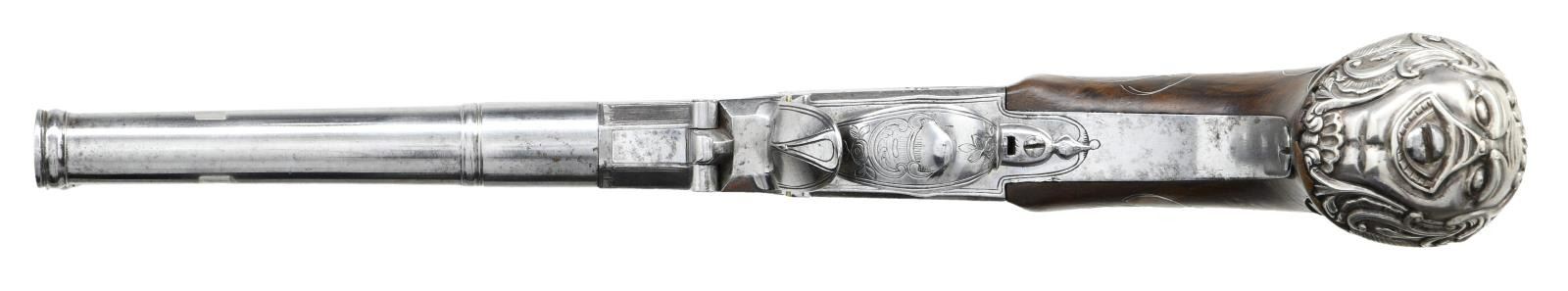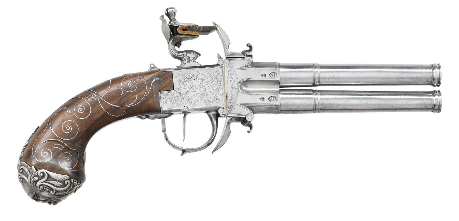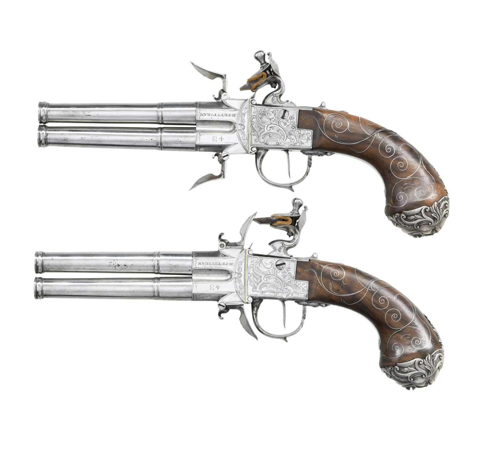 BOXLOCK FLINTLOCK SILVER MOUNTED GREAT COAT PISTOLS RETAILED BY H. PETITJEAN OF LIEGE. Cal. 45 (both). S# 43 (both). The 4-1/4" cannon turned screw off barrels having decorative mid turnings and show no markings. Breech sections rotate and barrels are unlocked by pushing upward on trigger guard bows. There are London gunmaker's proofs on breeches along with crowned "F" proofs, indicating possible foreign origin. Frizzen springs are of hidden type. Retailers name "H. PETTIJEAN" (Liege 1770-99) is engraved along with "43" on sides opposite proofs. Boxlock actions are fitted with serpentine cocks and thumb safeties that engage at half cock. Actions are engraved with elaborate scroll & foliate highlights. Knob grips are of dense European walnut and are mounted with heavy cast silver caps depicting grotesque masks surrounded by scroll and acanthus. No hallmark is visible on the silver. Scrolling silver wire inlay is also present throughout the grip. CONDITION: fine. Iron and steel parts show cleaning to bright and exhibit very little wear. Stocks show some minor marks. Silver is good, unrubbed. 2 small, 1 to 1 1/4" sections of silver wire inlay are lifting. The inlay is present and could be easily reset. Excellent bright & shiny bores. Mechanically fine. (01-23203/MGM/BF). ANTIQUE. $4,000-6,000.