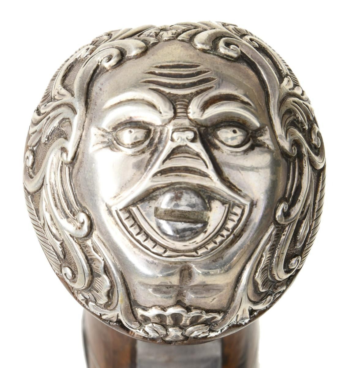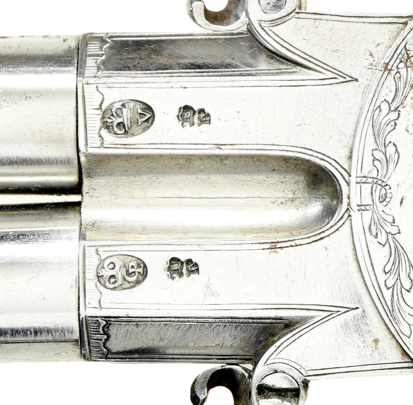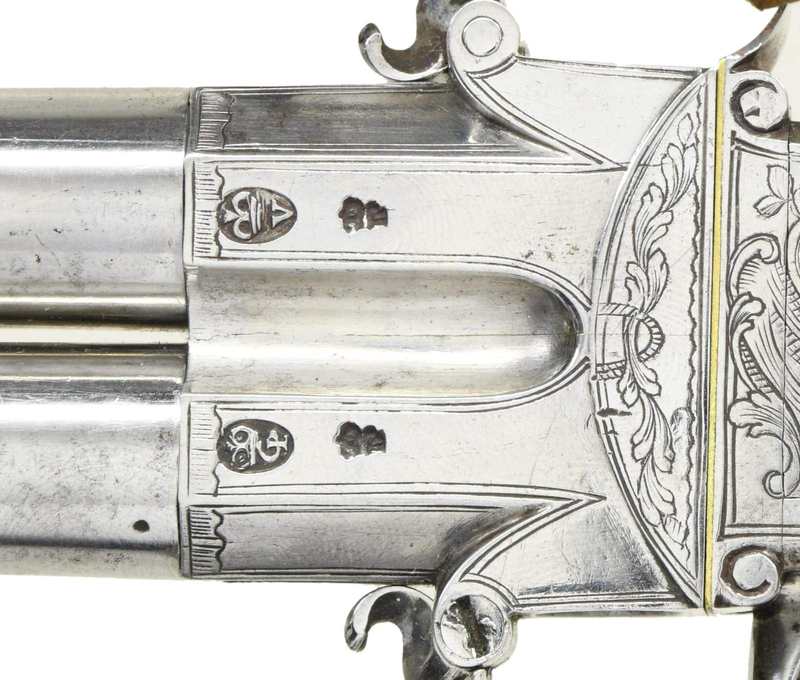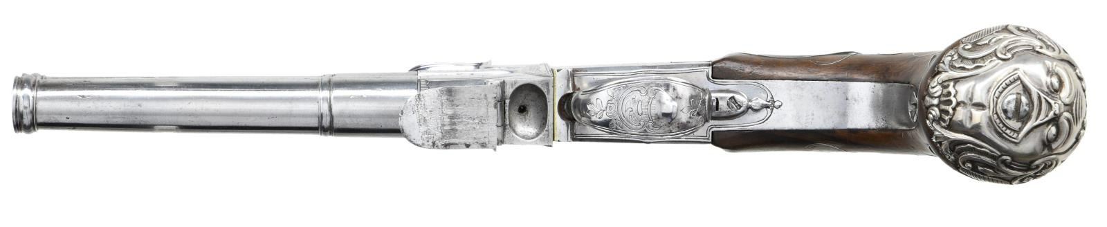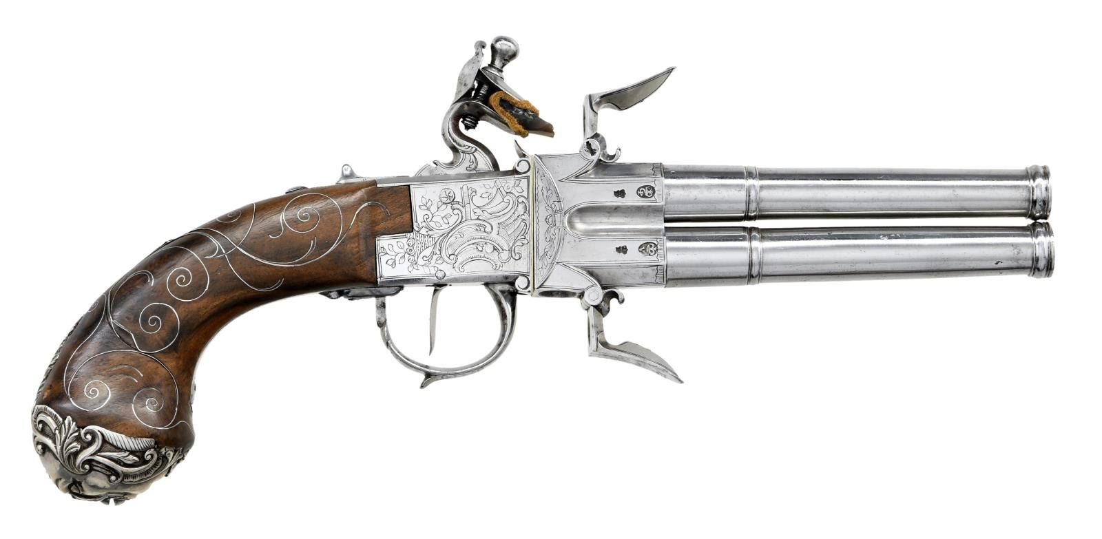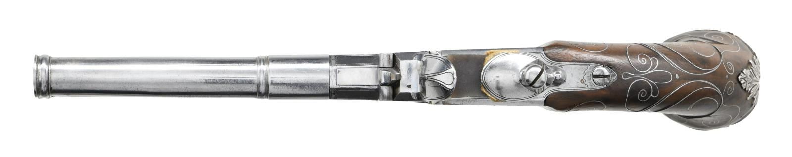BOXLOCK FLINTLOCK SILVER MOUNTED GREAT COAT PISTOLS RETAILED BY H. PETITJEAN OF LIEGE. Cal. 45 (both). S# 43 (both). The 4-1/4" cannon turned screw off barrels having decorative mid turnings and show no markings. Breech sections rotate and barrels are unlocked by pushing upward on trigger guard bows. There are London gunmaker's proofs on breeches along with crowned "F" proofs, indicating possible foreign origin. Frizzen springs are of hidden type. Retailers name "H. PETTIJEAN" (Liege 1770-99) is engraved along with "43" on sides opposite proofs. Boxlock actions are fitted with serpentine cocks and thumb safeties that engage at half cock. Actions are engraved with elaborate scroll & foliate highlights. Knob grips are of dense European walnut and are mounted with heavy cast silver caps depicting grotesque masks surrounded by scroll and acanthus. No hallmark is visible on the silver. Scrolling silver wire inlay is also present throughout the grip. CONDITION: fine. Iron and steel parts show cleaning to bright and exhibit very little wear. Stocks show some minor marks. Silver is good, unrubbed. 2 small, 1 to 1 1/4" sections of silver wire inlay are lifting. The inlay is present and could be easily reset. Excellent bright & shiny bores. Mechanically fine. (01-23203/MGM/BF). ANTIQUE. $4,000-6,000.