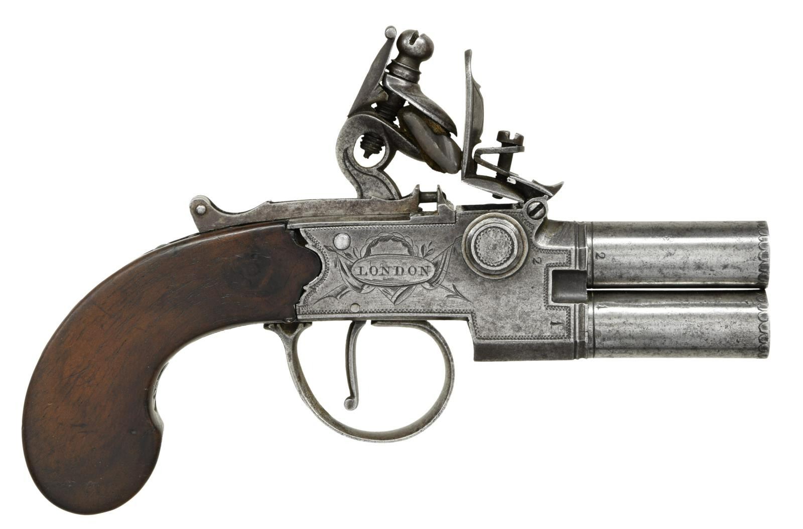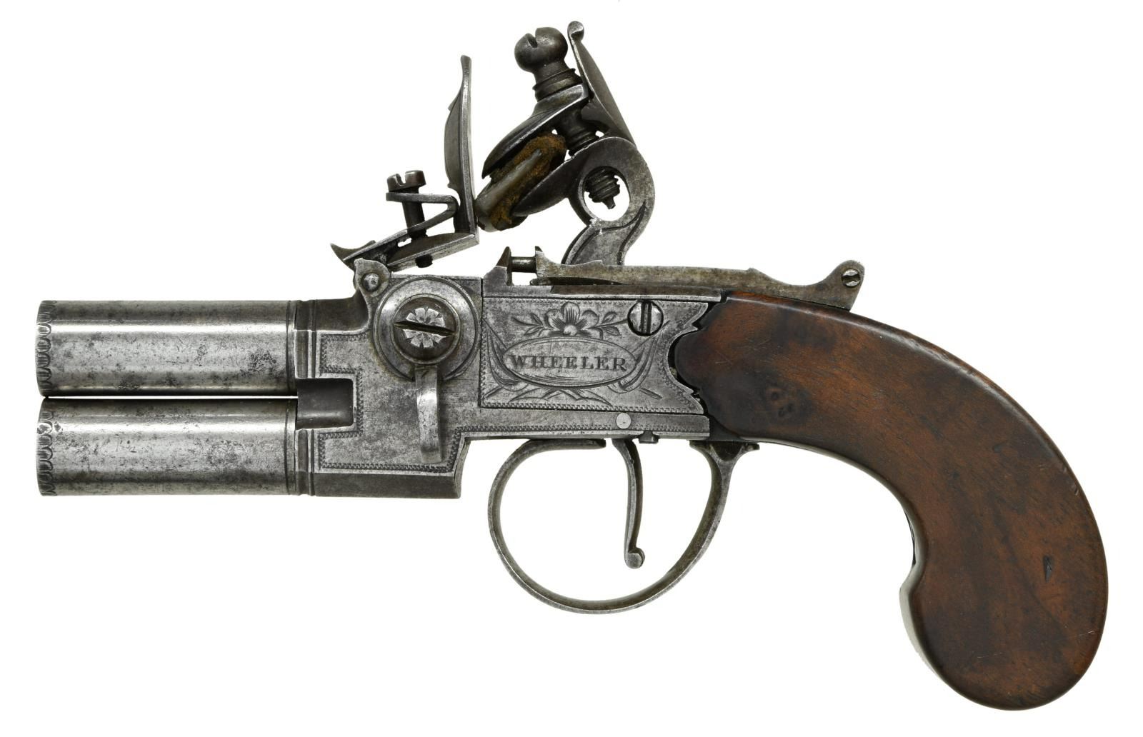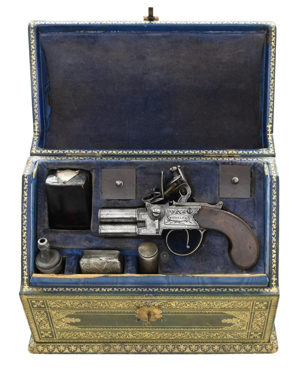 BARREL BOXLOCK FLINTLOCK PISTOL BY WHEELER WITH TOOLS, ETC. Cal. 38. S# NSN. Green Morocco leather covered casket with tip up lid has considerable gold embossing with scrolls, etc. and geometric borders. Interior is lined in blue velvet and has angled display board with compartments. Screw barrel pistol with 1-3/8" barrels is in O/U configuration with pivoting drum in breech section to hold seperate priming charges. London proofs are on bottom. Frizzen has external spring. Boxlock mechanism is fitted with reinforced flint cock and has sliding safety that engages at half cock and also locks frizzen. Left side of action is engraved "WHEELER" (probably Robert working in Birmingham 1766-99) within flag flanked oval device; right side is engraved "LONDON". Pistol is fitted with plain flat sided walnut grip. A vacant silver oval is at back of grip. Accessories consist of, wooden case with slip off top having silver shield engraved "L" which contains fancy bone handled turn screw, vent pick, ramrod, etc. in large compartment. Smaller compartments toward front hold cylindrical powder measure with top marked "Hawksley", a German silver container for balls marked "77" on top, a silver snuff box holding flints with engraved top along with monogram "PB" "Jan 1 st" "1848". Two small compartments toward top hold patches under rosewood covers. CONDITION: pistol exhibits considerable wear. Metal is cleaned gray patina. Wood has old refinish. Bores are good. Mechanically good. Casket is fine. Some gold is fading. Interior cloth is good. Partitions show rubs. Accessories show denting and many marks. Top of tool box has many cracks. (01-23958/MGM). ANTIQUE. $4,500-6,000.