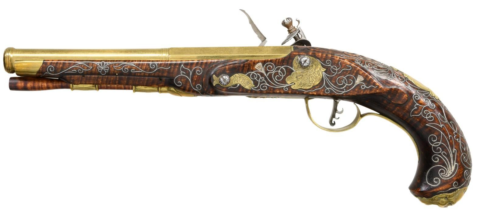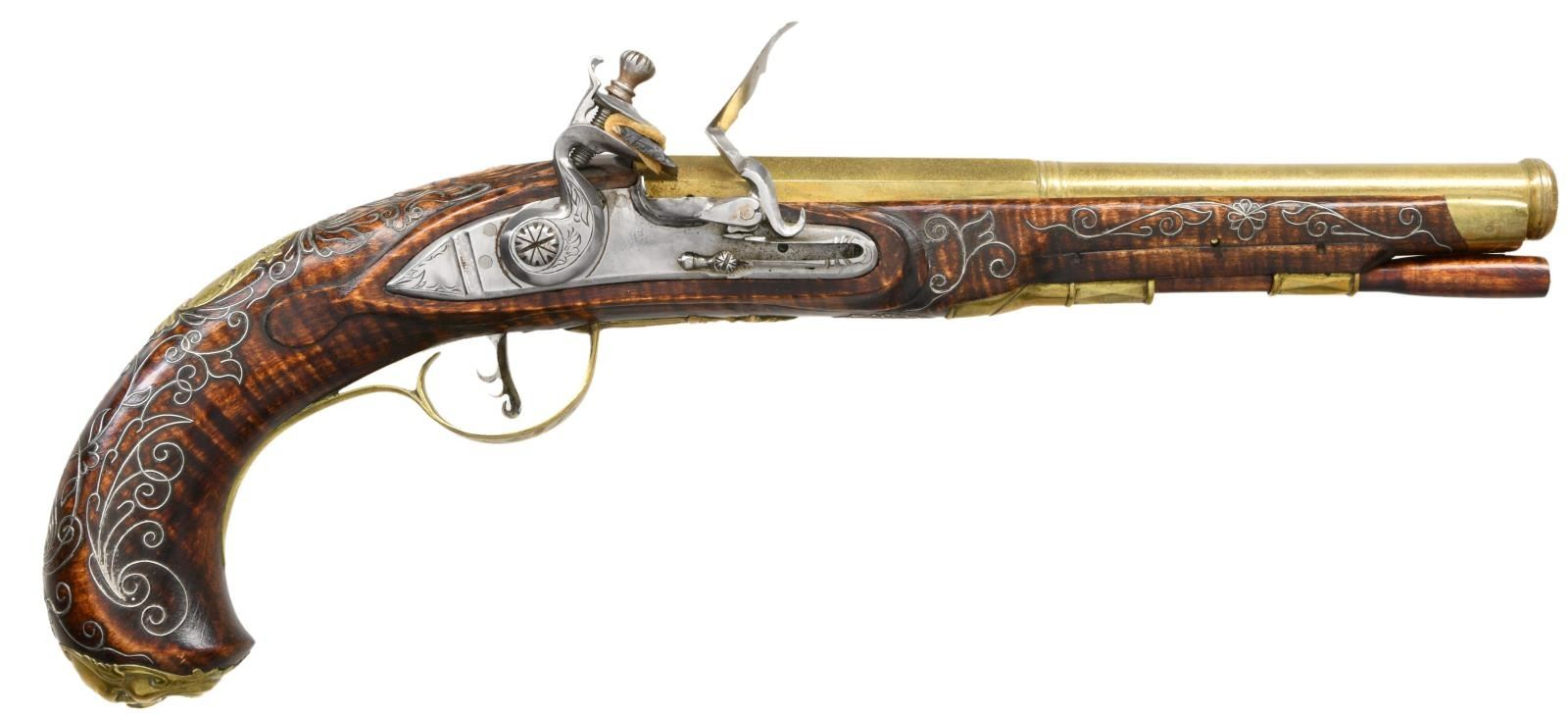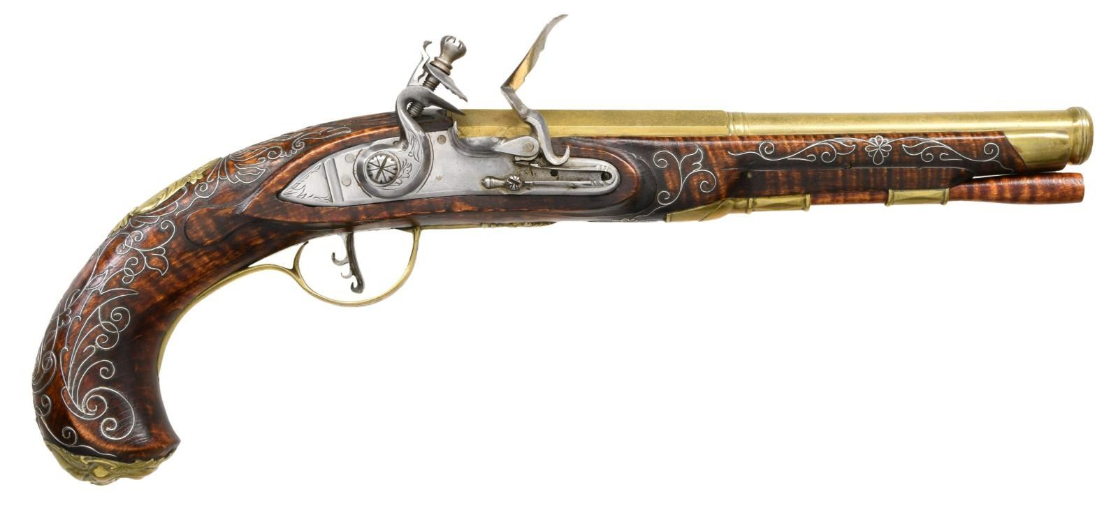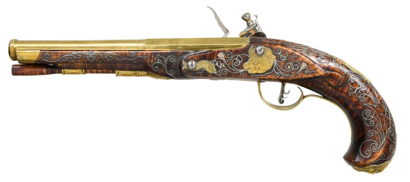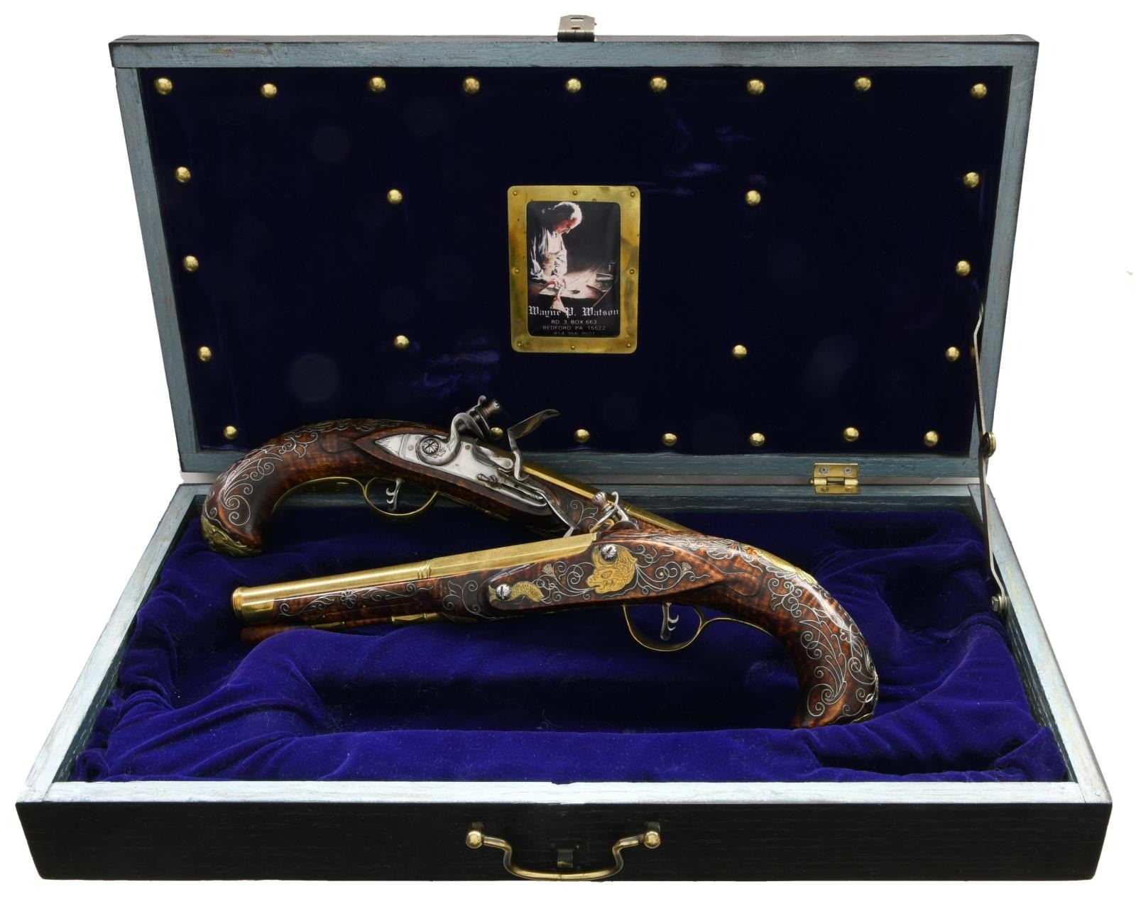 BRITISH STYLE FLINTLOCK PISTOLS BY WAYNE WATSON WITH WOODEN DISPLAY CASE. Cal. 50. S# NSN. Wayne Watson formerly of Bedford, PA now of Ocala, FL is known for making good quality reproduction 18th Century style firearms. He made the "Kill-Deer" rifle for the movie "The Last of the Mohicans". This traditionally styled pair of pistols with a Kentucky flare have 8" octagon to round cannon turned brass barrels engraved "9 W. Watson 5". Flintlocks with chamfered plates and serpentine cocks have inset pans, bridled friction frizzens and feather springs with bulbous finials. Triggers with curled blades have fancy filed backs. Stocks of dense curly grain rock maple extend to just behind muzzle turnings with brass caps and are pinned to barrels. Shell and acanthus carving surrounds barrel tangs and traditional mouldings are around locks, sideplates and along ramrod channels. Furniture is brass and consists of grotesque mask butt caps, trigger guards with husk finials and two piece sideplates in the form of sea monsters and fish. Relief cast crest plates have shell and ribbon finials. Stocks are also embellished with near full coverage silver wire inlay in the form of scrolls, leaves and thistle blossoms. UNATTACHED ACCESSORIES: pistols are housed in their black painted quartered oak display box that is lined in royal blue velvet. Top has velvet secured with brass tacks with central area having brass framed portrait of Wayne Watson working at his bench. CONDITION: very fine, close to "as new" with nearly all original finishes intact. Some flint strikes are evident, but guns appear to be unfired. (01-23922/MGM). ANTIQUE. $3,000-5,000.