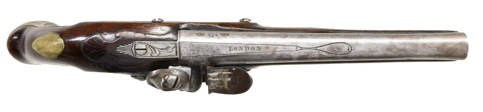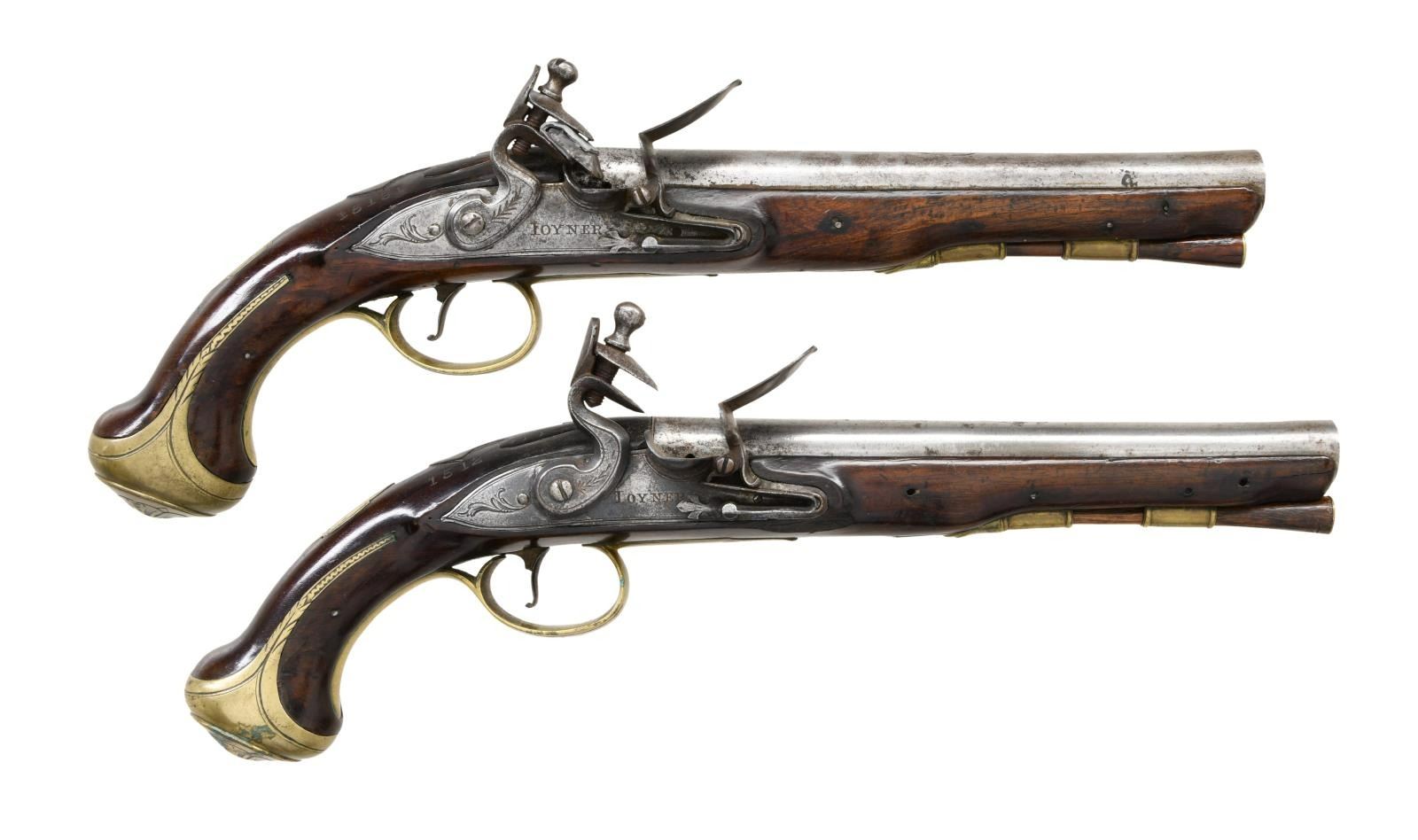 HOLSTER PISTOLS BY JOHN JOYNER. Cal. 60. S# NSN. This attractive pair of pistols have 8" swamped round barrels engraved "LONDON" on tops. London gunmakers proofs and the initials "IJ" are at top left of breech ends. Locks with rounded plates and high breasted serpentine cocks have integral pans, unbridled friction frizzens and feather springs with fleur-de-lis finials. Lockplates have line border engraving and scroll on tails. "Ioyner" is at centers under pans (John Joyner working in London 1761-1780). Dark European walnut stocks extend to muzzles and are pinned to barrels. Brass mounts are line border engraved with some floral highlights. Knob grip caps have side spurs. Side plates are attractively skeletonized. There is some attractive raised carving around barrel tangs and the #'s "1512" "15131" are to the right of this carving. Hickory ramrods have brass caps and mount through beaded single brass pipes and matching thimbles. CONDITION: good. Metal parts cleaned to silver gray. Locks with light pitting. Stocks have old oil refinish over many marks. Brass is good, nicely toned. Bores are pitted. Locks operable. There are no noted repairs or replacement parts. Stocks are sound with no noted cracks or loses except a 1" chip at lower front lockplate of gun 1512. (01-24077/MGM). ANTIQUE. $4,000-6,000.