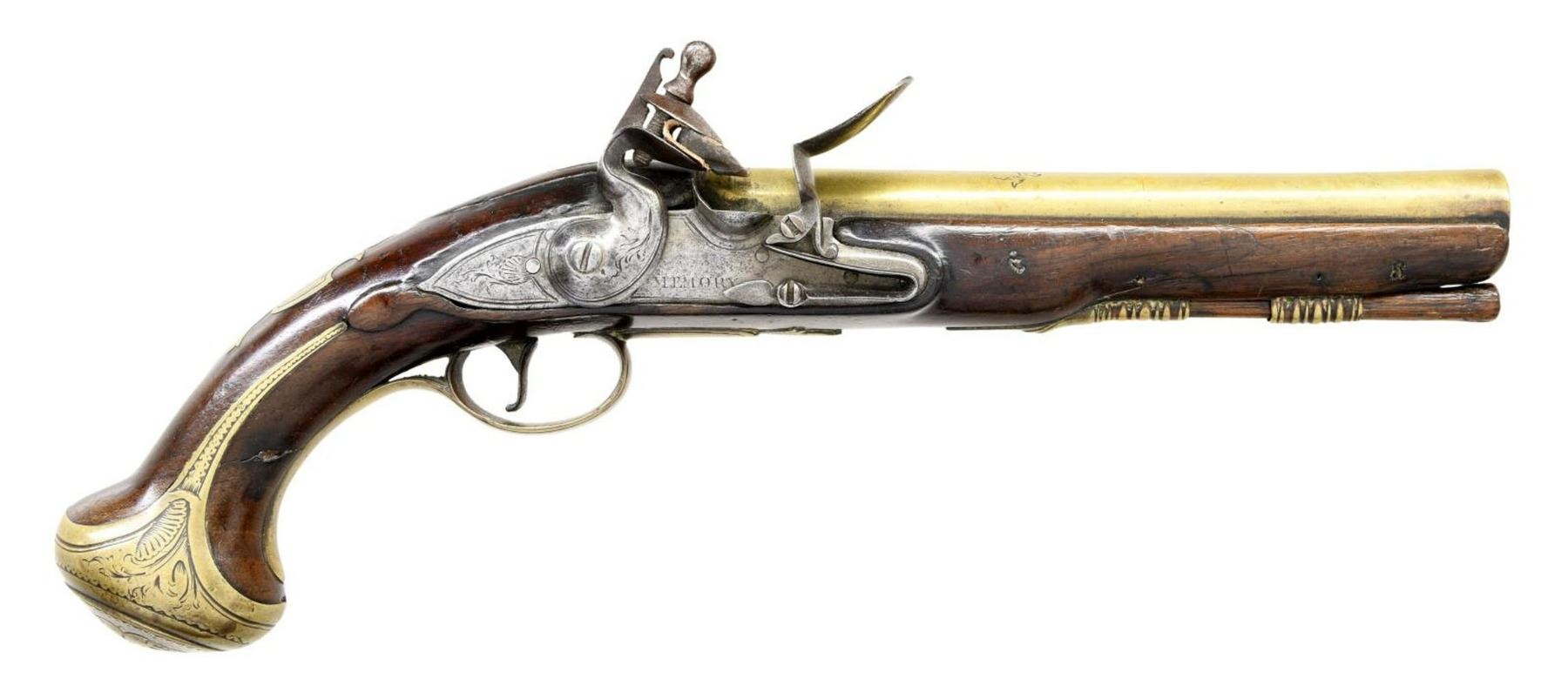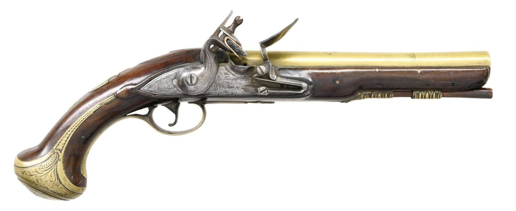 FLINTLOCK HOLSTER PISTOLS BY MICHAEL MEMORY THE ELDER. Cal. 62. S# NSN. The 7" swamped round brass barrels are engraved "SOUTHWARK" on tops amid some decorative lines and scrolls. London gunmakers proofs and barrel maker's initials "TH" are at left sides. Locks with rounded plates and serpentine cocks have integral rounded pans, unbridled friction frizzens and feather springs with spear finials. Locks have line border engraving and simple scroll. "MEMORY" is at centers under pans (Michael Memory working 1749-1780 father of Michael 1783-1798). European walnut stocks with small beavertails around barrel tangs extend to muzzles and are pinned to barrels. There are decorative mouldings around locks and sideplates. Stocks are brass mounted. Trigger guards have husk finials, grip caps have side spurs, fancy sideplates have three piercings and are of scroll form. There are brass crest plates at tops of grips. All mounts are nicely engraved with line and geometric borders with some scroll and floral highlights. Plain hickory ramrods mount through single multi beaded pipes and matching thimbles. CONDITION: fair to good. Locks cleaned to silver gray. Brass shows considerable wear from cleaning and has toned to mustard gold. Stocks with old oil refinish show a few cracks with replaced front 3" on one pistol and some losses of wood and replaced piece at muzzle on the other; otherwise stocks are sound. Bores are good. Locks operable; one cock replaced. (01-24076/MGM). ANTIQUE. $3,500-6,000.