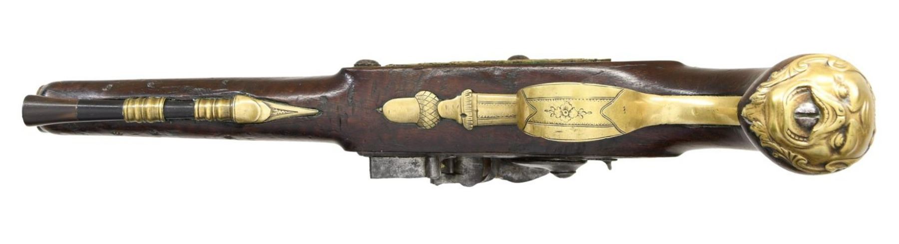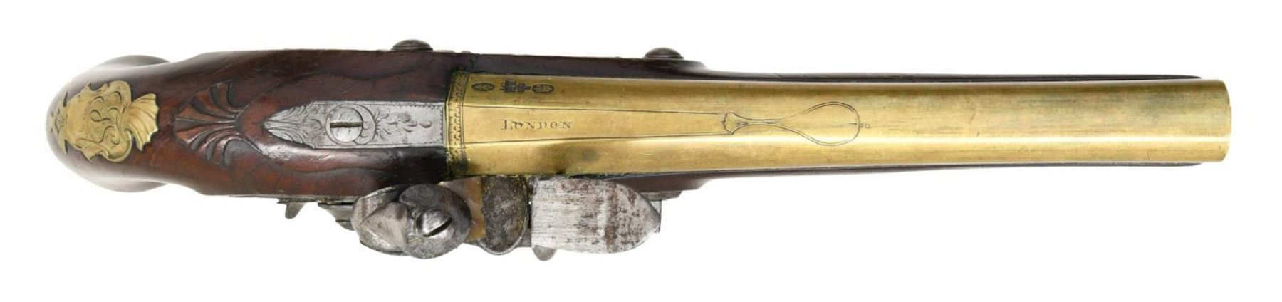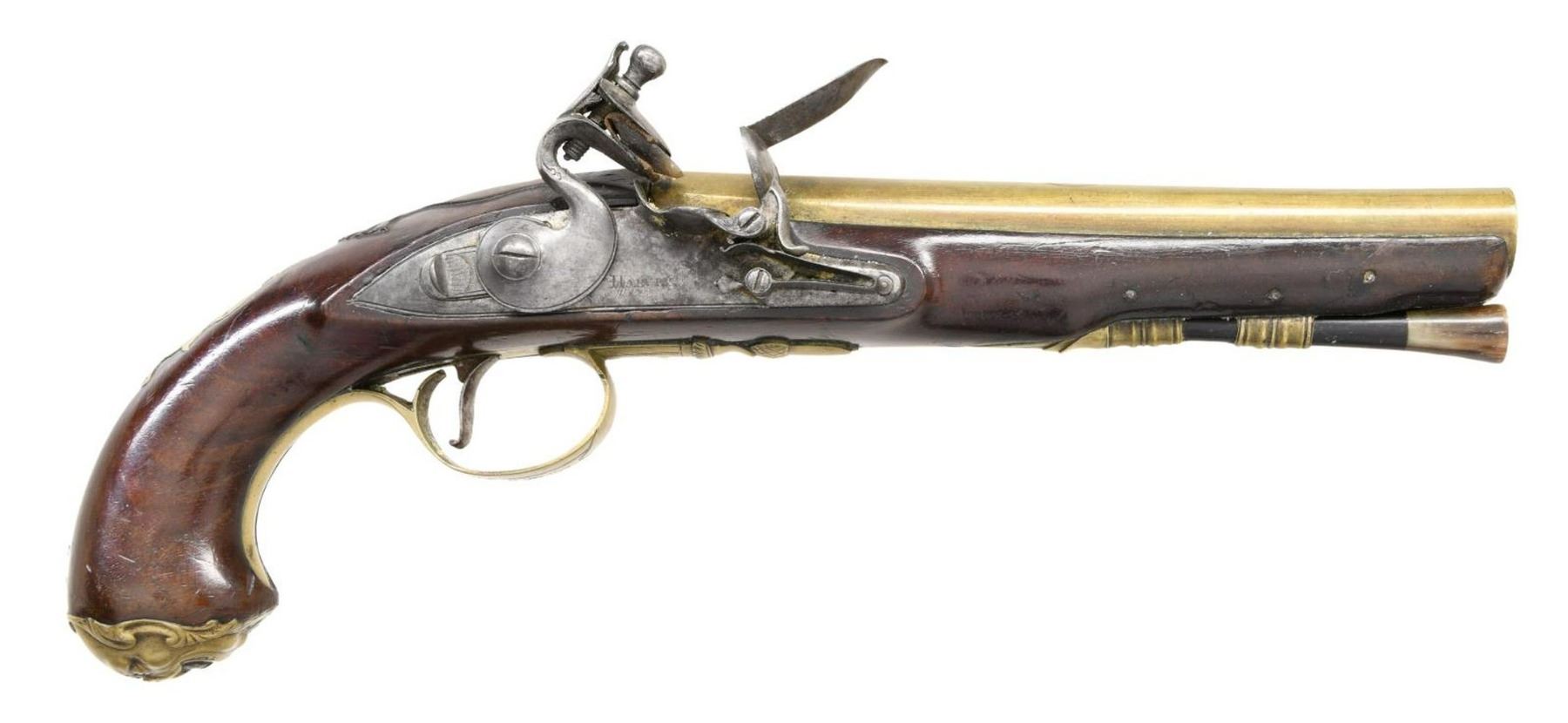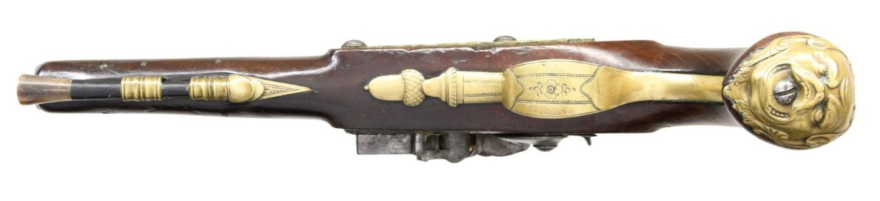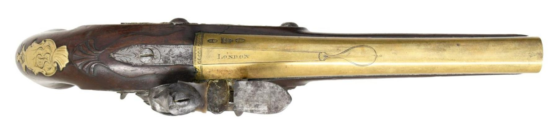 FLINTLOCK OFFICERS OR HOLSTER PISTOLS ENGRAVED HARVEY. Cal. 60. S# NSN. Robert Harvey was a very famous early London gunmaker apprenticed to John Dafte. Harvey's working dates were between 1702-1725. These pistols obviously date to a much later period, most likely after 1765. It appears that a good quality pair of pistols; possibly by the well known Robert Wilson (barrel maker's mark is stamped over "RW"); were re-engraved and marked "Harvey". This work was most likely done in the late 18th Century to capitalize on the famous Harvey name. The 7" brass ovate to round swamped barrels are engraved "London" on top flat. London gunmaker's proofs are on top left flats. Barrel maker's mark is over stamped with "RH" under a fleur-de-lis. The remnants of the original mark appears to be "RW". The round bodied locks with wide bodied serpentine cocks have early style waterproof pans, bridled friction frizzens, and feather springs with bulbous finials. Locks are fitted with back sliding safetys that engage at half cock. Component parts are line border engraved and "Harvey" is at center of locks. European walnut stocks extend to muzzles and are pinned to barrels. There are raised mouldings with shell finials around barrel tangs. Pistols are brass mounted. Trigger guards have acorn finials, butt caps are in the form of grotesque faces and there are shell topped crest plates at tops of grips engraved with the monogram "TS" ?. Sideplates are relief cast with flags and scrolls. Ebony ramrods with horn tips and steel worm tails are mount through multi beaded single pipes and matching thimbles. CONDITION: fine to very fine. Iron parts exhibit dark gray patina with overall light pitting, with evidence of old cleaning. Stocks retain most of what appears to be their original finish which shows considerable wear and some added oil. There are no noted repairs or cracks around locks. There are some repaired cracks toward muzzles of both pistols. Brass is toned to a golden mustard hue. Bores are good. Mechanically good without any noted repairs or restored parts. A very interesting, good quality pair of pistols. (01-24072/MGM). ANTIQUE. $4,000-5,000.