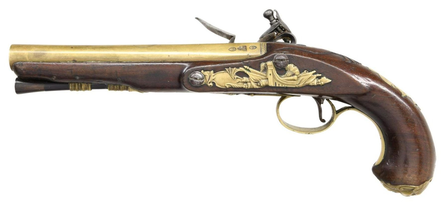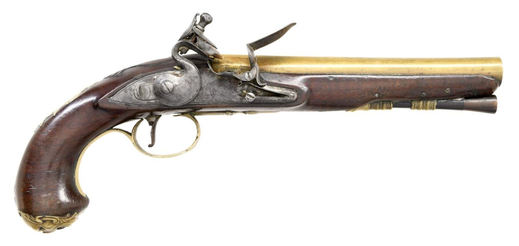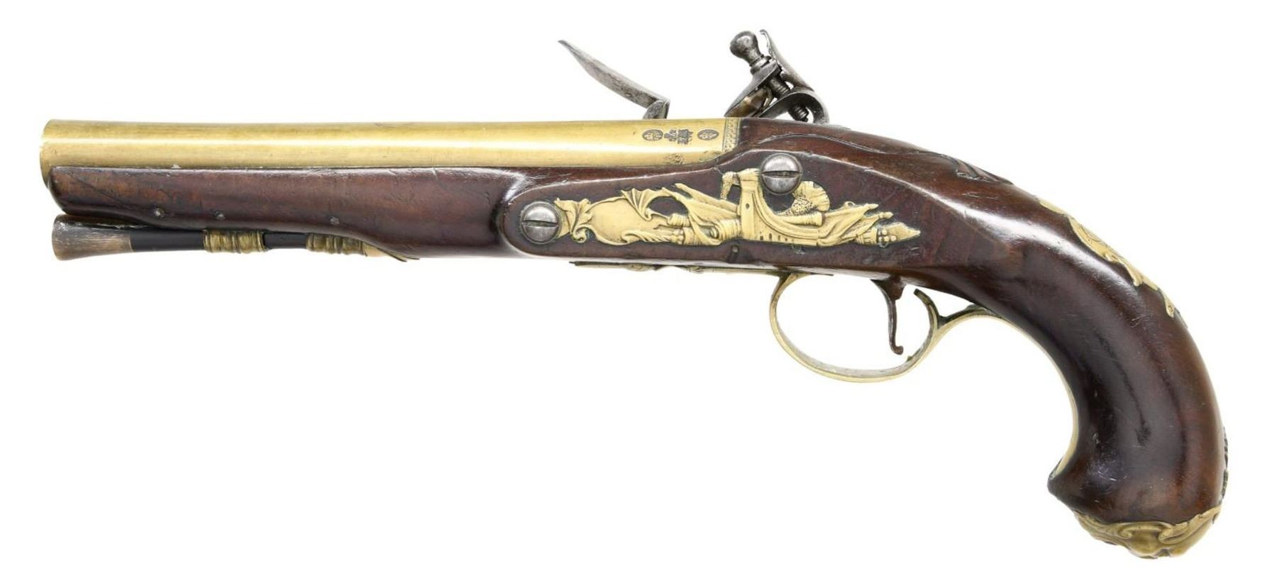 FLINTLOCK OFFICERS OR HOLSTER PISTOLS ENGRAVED HARVEY. Cal. 60. S# NSN. Robert Harvey was a very famous early London gunmaker apprenticed to John Dafte. Harvey's working dates were between 1702-1725. These pistols obviously date to a much later period, most likely after 1765. It appears that a good quality pair of pistols; possibly by the well known Robert Wilson (barrel maker's mark is stamped over "RW"); were re-engraved and marked "Harvey". This work was most likely done in the late 18th Century to capitalize on the famous Harvey name. The 7" brass ovate to round swamped barrels are engraved "London" on top flat. London gunmaker's proofs are on top left flats. Barrel maker's mark is over stamped with "RH" under a fleur-de-lis. The remnants of the original mark appears to be "RW". The round bodied locks with wide bodied serpentine cocks have early style waterproof pans, bridled friction frizzens, and feather springs with bulbous finials. Locks are fitted with back sliding safetys that engage at half cock. Component parts are line border engraved and "Harvey" is at center of locks. European walnut stocks extend to muzzles and are pinned to barrels. There are raised mouldings with shell finials around barrel tangs. Pistols are brass mounted. Trigger guards have acorn finials, butt caps are in the form of grotesque faces and there are shell topped crest plates at tops of grips engraved with the monogram "TS" ?. Sideplates are relief cast with flags and scrolls. Ebony ramrods with horn tips and steel worm tails are mount through multi beaded single pipes and matching thimbles. CONDITION: fine to very fine. Iron parts exhibit dark gray patina with overall light pitting, with evidence of old cleaning. Stocks retain most of what appears to be their original finish which shows considerable wear and some added oil. There are no noted repairs or cracks around locks. There are some repaired cracks toward muzzles of both pistols. Brass is toned to a golden mustard hue. Bores are good. Mechanically good without any noted repairs or restored parts. A very interesting, good quality pair of pistols. (01-24072/MGM). ANTIQUE. $4,000-5,000.