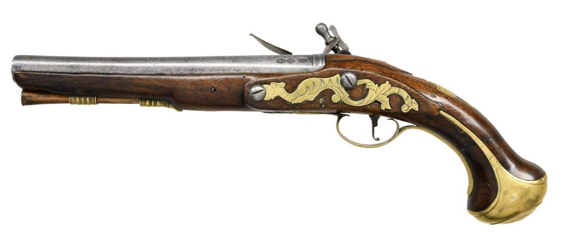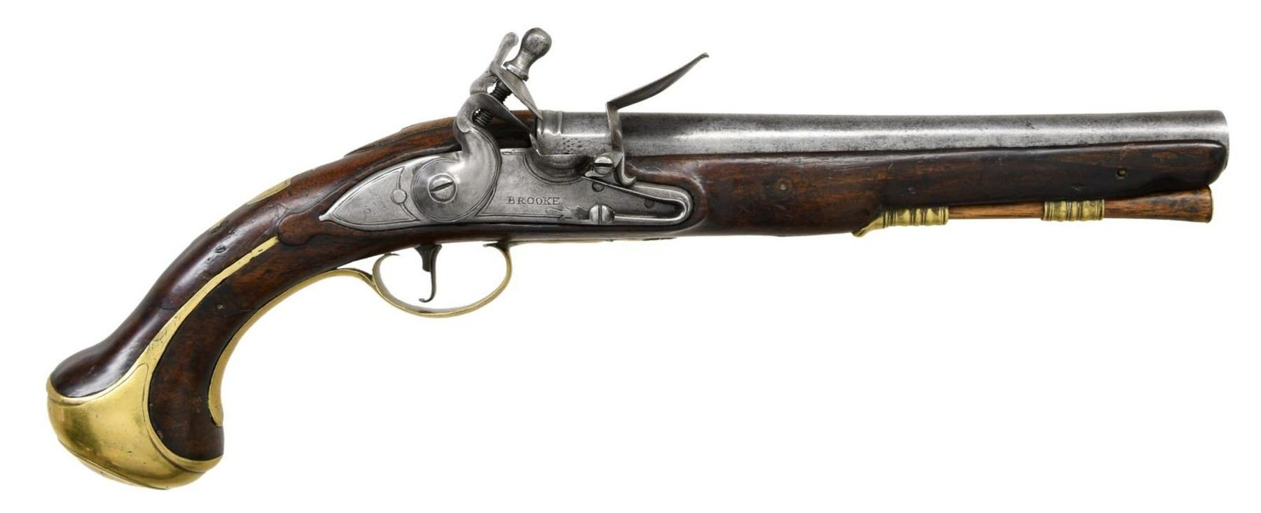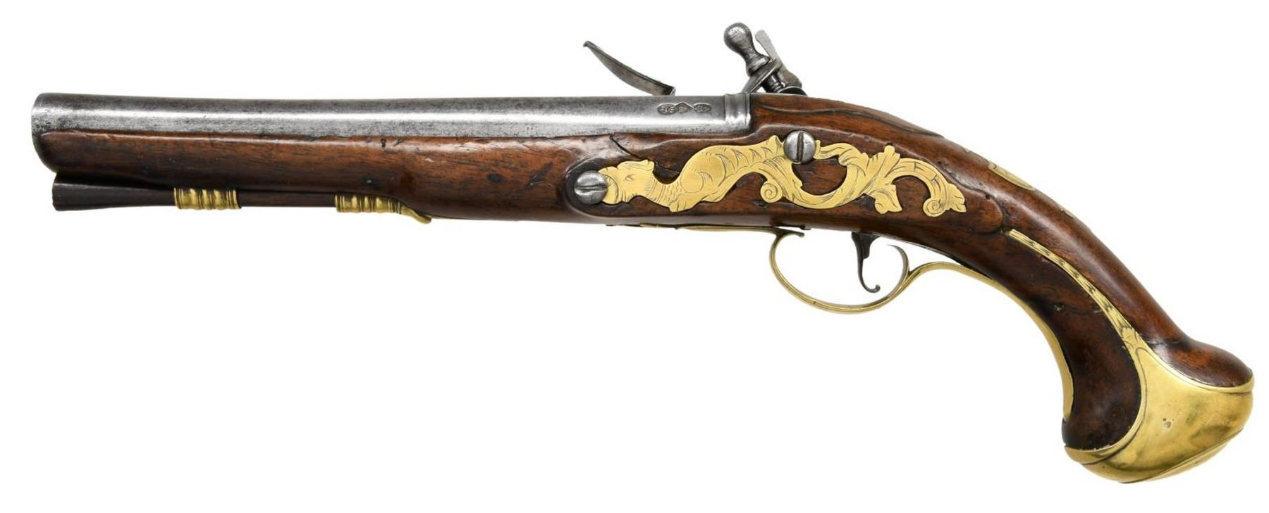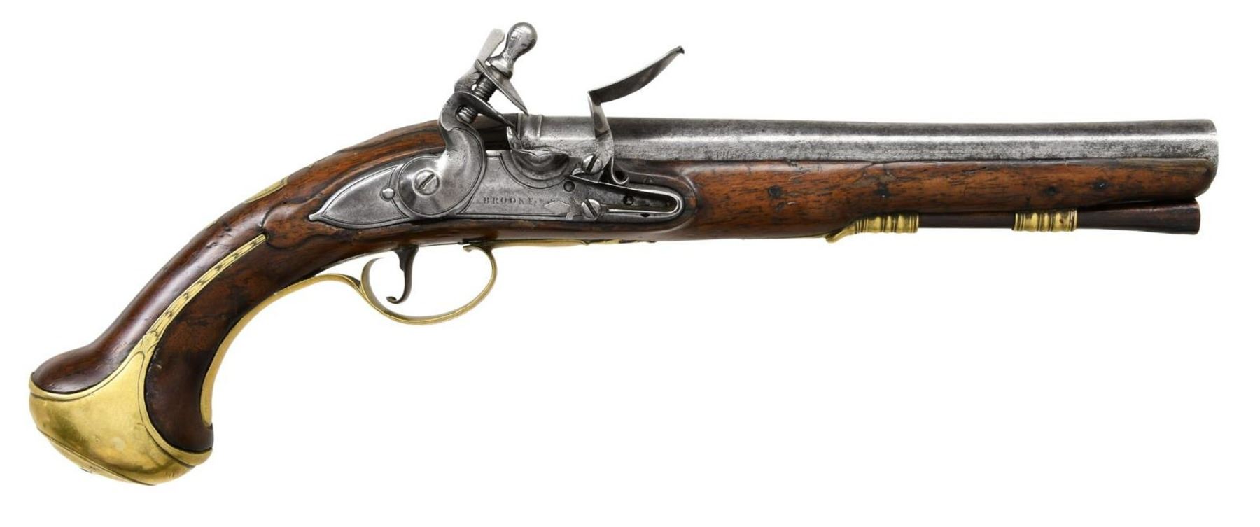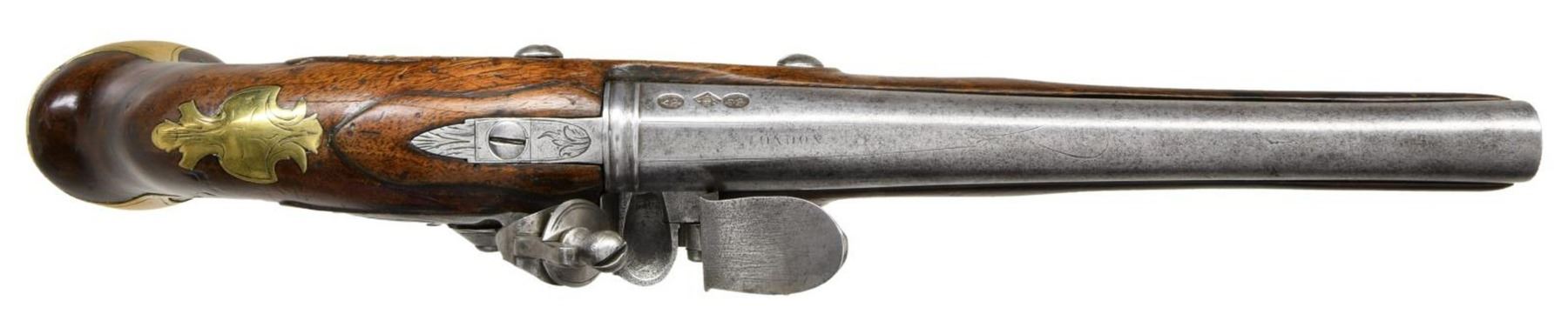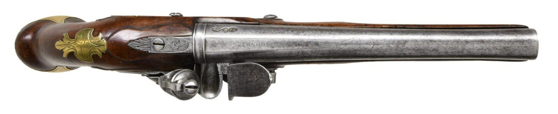 OFFICER OR HOLSTER PISTOLS BY BENJAMIN BROOKE. Cal. 60. S# NSN. The 8" iron barrels with military style turnings at rear, transition from octagon to round with flared muzzles. Top flats are engraved "LONDON". Round bodied arched locks with heavy serpentine cocks are fitted with integral rounded pans, unbridled friction frizzens and feather springs with fleu-de-lis finials. Locks have line border engraving and "BROOKE" is under pans (Benjamin Brooke working between 1718-1760). European walnut stocks extend to muzzles and are pinned to barrels. There are shaped beavertails around barrel tangs and mouldings around locks and sideplates. Pistols are brass mounted. Trigger guards have husk finials, heavy knobbed butt caps have side spurs, sideplates are pierced and in the form of sea monsters and foliate terminated crest plates at tops of grips are engraved with crosses. Furniture shows some line border and engraved detail with some floral highlights. Brass tipped ramrods are held by multi beaded single pipes and matching thimbles. CONDITION: good. Iron parts cleaned to silver gray. Stocks with most old finish show some added oil. Brass shows cleaning; is presently of golden hue. Bores are lightly pitted. Locks are operable. Stocks show some minor repairs of cracks in barrel channels and some repairs and added wood at muzzles. Both pistols with repaired cracks through butts; one with open crack at front of sideplate. (01-24068/MGM). ANTIQUE. $3,000-4,000.