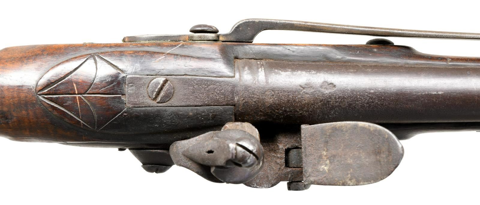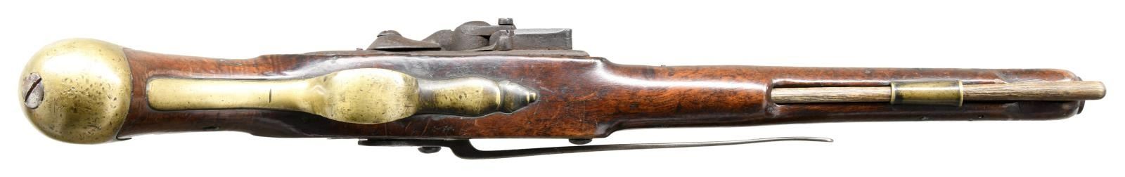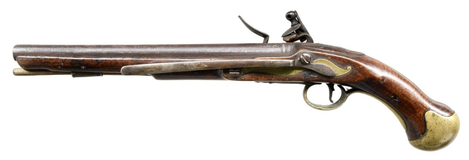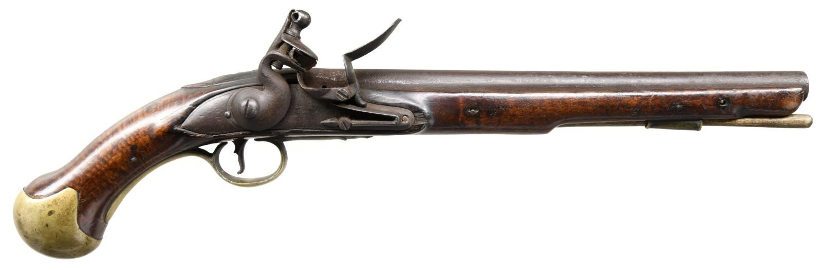 FLINTLOCK PISTOL. Cal. 56. NSN. 19" overall, original flintlock configuration, 12" barrel with military proofs on top near breech. Lock broad arrow proved, "GALTON / 17--" engraved on tail. (last numbers not discerned but should be 1760), unsupported serpentine cock, bridled frizzen, brass furniture, single ramrod pipe, flat sideplate. Walnut stock with indiscernible storekeeper's marks on right wrist. CONDITION: good to very good overall, appears complete and original with exception of replaced 8" steel belt hook & wood ramrod. Iron has dark patina, markings all very worn and only partially discernible. Stock sound with hand worn patina. Mechanically very good with smooth clear bore. (01-23470/JS). ANTIQUE. $2,000-3,000.
