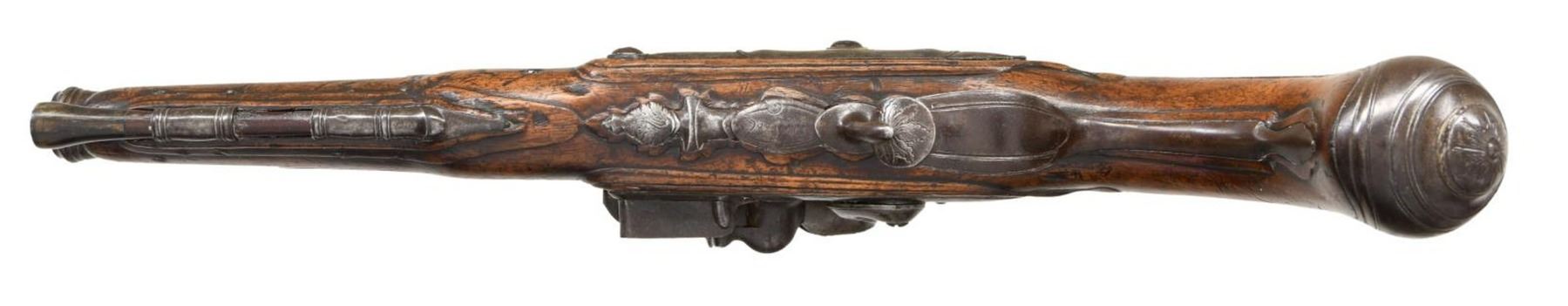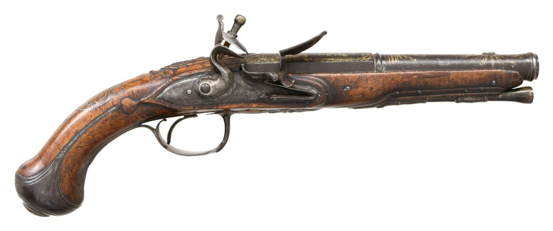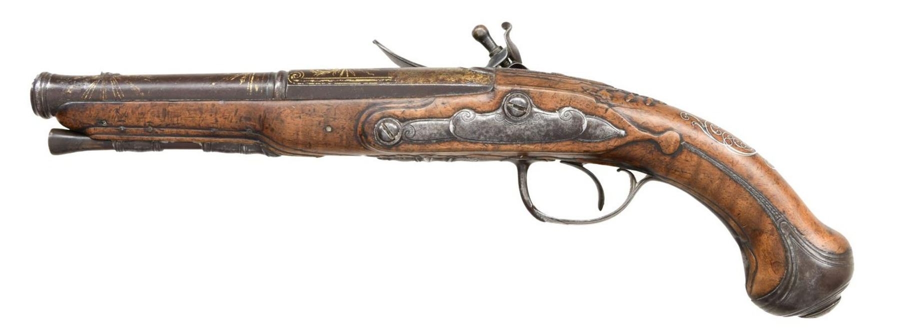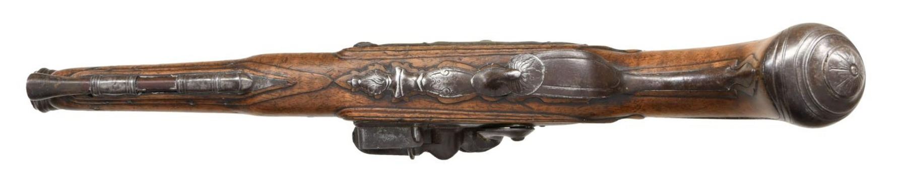 OFFICERS OR HOLSTER PISTOLS BY PENEL FRERES OF ST - ETIENNE. Cal. 55. S# NSN. The 7-1/2" cannon turned barrels have small Nock forms at rears and transition through wedding bands to flared muzzles. Barrels are decorated with gold damacening, barley corn front sights are silver. Locks with rounded bodies and serpentine cocks are fitted with integral rounded pans, bridled friction frizzens and feather springs with bulbious finials having teats. Locks are line border engraved and maker's name "Penel Freres" is under pans (Francois & Antoine working between 1746-60 known for their excellent quality). Stocks appear to be of fruitwood, extend to just behind cannon turned muzzles and are pinned to barrels. Stocks have oak leaf and acorn relief carving at rear of barrel tangs. Double beaded mouldings are around locks and sideplates with simple raised mouldings outlining trigger guards and ramrods. Furniture is of iron and is nicely relief filed. Knob grip caps have long side spurs. Trigger guards have vase and flame finials. Sideplates are of early style with rounded bodies reminisent of lockplates. There is fancy silver wire inlay at tops of grips. Greenheart ramrods with horn tips, one with steel worm tail, mount through multi beaded single pipes and matching thimbles. CONDITION: very good to fine, presenting uncleaned original metal surfaces which are mostly dark gray patina without any deep pitting. Most damascening remains on barrels. Stock of one gun shows cleaning, while the other remains uncleaned and shows fine hand worn patina. This pistol has some minor cracks in barrel channel on right side and some fairly deep denting on left, otherwise stocks of both pistols are sound. Bores are pitted, locks are good, there are no noted replacement or restored parts. (01-24069/MGM). ANTIQUE. $3,500-4,500.