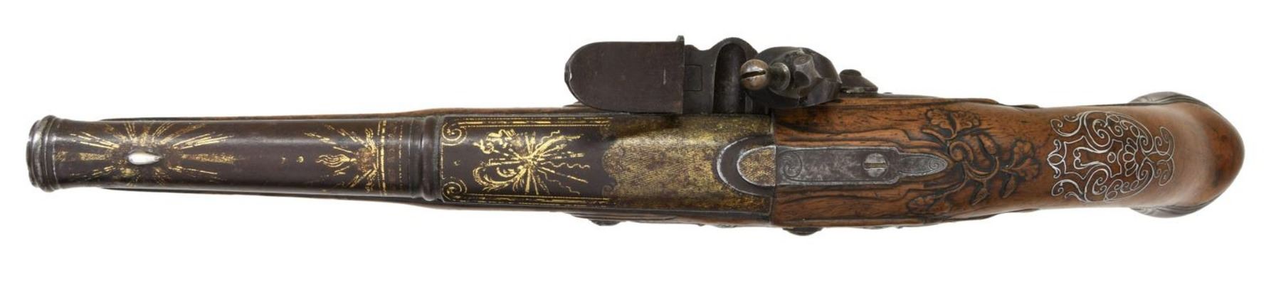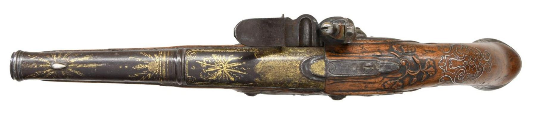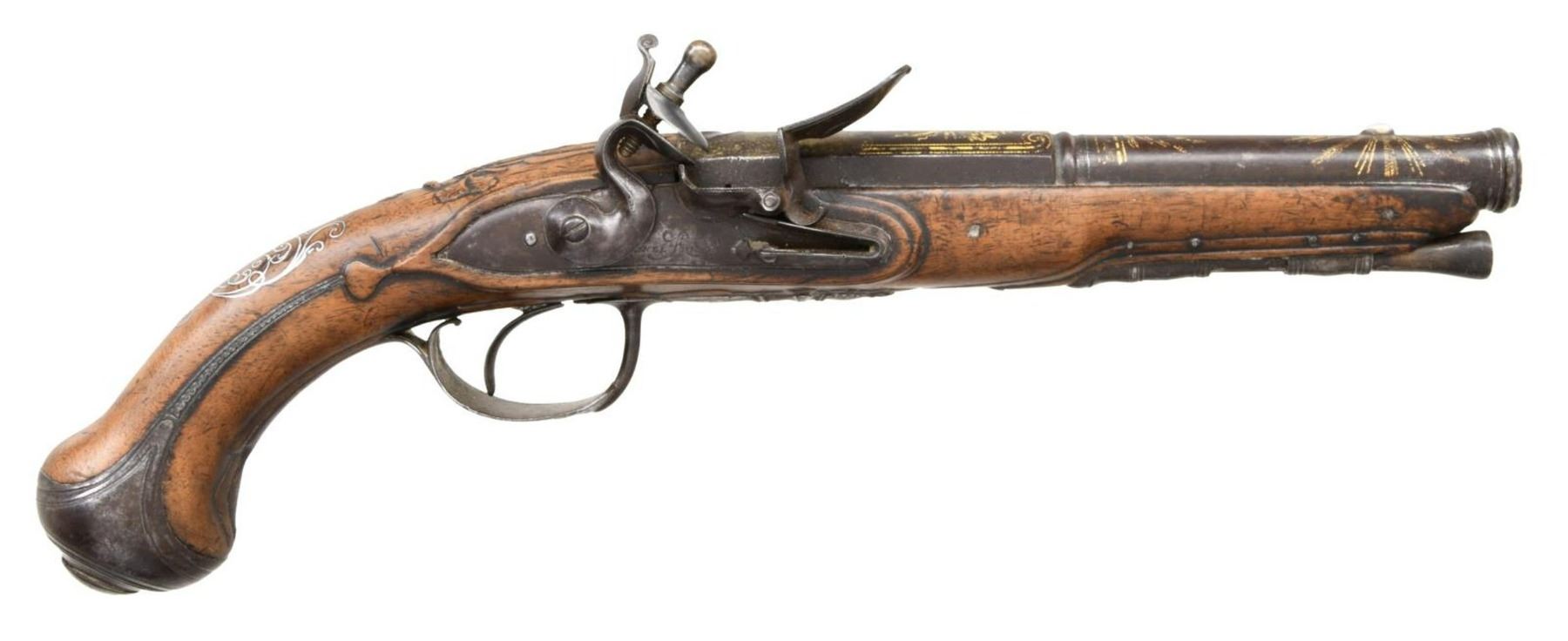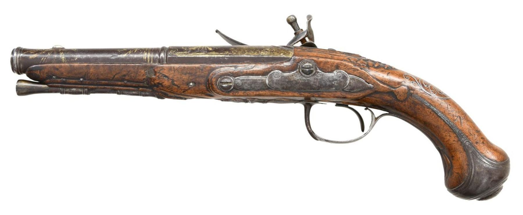 OFFICERS OR HOLSTER PISTOLS BY PENEL FRERES OF ST - ETIENNE. Cal. 55. S# NSN. The 7-1/2" cannon turned barrels have small Nock forms at rears and transition through wedding bands to flared muzzles. Barrels are decorated with gold damacening, barley corn front sights are silver. Locks with rounded bodies and serpentine cocks are fitted with integral rounded pans, bridled friction frizzens and feather springs with bulbious finials having teats. Locks are line border engraved and maker's name "Penel Freres" is under pans (Francois & Antoine working between 1746-60 known for their excellent quality). Stocks appear to be of fruitwood, extend to just behind cannon turned muzzles and are pinned to barrels. Stocks have oak leaf and acorn relief carving at rear of barrel tangs. Double beaded mouldings are around locks and sideplates with simple raised mouldings outlining trigger guards and ramrods. Furniture is of iron and is nicely relief filed. Knob grip caps have long side spurs. Trigger guards have vase and flame finials. Sideplates are of early style with rounded bodies reminisent of lockplates. There is fancy silver wire inlay at tops of grips. Greenheart ramrods with horn tips, one with steel worm tail, mount through multi beaded single pipes and matching thimbles. CONDITION: very good to fine, presenting uncleaned original metal surfaces which are mostly dark gray patina without any deep pitting. Most damascening remains on barrels. Stock of one gun shows cleaning, while the other remains uncleaned and shows fine hand worn patina. This pistol has some minor cracks in barrel channel on right side and some fairly deep denting on left, otherwise stocks of both pistols are sound. Bores are pitted, locks are good, there are no noted replacement or restored parts. (01-24069/MGM). ANTIQUE. $3,500-4,500.