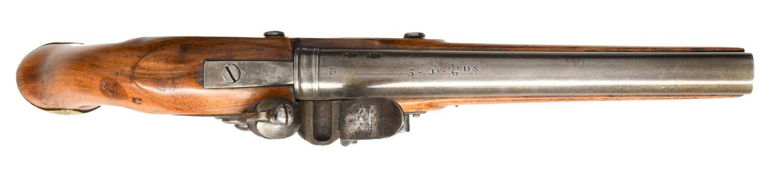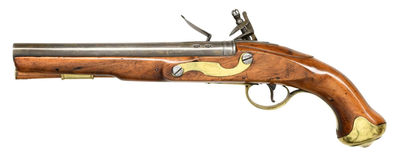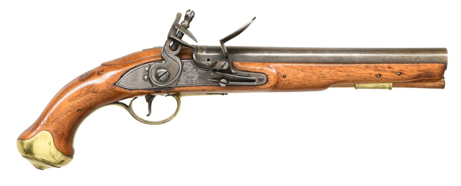 Cal. 65. NSN. Bbl. 9" rnd. Pistol is devoid of sights. Lock is not dated. Center of lock marked w/ crown over "GR". Top of bbl. marked "5-D-GNS" for the 5th Dragoons. Rear top of bbl. has crown proof. Left rear of bbl. has two British proofs. Walnut stock w/ brass furniture. Left side of stock has faint inspection stamp. Wrist has "C" & 1786 date stamps. Hickory ramrod present. CONDITION: refinished stock w/ added varnish, a couple cracks near front end, scattered dings & handling wear. Brass was cleaned brightly & shows scattered oxidation w/ some dings. Balance of metal is a light gray patina w/ scattered oxidation & pitting. Oxidized bore. PROVENANCE: From the Lifelong Collection of Glen E. Mattox. (01-22579/MJC). ANTIQUE. $1500-2000.