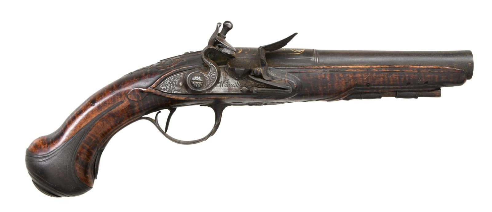 INLAY. Cal. 62. NSN. Bbl. 6 3/8". Stepped round barrel with a very slight bell at the muzzle. The top of the barrel is inlaid with gold foliate decoration along with foliate etching. The barrel tang has similar engraving. The lock is marked under the cock "Marscille" and behind the cock is etched with flourishes and a military drum. The hammer has foliate engraving and the iron pan is faceted. Iron trigger guard, buttcap, and side plate all have coordinated foliate engraving. The ramrod thimble & entry thimble are both iron. Wood appears to be tiger maple or a similar highly figured wood. There is elaborate carving behind the barrel tang and around the trigger guard. CONDITION: barrel has a dark patina with some visible wear to the gold inlay. Lock has a medium gray patina and does not hold cock. Iron furniture all have a dark, early patina. Ramrod appears original. Fair bore. (01-24101/BF). ANTIQUE. $900-1,300.