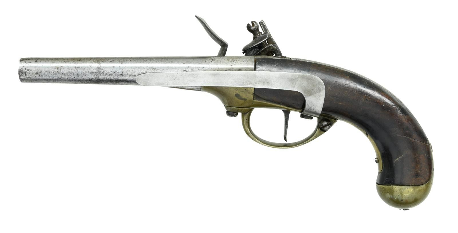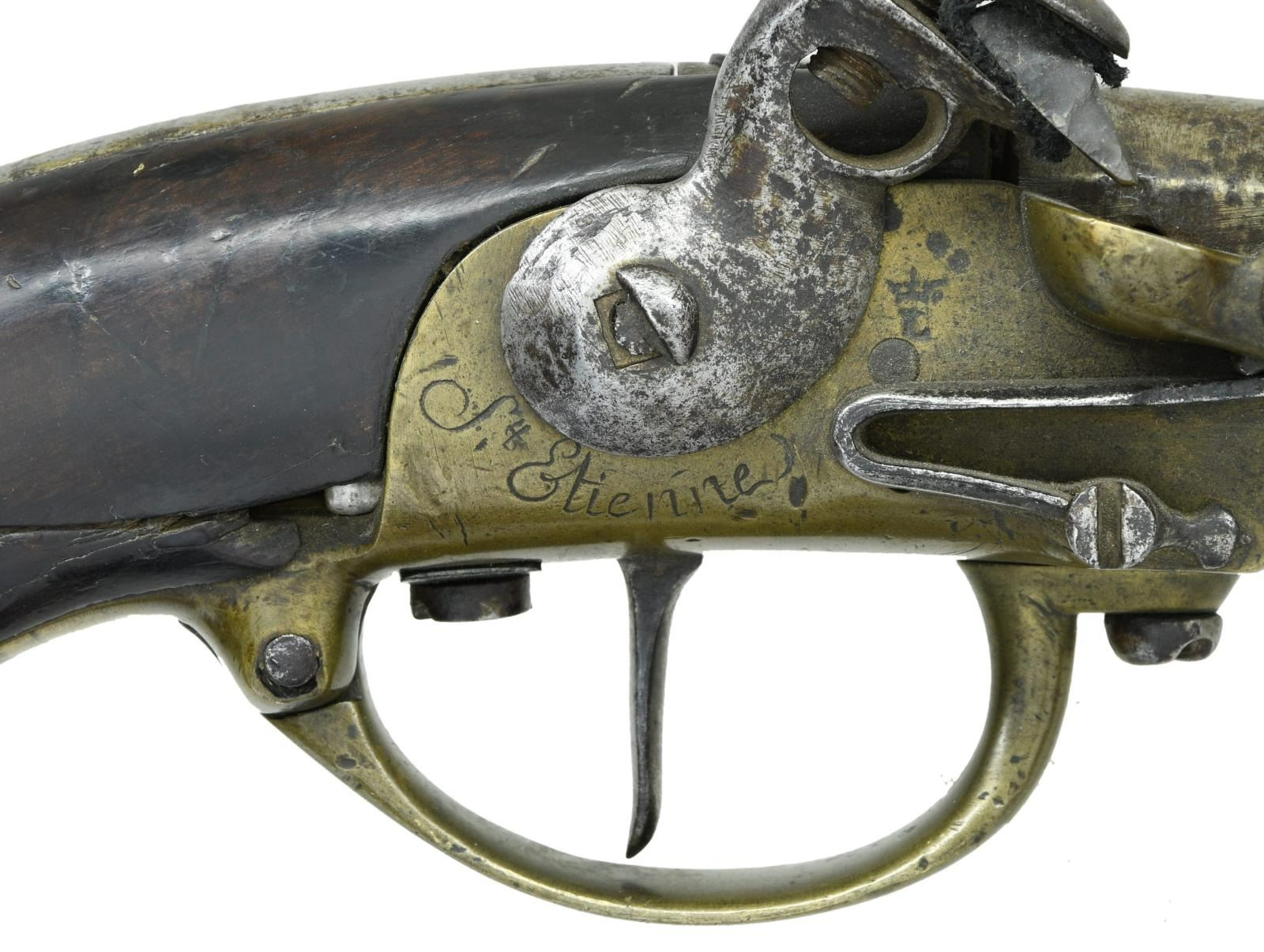Cal. 70. NSN. Bbl. 7 1/4". Lock has crown "L" & St. Etienne markings. Bbl. marking is illegible. Brass front strap, trigger guard & frame. Belt clip present on left side. Bottom half of hammer screw missing. Trumpet tipped ramrod. Walnut stock. CONDITION: stock shows a notable chip on right side, a few large cracks, scattered smaller chips, dings & handling wear. Bbl. & backstrap appear cleaned long ago but are turning to a gray patina w/ scattered oxidation & pitting. Brass parts are a dull yellow patina w/ scattered oxidation & dings. Oxidized bore. (01-23645/MJC). ANTIQUE. $1000-1500.
