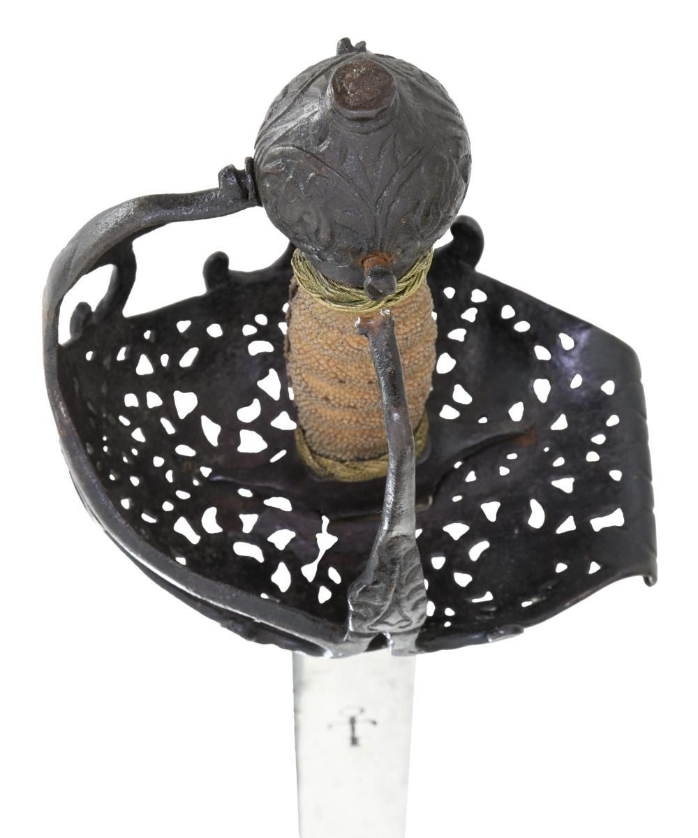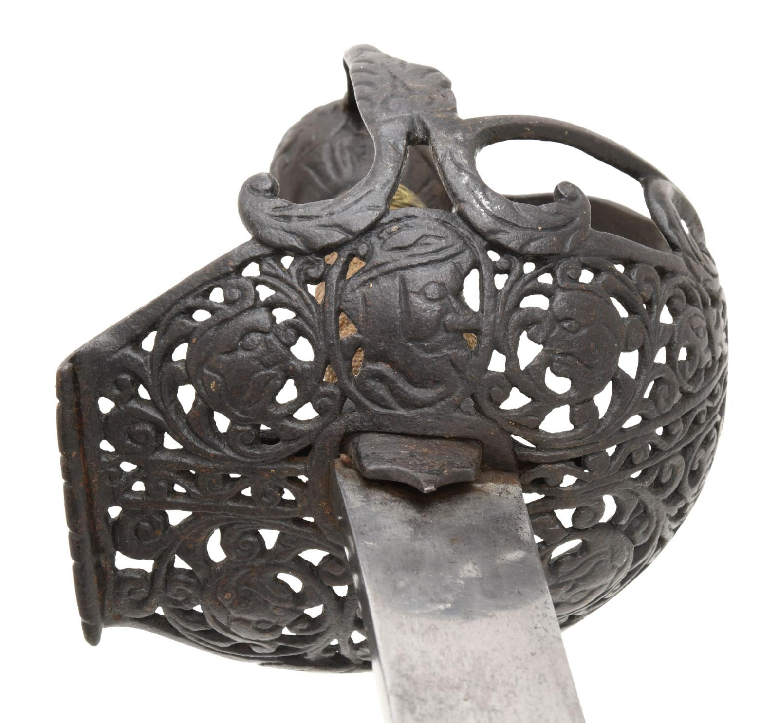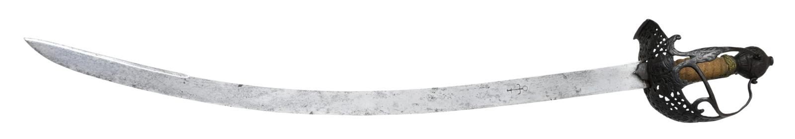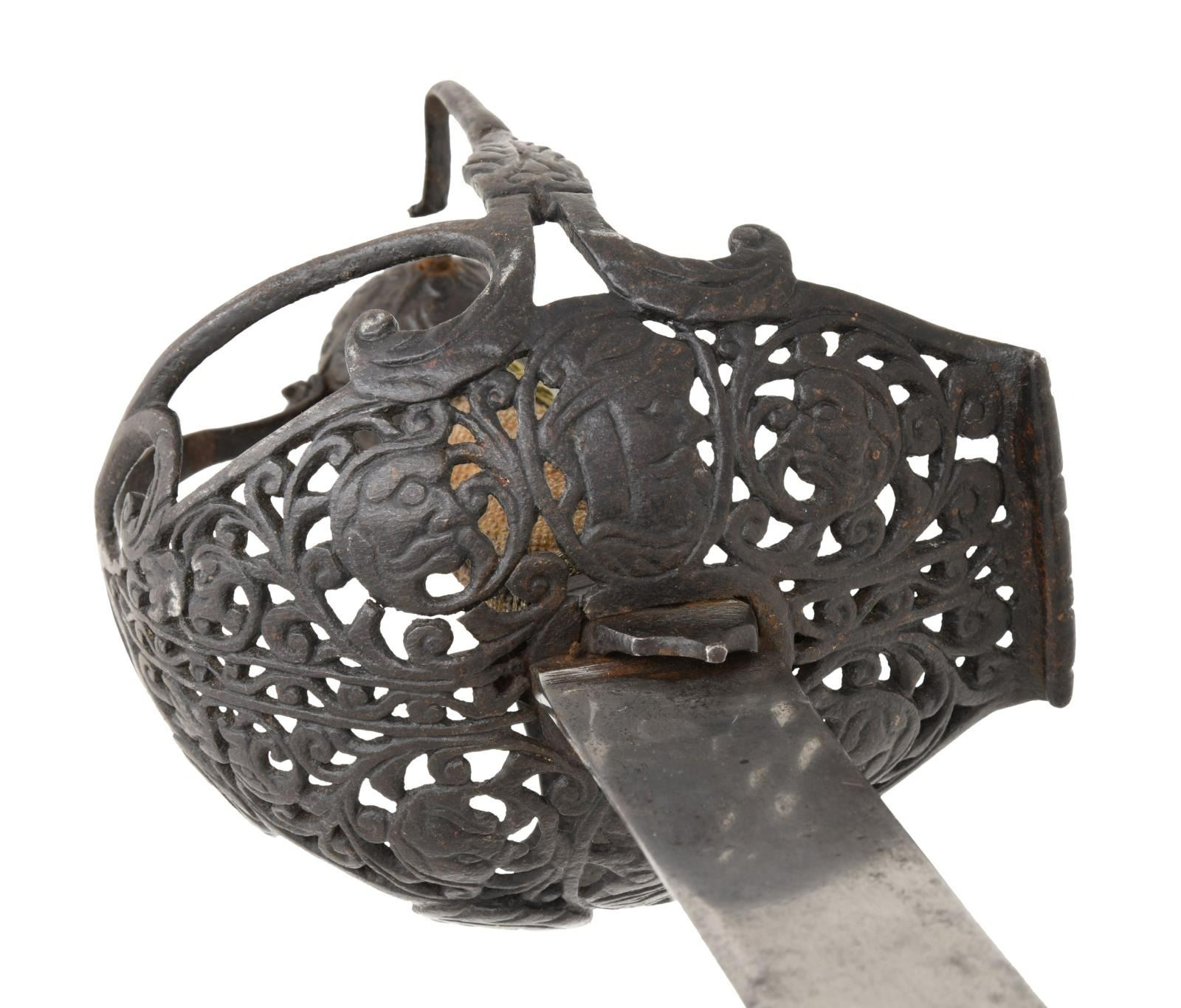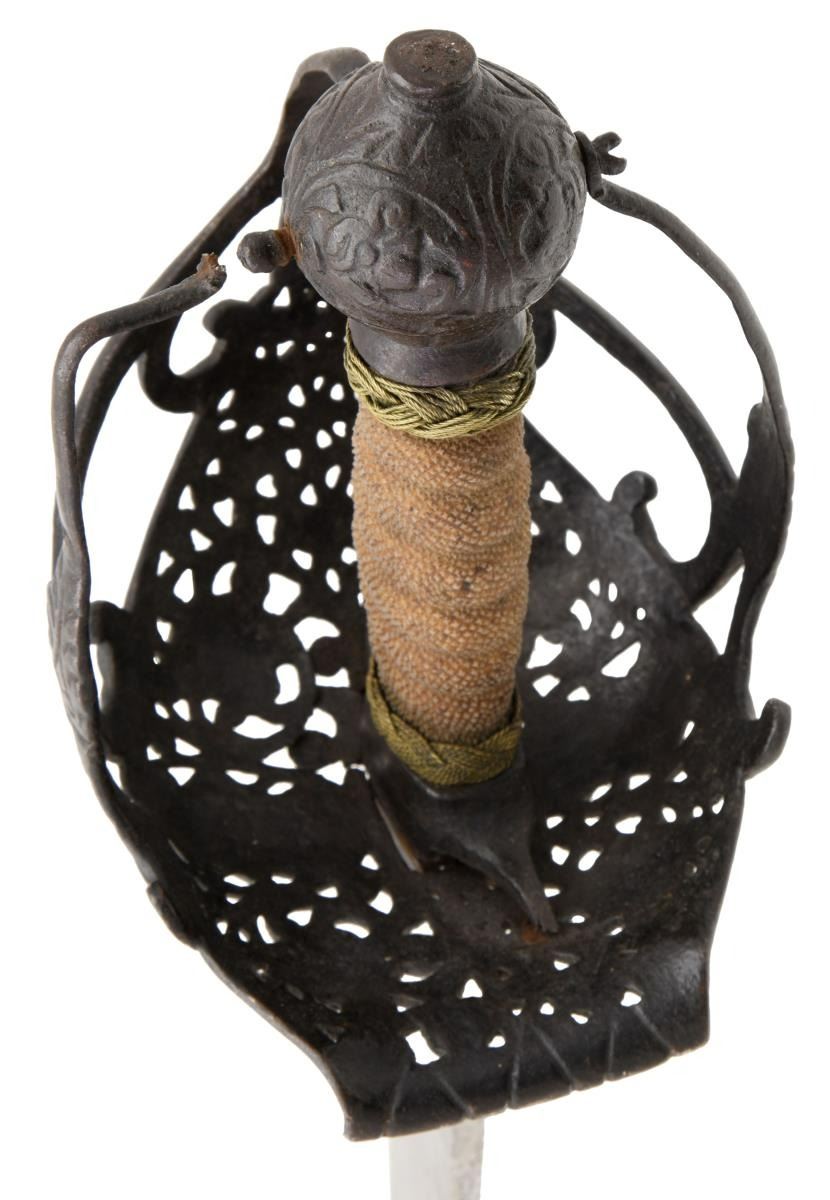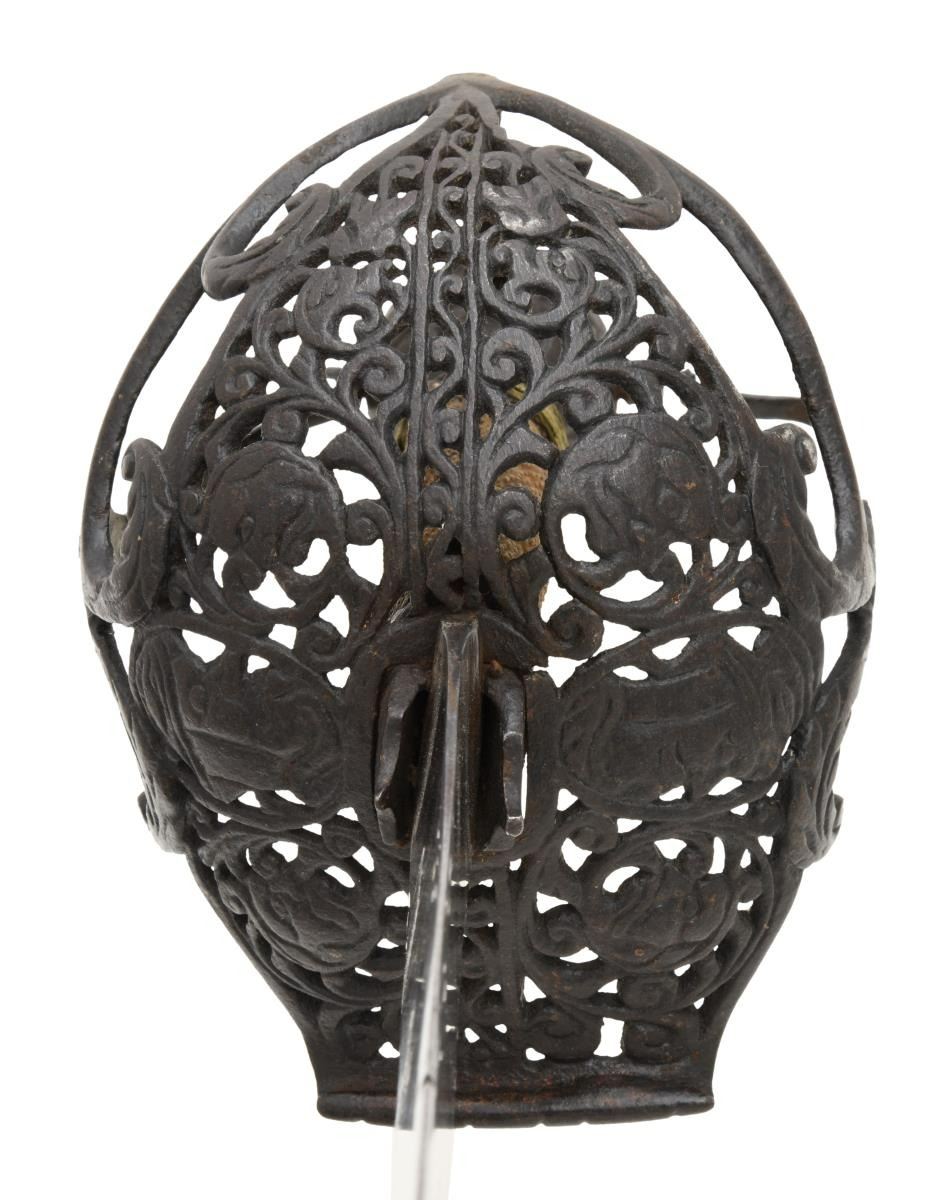 This extraordinary saber has a mortuary hilt that dates to the mid-17th century during the Cromwell period in England. However, the curved blade dates to the mid to late 18th century. This elaborate mortuary hilted sword likely belonged to a wealthy British family around 1640-50 and was re-hilted with a more modern blade in keeping with military fashion during the late 18th century. The sword itself measures 37 1/4" overall with a 30 3/4" blade. The plain, flat blade has a 9" false edge and is heavily stamped on each side with the armorer's mark of John Allen, who worked during the 18th century in the armory at the Tower of London. The spectacular iron hilt has an intricately pierced semi-basket style guard featuring 3 faces on each side of the hilt. There are 3 primary branches and 4 secondary branches that form the semi-basket hilt. The pommel is decorated and loosely separated into quadrants. The grip, if not original, is certainly quite early and appears to be sharkskin with brass wire Turk's head knot ferrules above & below. No scabbard. CONDITION: blade is in exceptional condition with a light gray finish and only a few scattered nicks to the edge. The hilt has a dark, ancient patina, but shows no notable damage. The grip is quite solid with no losses. (02-19867/BF). $8,000-12,000.