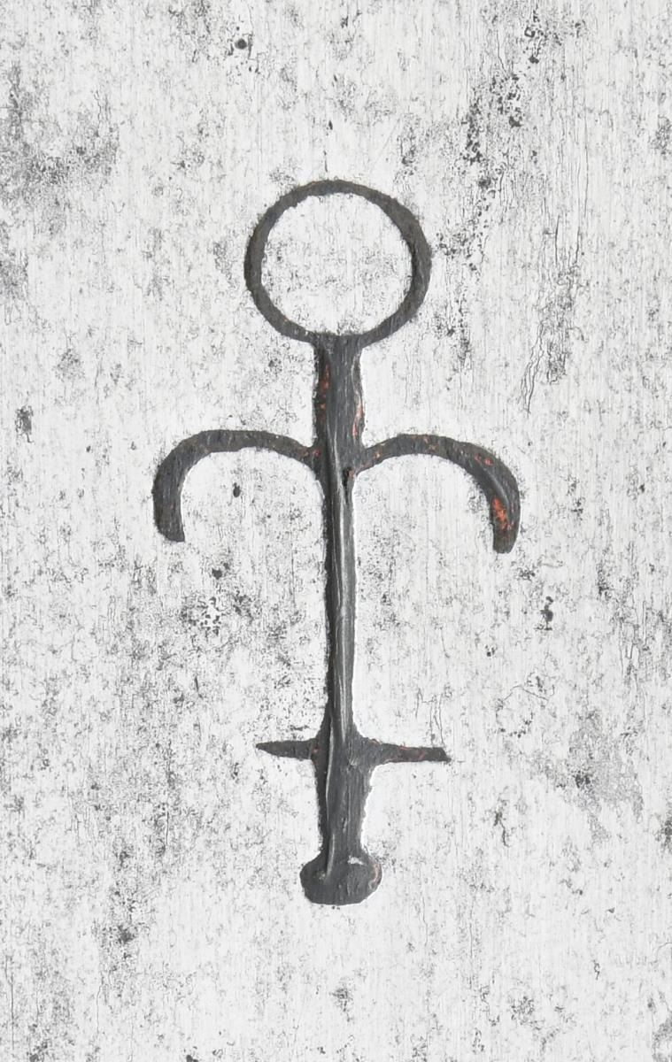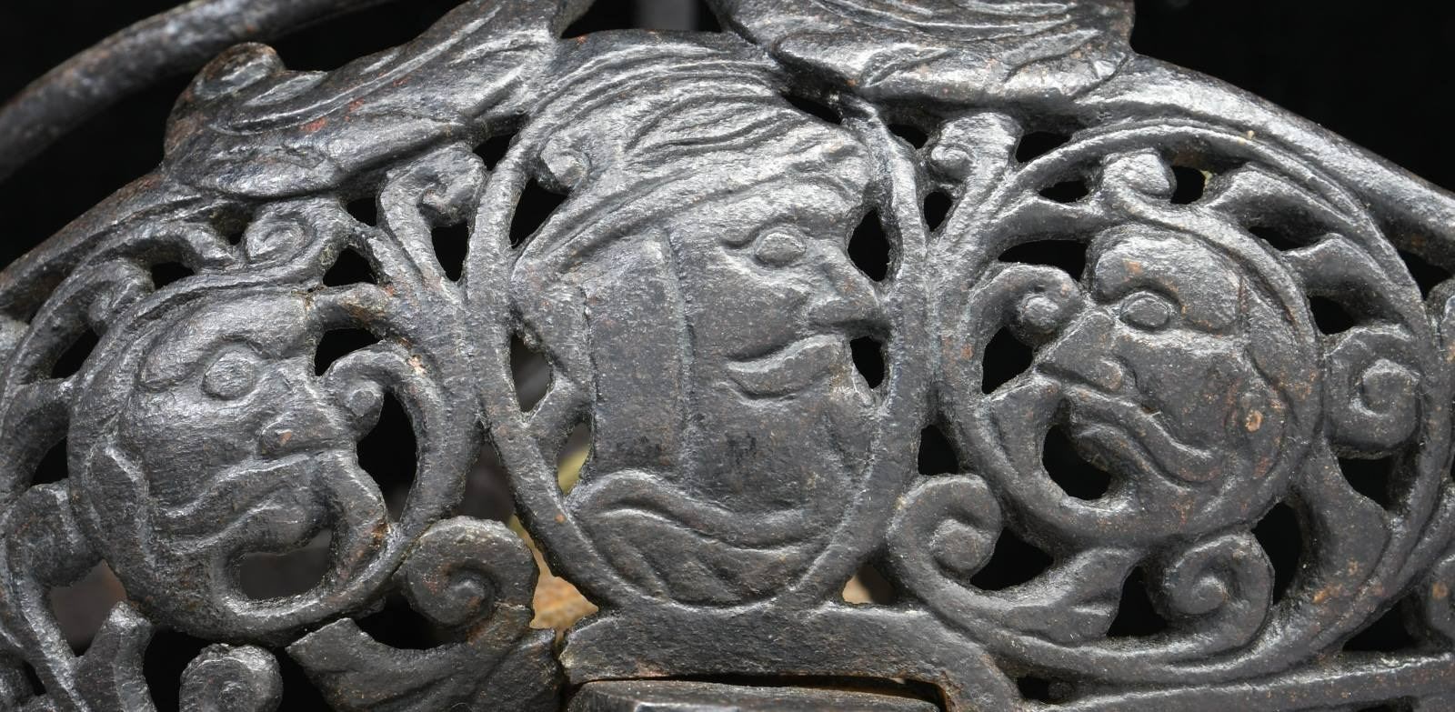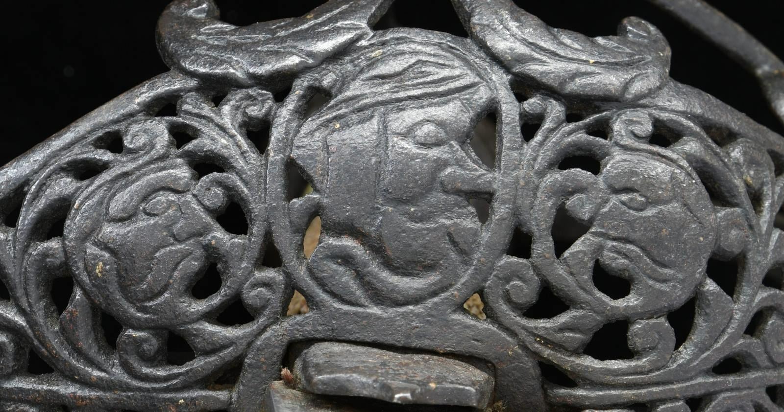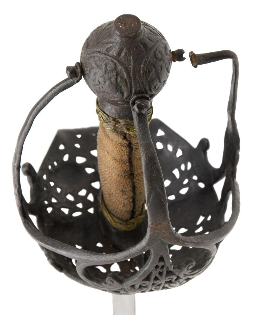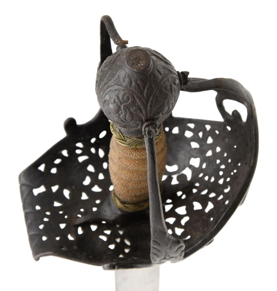 This extraordinary saber has a mortuary hilt that dates to the mid-17th century during the Cromwell period in England. However, the curved blade dates to the mid to late 18th century. This elaborate mortuary hilted sword likely belonged to a wealthy British family around 1640-50 and was re-hilted with a more modern blade in keeping with military fashion during the late 18th century. The sword itself measures 37 1/4" overall with a 30 3/4" blade. The plain, flat blade has a 9" false edge and is heavily stamped on each side with the armorer's mark of John Allen, who worked during the 18th century in the armory at the Tower of London. The spectacular iron hilt has an intricately pierced semi-basket style guard featuring 3 faces on each side of the hilt. There are 3 primary branches and 4 secondary branches that form the semi-basket hilt. The pommel is decorated and loosely separated into quadrants. The grip, if not original, is certainly quite early and appears to be sharkskin with brass wire Turk's head knot ferrules above & below. No scabbard. CONDITION: blade is in exceptional condition with a light gray finish and only a few scattered nicks to the edge. The hilt has a dark, ancient patina, but shows no notable damage. The grip is quite solid with no losses. (02-19867/BF). $8,000-12,000.
