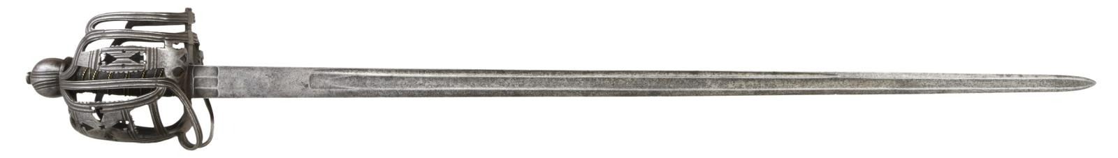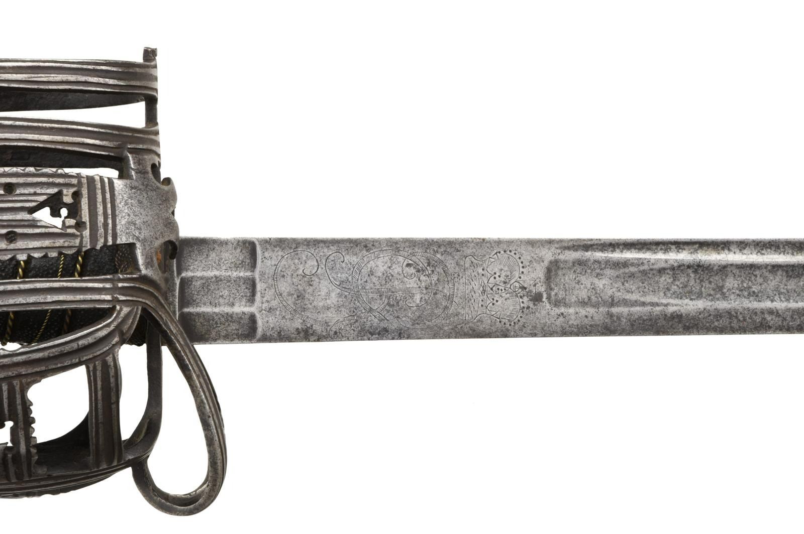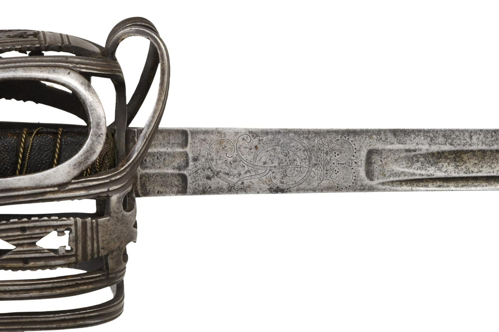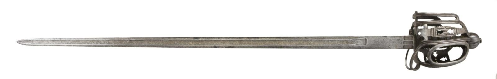 OFFICER'S BASKET HILT BACKSWORD. Overall length: 46 1/2". Blade length: 39 1/4". This is an absolute brute of a backsword weighing nearly 4 1/3 pounds. There is a very similar sword pictured on page 148 of "Swords & Blades of the American Revolution" by Newman. The long, straight backsword blade initially features 3 flutes at the ricasso measuring 1" in length and about 7/16" in width. Across the flutes on one side is etched the date "1755". Just above the flutes is the name "S*HARVEY". Above the maker's name is a large 3" engraved crown over "GR". Above the crown is a 34" medium fuller topped by a 22" narrow fuller. The broad grooved bars & arrowhead cutouts predominate the style of this exceptional officer's iron hilted backsword. The influence of Scotland's Glasgow School can be seen throughout the hilt. The rounded ovoid pommel emulates the channel decoration, as seen on the guard, and features a thick capstan. The sharkskin grip & wire wrap are quite early and may even be original to the sword. A woven Turk's head knot ferrule terminates the top & bottom of the grip. Of course, no scabbard. CONDITION: blade has a medium gray, mottled patina with no serious pitting. All etching/engraving remains clear. The hilt is quite strong with no breaks; however, the tiny quillon is missing, likely lopped off by an opposing sword. The grip is complete, though there is a separation at the seam from drying. Wire is a bit displaced but complete. This is a truly exceptional example of a rarely seen mid-18th century officer's backsword. (02-20043/BF). $8,000-12,000.