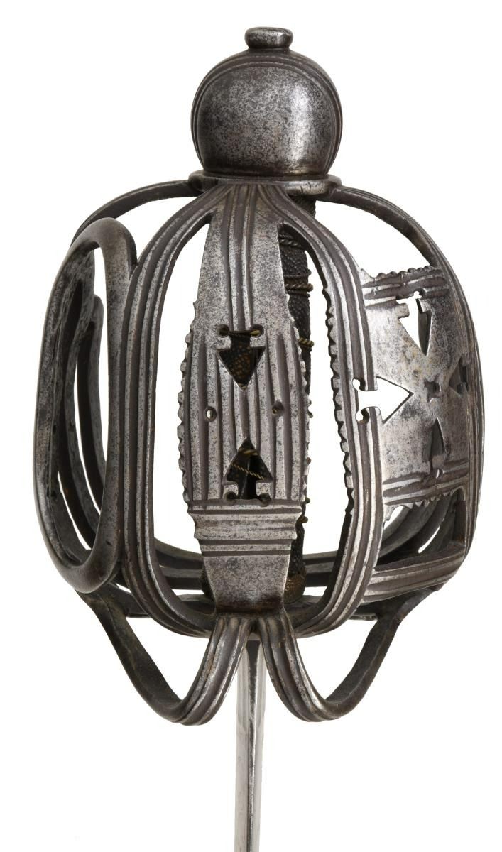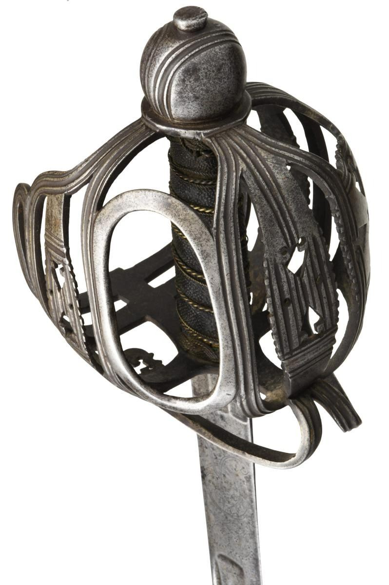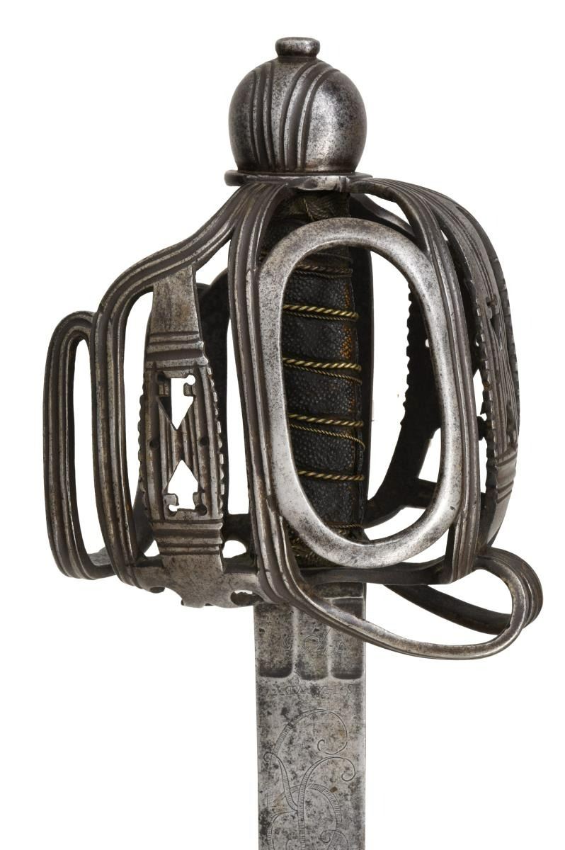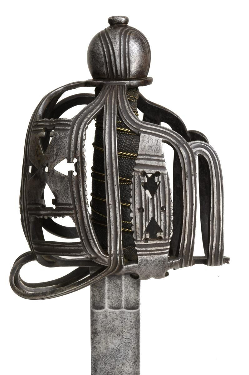 OFFICER'S BASKET HILT BACKSWORD. Overall length: 46 1/2". Blade length: 39 1/4". This is an absolute brute of a backsword weighing nearly 4 1/3 pounds. There is a very similar sword pictured on page 148 of "Swords & Blades of the American Revolution" by Newman. The long, straight backsword blade initially features 3 flutes at the ricasso measuring 1" in length and about 7/16" in width. Across the flutes on one side is etched the date "1755". Just above the flutes is the name "S*HARVEY". Above the maker's name is a large 3" engraved crown over "GR". Above the crown is a 34" medium fuller topped by a 22" narrow fuller. The broad grooved bars & arrowhead cutouts predominate the style of this exceptional officer's iron hilted backsword. The influence of Scotland's Glasgow School can be seen throughout the hilt. The rounded ovoid pommel emulates the channel decoration, as seen on the guard, and features a thick capstan. The sharkskin grip & wire wrap are quite early and may even be original to the sword. A woven Turk's head knot ferrule terminates the top & bottom of the grip. Of course, no scabbard. CONDITION: blade has a medium gray, mottled patina with no serious pitting. All etching/engraving remains clear. The hilt is quite strong with no breaks; however, the tiny quillon is missing, likely lopped off by an opposing sword. The grip is complete, though there is a separation at the seam from drying. Wire is a bit displaced but complete. This is a truly exceptional example of a rarely seen mid-18th century officer's backsword. (02-20043/BF). $8,000-12,000.