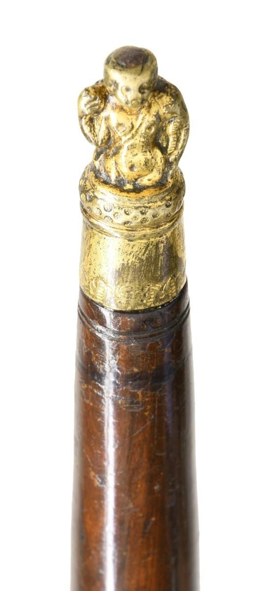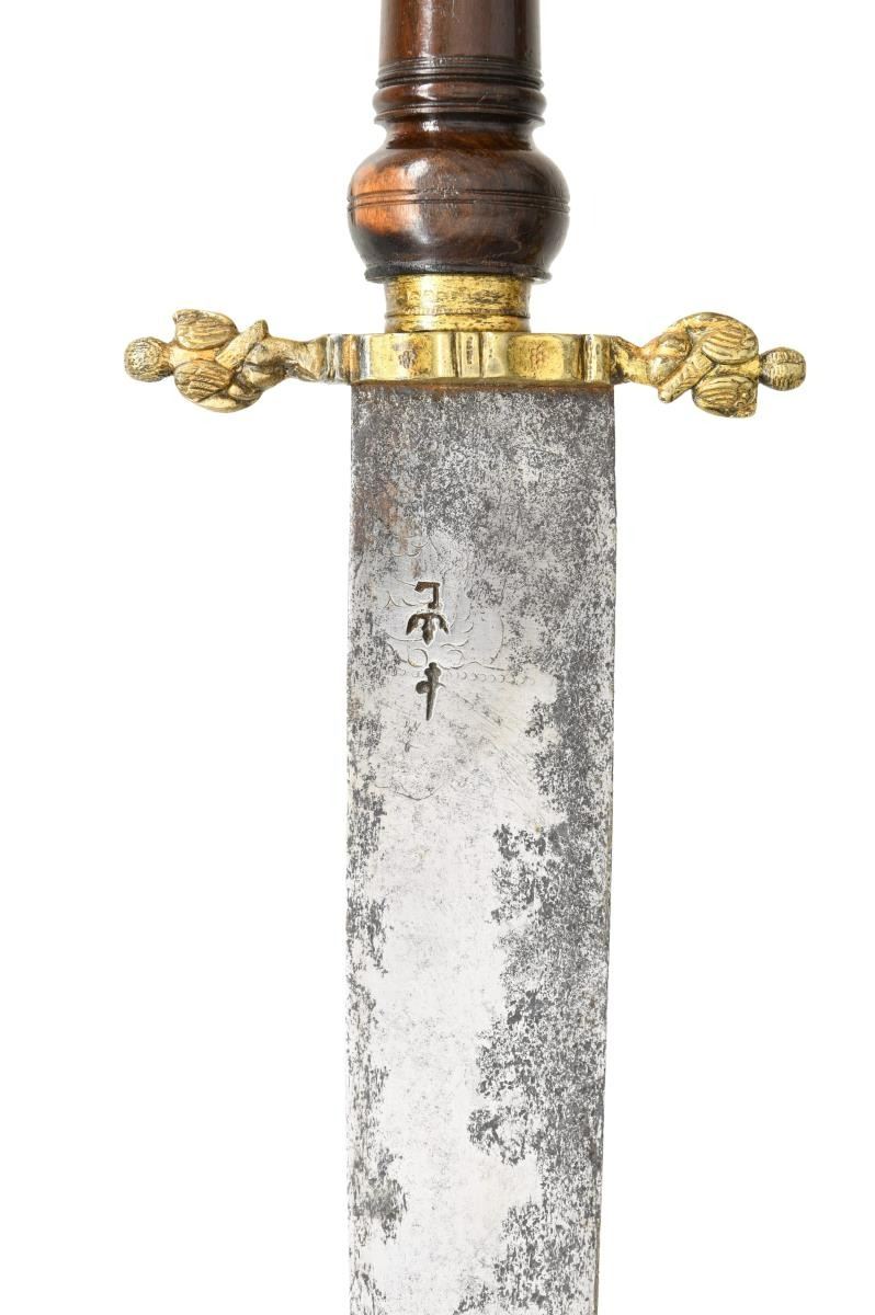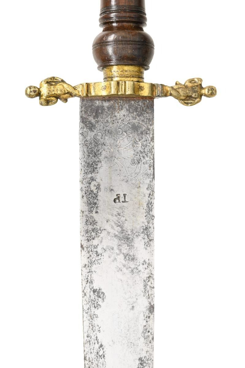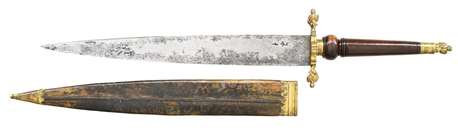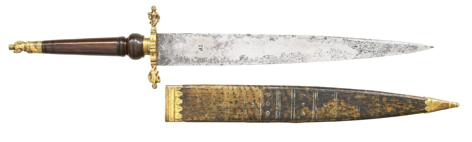 BAYONET WITH SCABBARD. Overall length: 18 3/4". Blade length: 12 1/2". Flat blade with a 5 3/4" false edge. There is engraved foliate decoration extending 1 1/2" up from the hilt. One side of the blade is deeply stamped "TP" and the other side of the blade has a crowned "L" with what appears to be a dagger above. Gilded brass guard has human effigies for both quillons. The pommel cap is a similar human effigy. Turned wood grip is tapered with a bulbous base. The scabbard appears to have the original throat & tip, but the leather body appears to be a museum restoration done by a skilled craftsman. CONDITION: blade has a light gray patina with areas of cleaning pitting. Marks are quite strong. Hilt is undamaged with the majority of gold plating remaining on the cross guard & pommel. Scabbard has significant gilding on the throat as well as the tip. (02-19598/BF). $4,000-5,500.