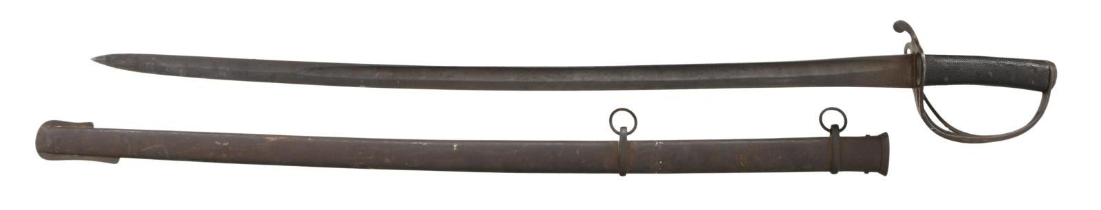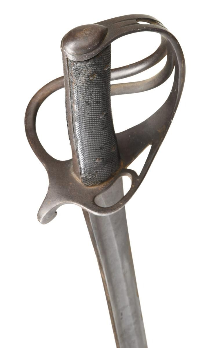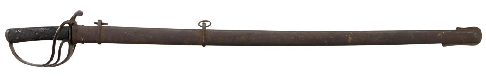 & CO. This classic P1853 cavalry saber measures 42" overall with a 34 1/2" blade. The plain blade has a single medium sized fuller and is stamped on the spine "ISAAC & CO". British P1853 sabers, like this one, were extensively imported by the Confederacy during the Civil War. Many were supplied by Isaac & Co of London and are so marked. Other variants are unmarked but may have also been supplied by Isaac & Co. Iron hilt with plain 2-branch guard and downturned quillon. Plain iron knuckle bow & simple teardrop shaped iron pommel cap. 2-Piece pressed leather grip with 5 rivets on each side. Iron scabbard. CONDITION: blade has a dark patina but shows no evidence of pitting. Hilt has a dark overall patina. Grips show moderate wear but remain 95% complete. Iron scabbard has a dark finish with no notable dents to the body. (02-20030/BF). $2,400-2,800.
