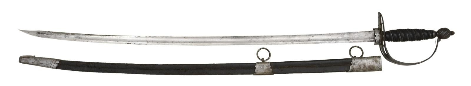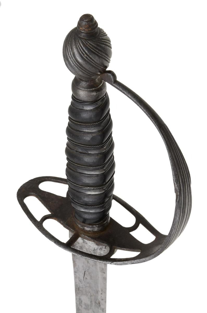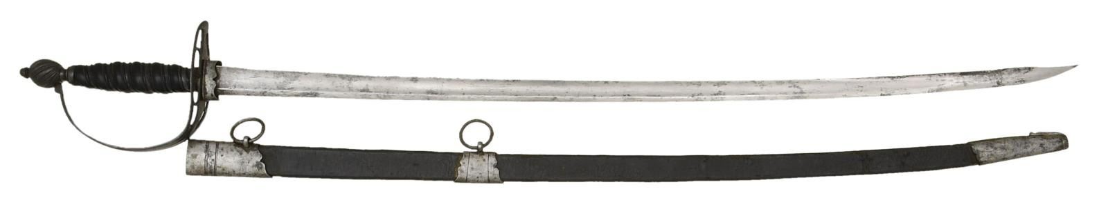 Overall length: 36 5/8". Blade length: 30 1/4". The slightly swept plain blade has a single medium fuller. There is a ferrule at the ricasso to receive the throat of the scabbard. Steel hilt with an 8-slot guard and a linearly decorated knuckle bow. The melon-shaped pommel has spiral gadrooning and is topped by a capstan. The grip appears to be ebony with a silver wire alternating with tape wrap. Ferrules are plain. Black leather scabbard with iron mounts. CONDITION: blade has a light gray patina with scattered areas of staining. Hilt has a pleasing dark patina. Grip shows minor chips but remains nearly completely intact. Wire & tape are 100%. Scabbard is flexed with some flaking but remains completely intact. Mounts have a medium gray patina. (02-20086/BF). $1,400-2,200.