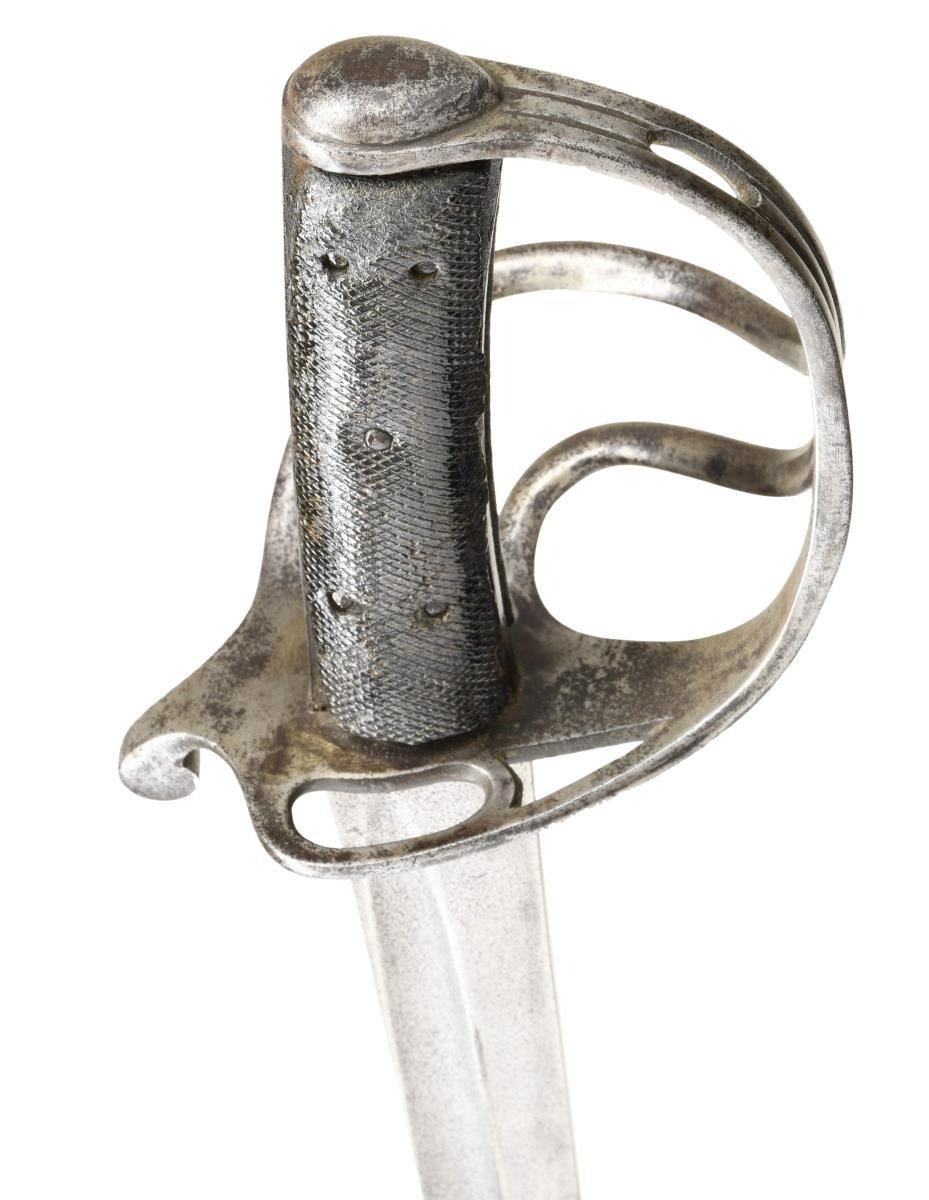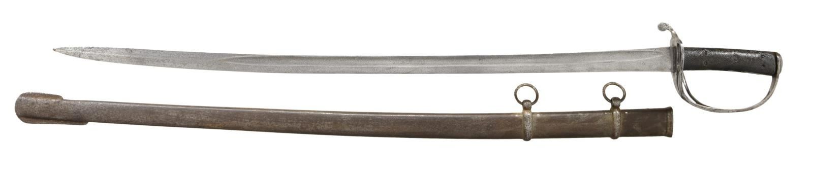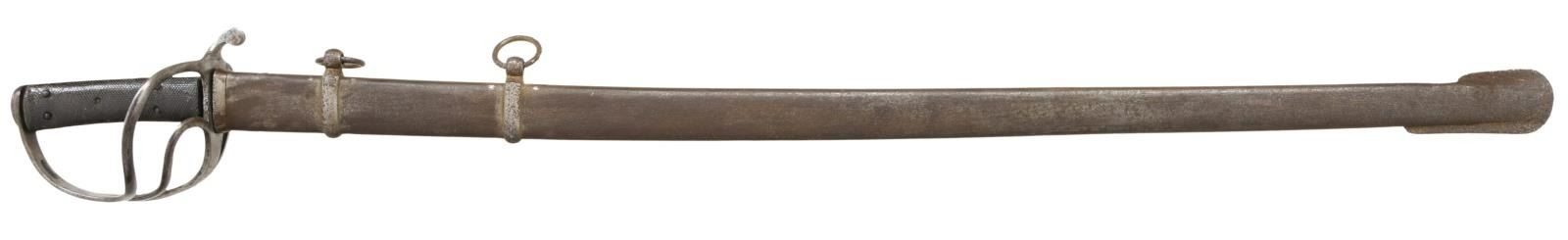 & CO. This classic P1853 cavalry saber measures 43" overall with a 34 1/2" blade. The plain blade has a single medium sized fuller and is stamped on the spine "ISAAC & CO". British P1853 sabers, like this one, were extensively imported by the Confederacy during the Civil War. Many were supplied by Isaac & Co of London and are so marked. Other variants are unmarked but may have also been supplied by Isaac & Co. Iron hilt with plain 2-branch guard and downturned quillon. Plain iron knuckle bow & simple teardrop shaped iron pommel cap. 2-Piece pressed leather grip with 5 rivets on each side. Iron scabbard appears to be for an import M1840 saber. It is possible the original scabbard was lost during the war and the trooper found this ready replacement. CONDITION: blade has a cleaned light gray patina with a peppery finish. Hilt has a lightly cleaned gray patina overall. Grips show some wear but are 99% complete. Scabbard has a dark gray/brown patina with pitting particularly near the tip. Although not the original scabbard, the fit is quite good. (02-20036/BF). $1,400-1,800.