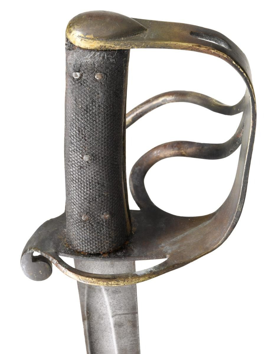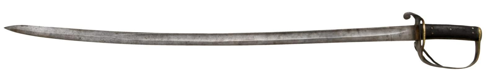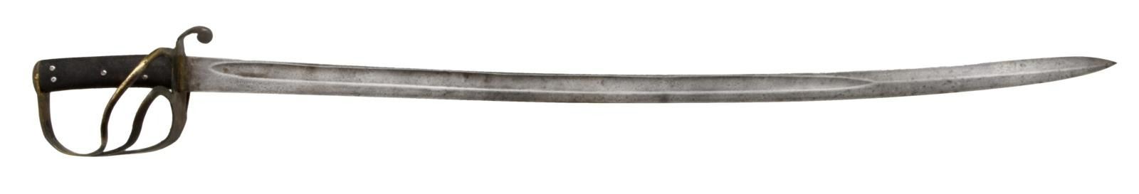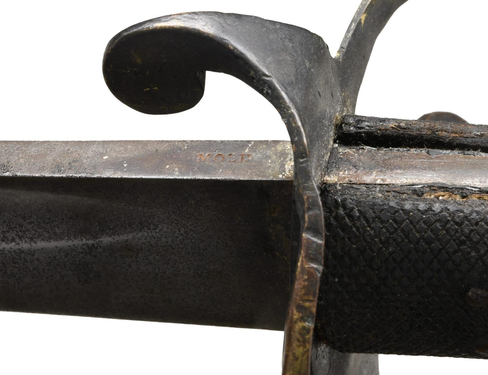 SABER. This fine P1853 cavalry saber measures 41" overall with a 35 1/4" blade. The plain blade has a single medium fuller and is plainly stamped "MOLE" on the spine. British P1853 sabers, similar to this one, were extensively imported by the Confederacy during the Civil War. Many were supplied by Isaac & Co of London and are so marked. Other variants, including brass hilted varieties that are generally marked "MOLE" on the spine, may have also been supplied by Isaac & Co. Brass hilt with plain 2-branch guard and downturned quillon. Plain brass knuckle bow & simple teardrop shaped brass pommel cap. 2-Piece pressed leather grip with 5 rivets on each side. No scabbard. CONDITION: blade has a medium gray patina with no nicks or pitting. Hilt has a dark mustard patina. Grips show light wear and remain 98% complete. (02-20048/BF). $800-1,400.