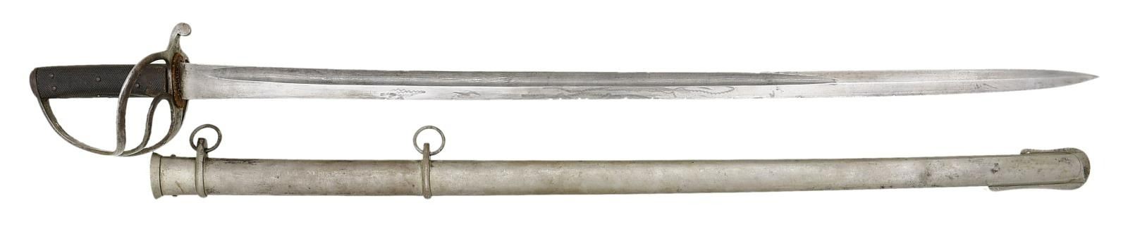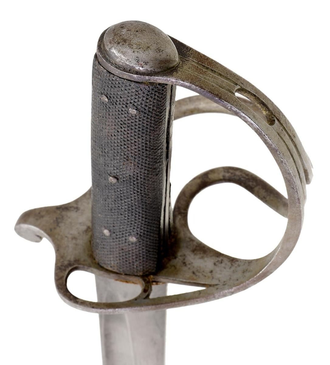 This classic P1853 cavalry saber measures 42 1/4" overall with a 34 3/4" blade. The plain blade has a single medium sized fuller and has no stamping on the spine. British P1853 sabers, like this one, were extensively imported by the Confederacy during the Civil War. Many were supplied by Isaac & Co of London and are so marked. Other variants are unmarked but may have also been supplied by Isaac & Co. Iron hilt with plain 2-branch guard and downturned quillon. Plain iron knuckle bow & simple teardrop shaped iron pommel cap. 2-Piece pressed leather grip with 5 rivets on each side. Iron scabbard. CONDITION: blade has a light gray patina with several nicks to the edge. Hilt has a medium gray patina. Grips show light wear and remain 99% complete. Iron scabbard has a medium gray finish overall with no dents to the body. (02-20045/BF). $800-1,200.