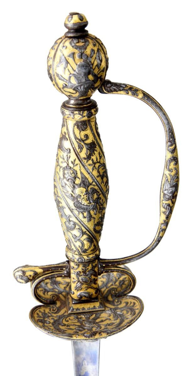 This fine quality 18th century French smallsword dates from the reign of Louis XVI who took the French throne in 1774. Overall length: 35 1/4". Blade length: 28 3/4". The trilobate blade has gold highlighted etching on a blued field over the first 9" of the blade. Etching includes military & foliate motifs. There is a small ribbon near the hilt that reads "S A F". The artistically rendered iron hilt is highlighted with gold leaf & gold inlays throughout. The bottom of the double kidney guard has superb scrollwork with foliate motifs along with a stand of arms on each side of the blade. The top of the guard has similar decoration with a smaller stand of arms on each side. Tall pas d'ane with a downturned pendulous quillon. The knuckle bow again repeats the decoration as seen on the guard, and the nearly spherical pommel also mirrors the style of decoration. The superbly embellished grip features scrollwork & arms in a spiral format. No scabbard. CONDITION: the blade shows very light wear with over 90% of the gold highlights & blued field intact. The hilt is quite tight and extremely visually attractive with a rich patina on the iron that contrasts stunningly with the bright gold. (02-19596/BF). $1,200-1,800.
